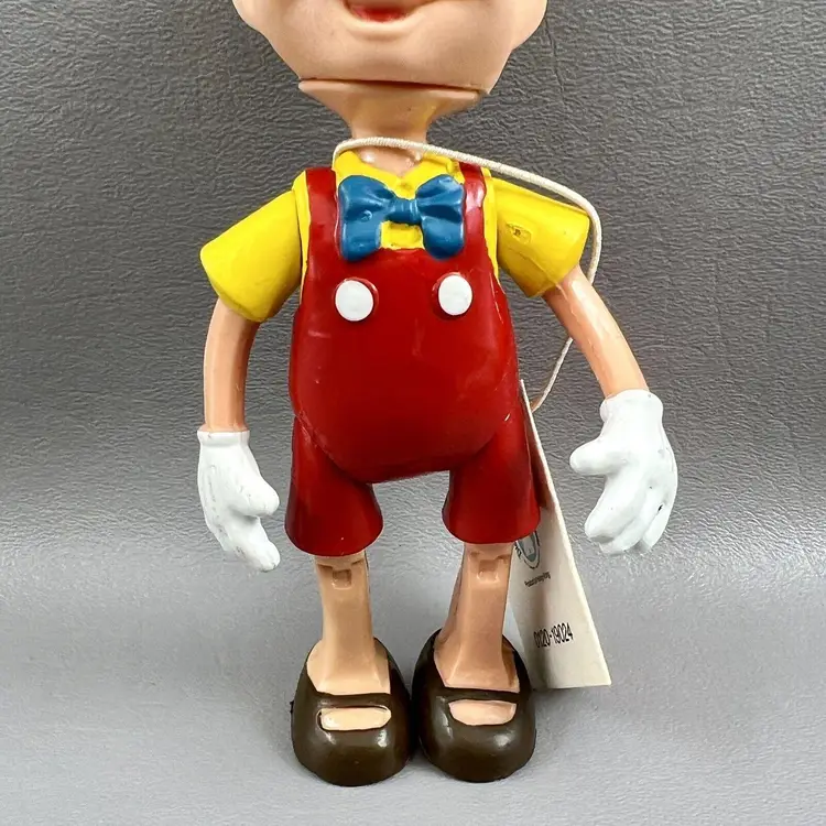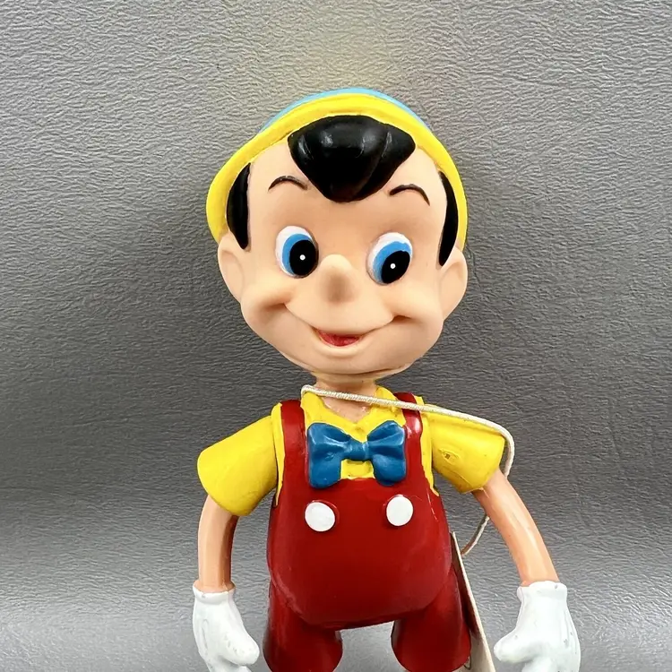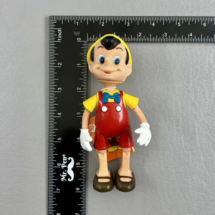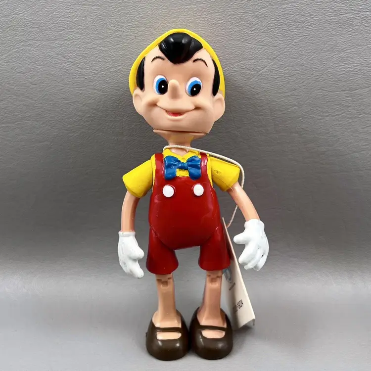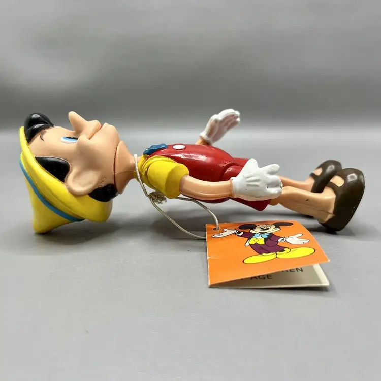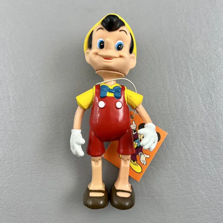 Add this vintage Walt Disney Productions Pinocchio articulated figure to your Disneyana collection. Standing at 5.5 inches tall, this Hong Kong made figure captures all the charm and whimsy of the beloved character. With intricate articulation, this Pinocchio figure is perfect for display or play. Don't miss out on the chance to own a piece of Disney history.