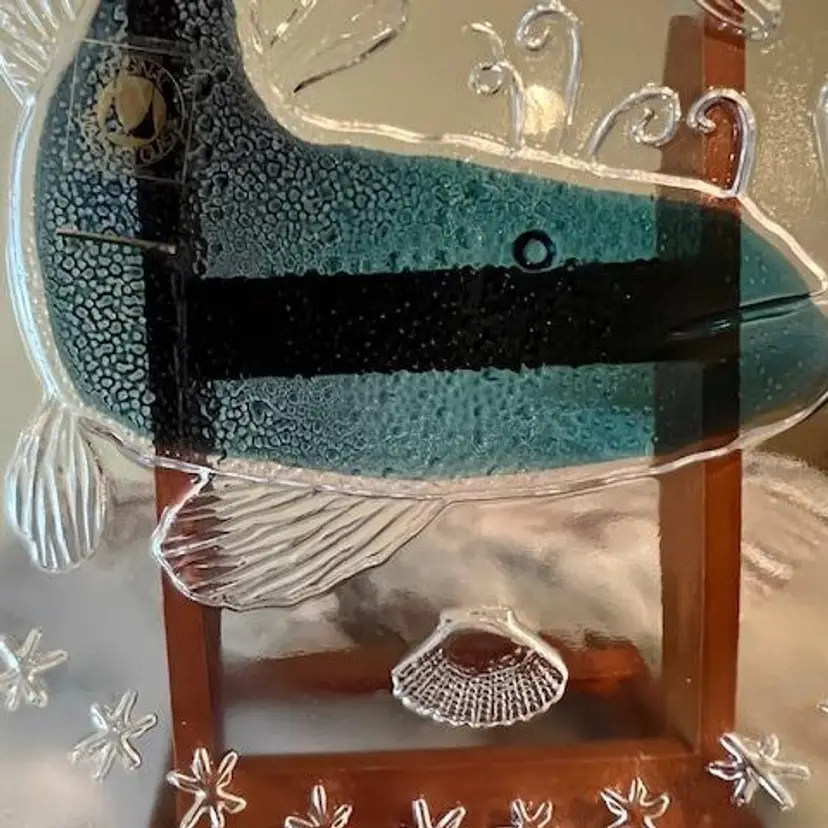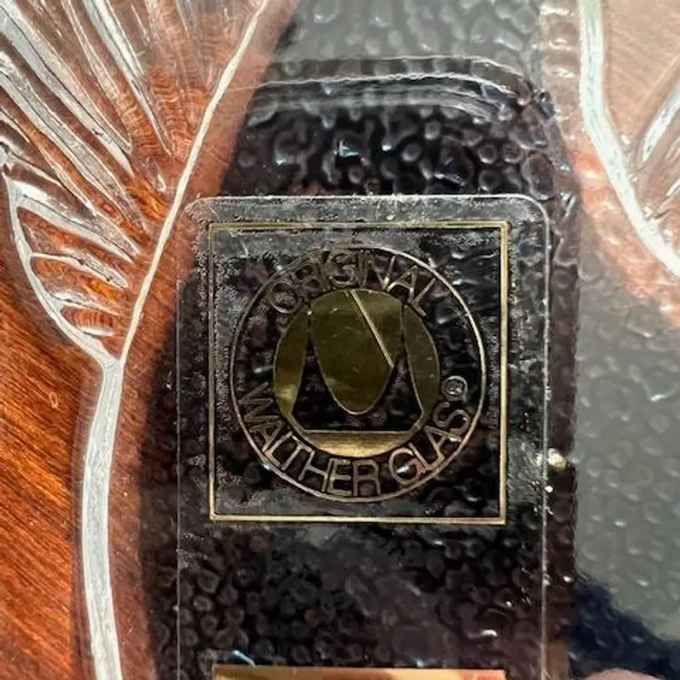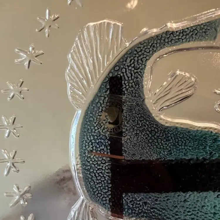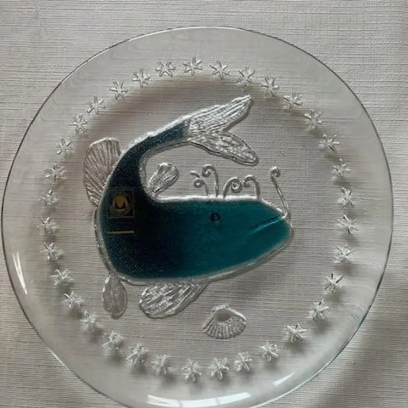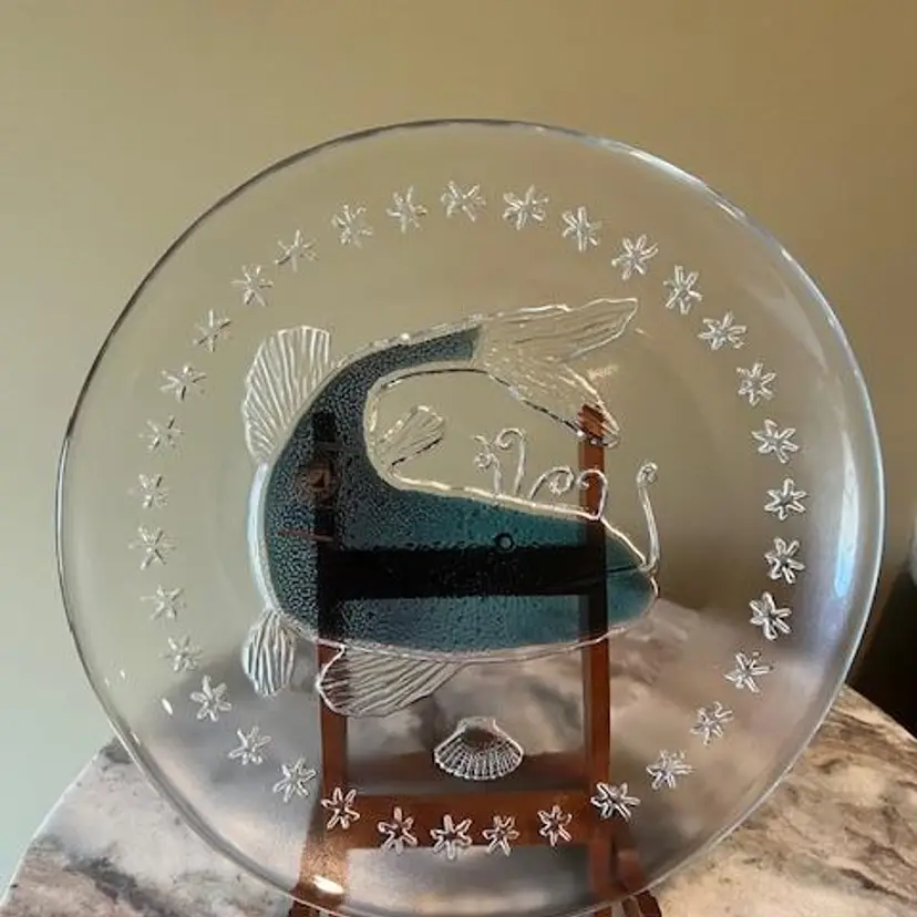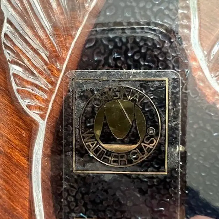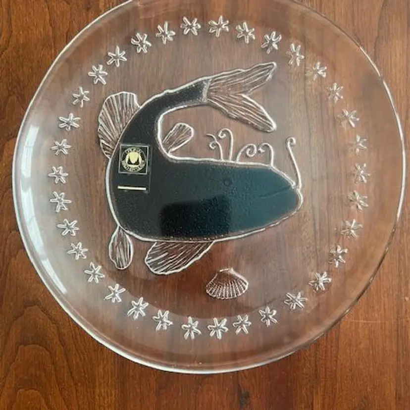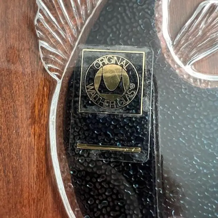 This plate from the Ocean Life Collection is new with the Walther sticker still on the front. It is smooth on top and textured on the bottom – clear glass with a blue whale. It measures approximately 9” in diameter. The sticker is difficult to read, but reads Original Wather Glas, Collection Liebenstern, Made in Germany, Fabrique en Allemagne. No chips, cracks or scratches