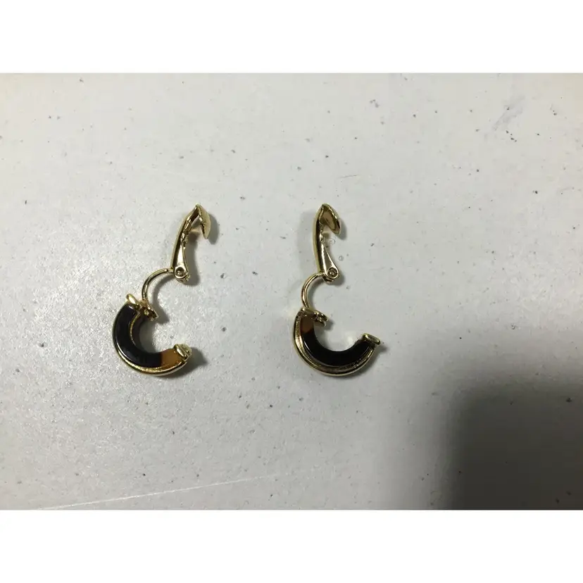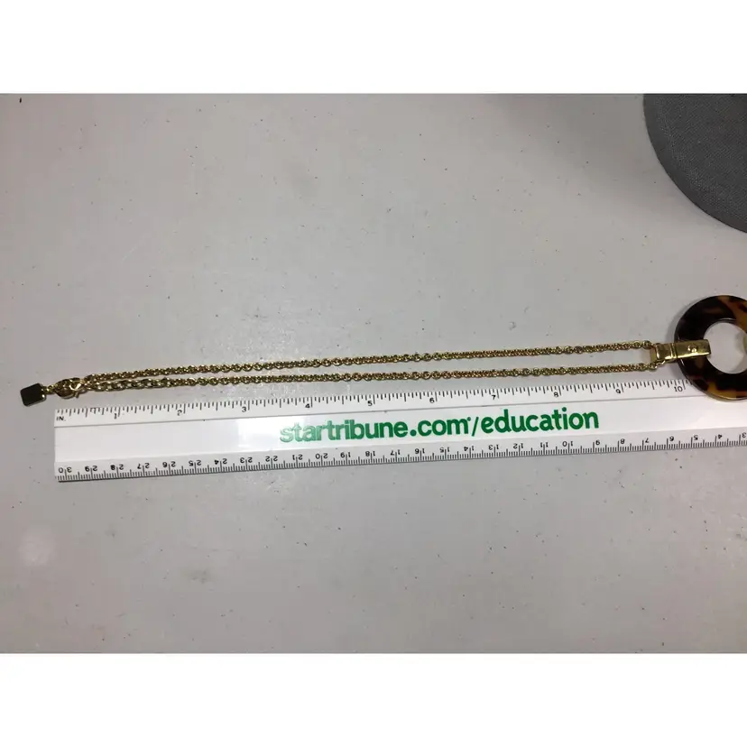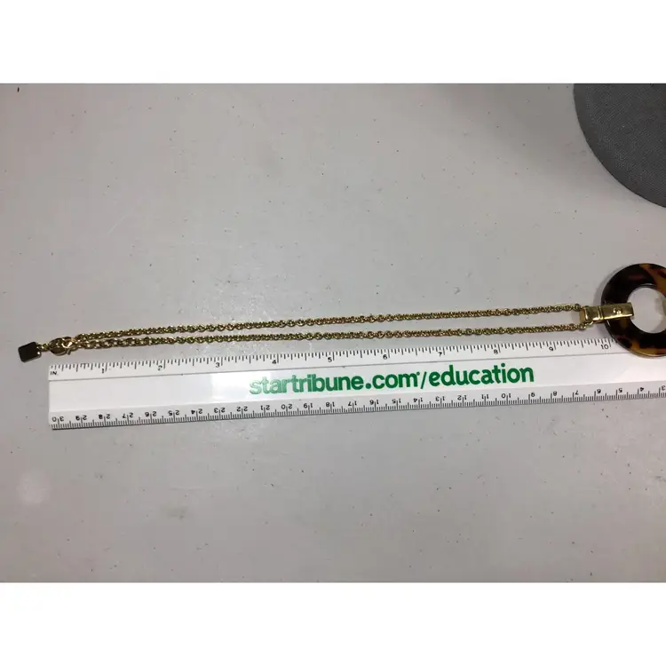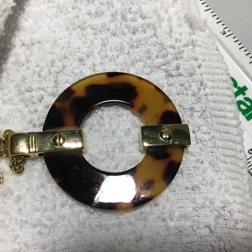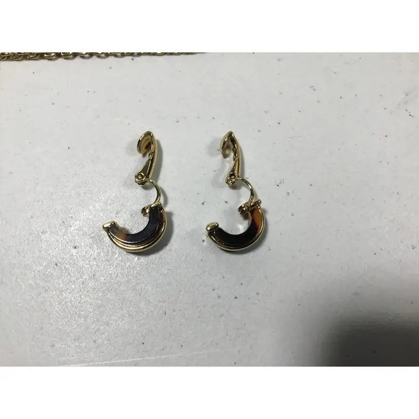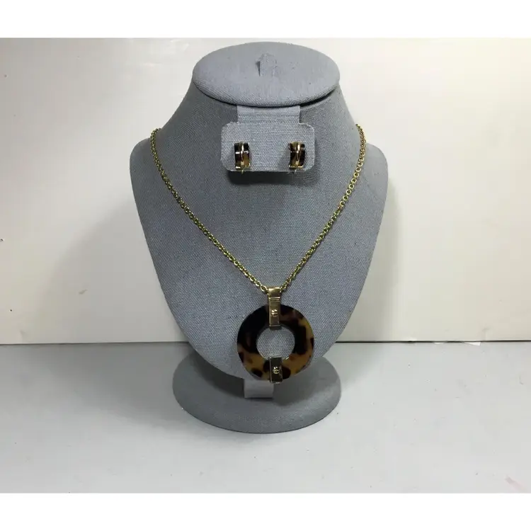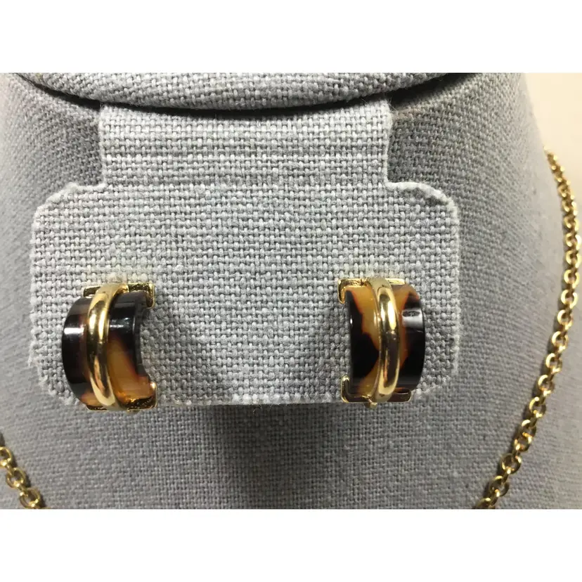 Warm, yellow and dark brown hoop pendant on 19" gold tone rolo chain with faux tortoise shell half-hoop earrings.. Gold tone metal accents on earrings, Vintage 1/2 inch CLIP ONS, clip strength is good.