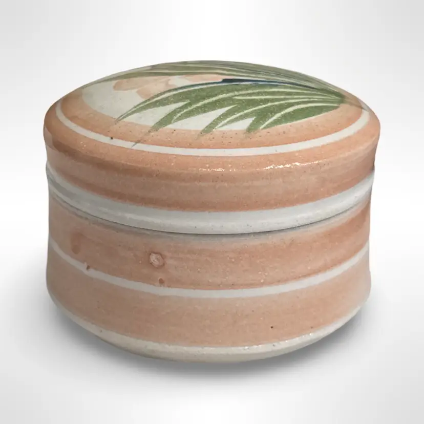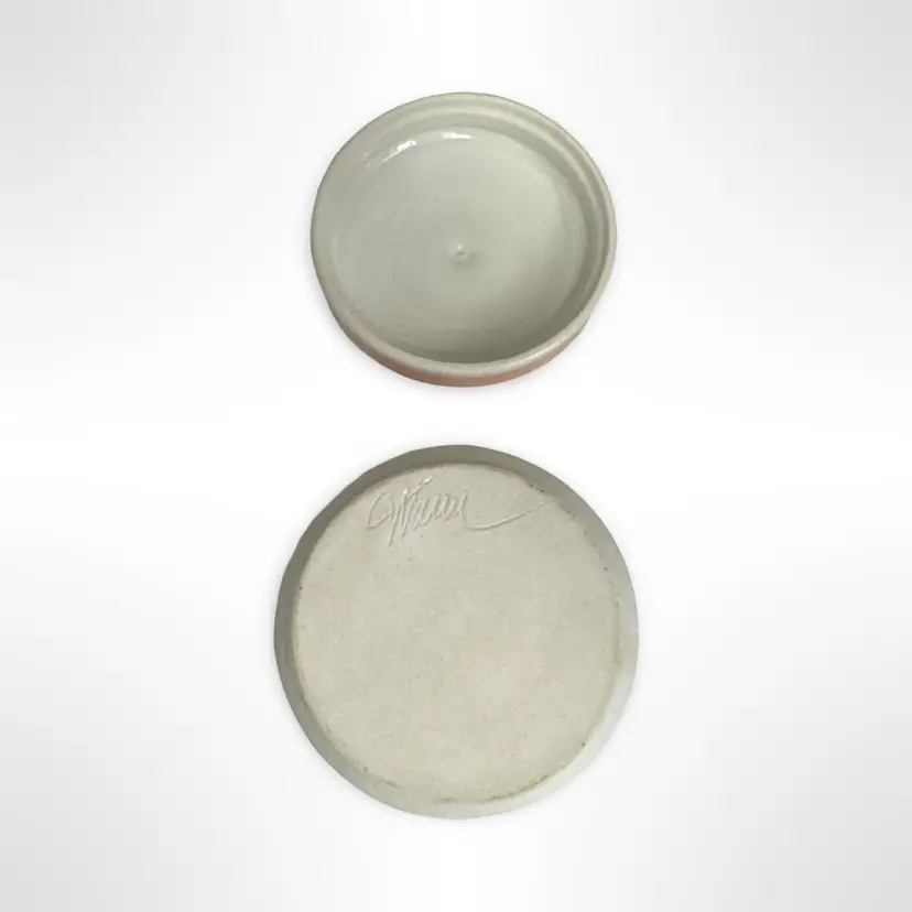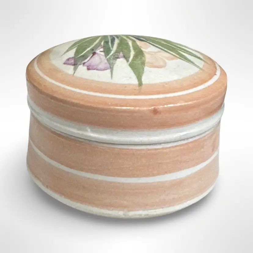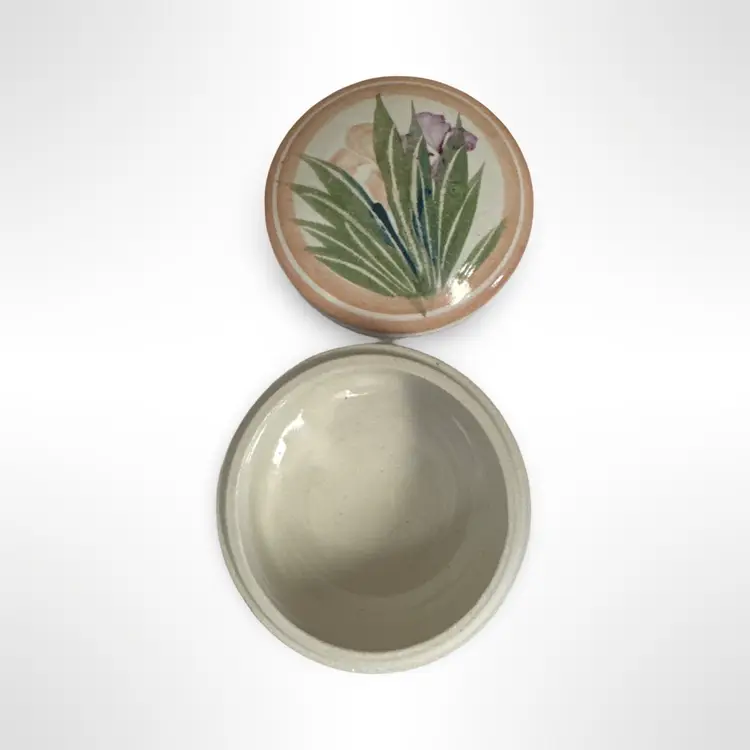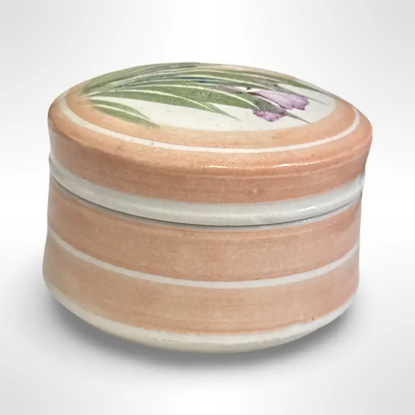 Beautiful Studio Pottery trinket box by Oregon Potter Carl Warne. Features lovely hand painted iris flowers on the lid and a peach colored glaze with off white accents. It is in great condition with no damage. Measures approximately 3.5” W x 2.5” H