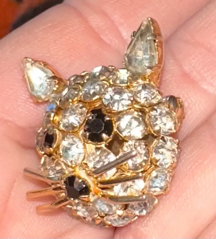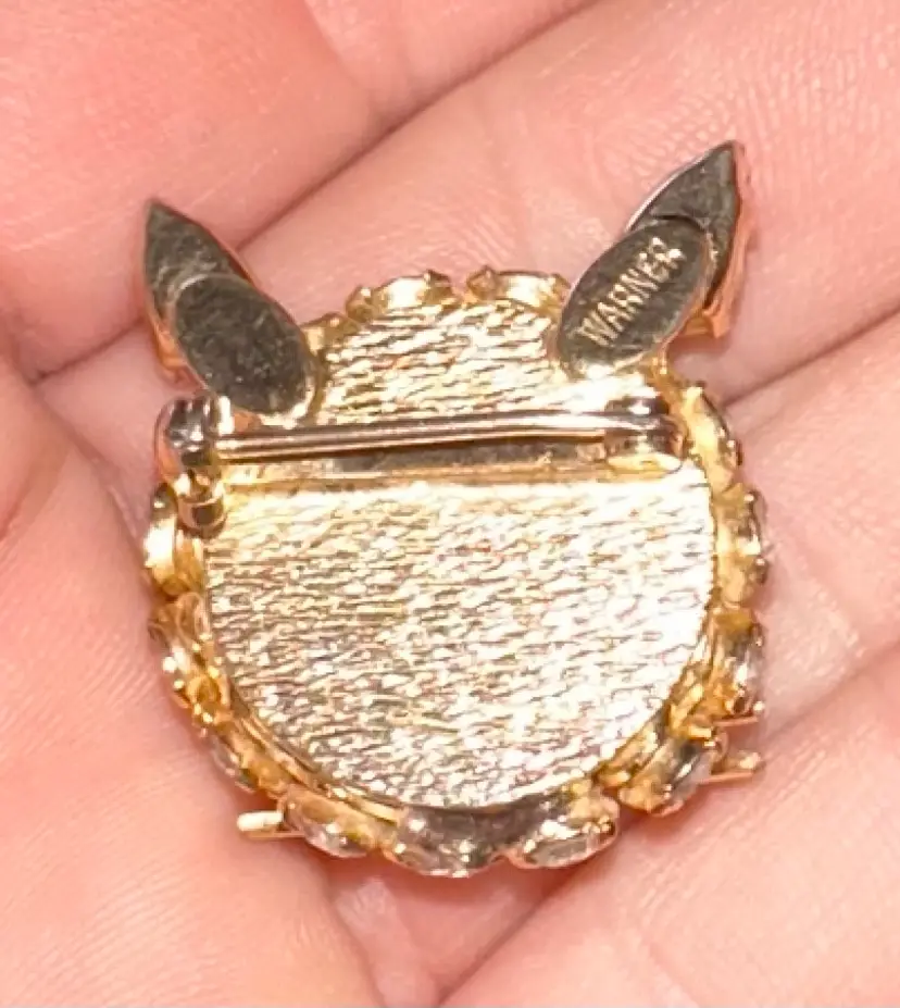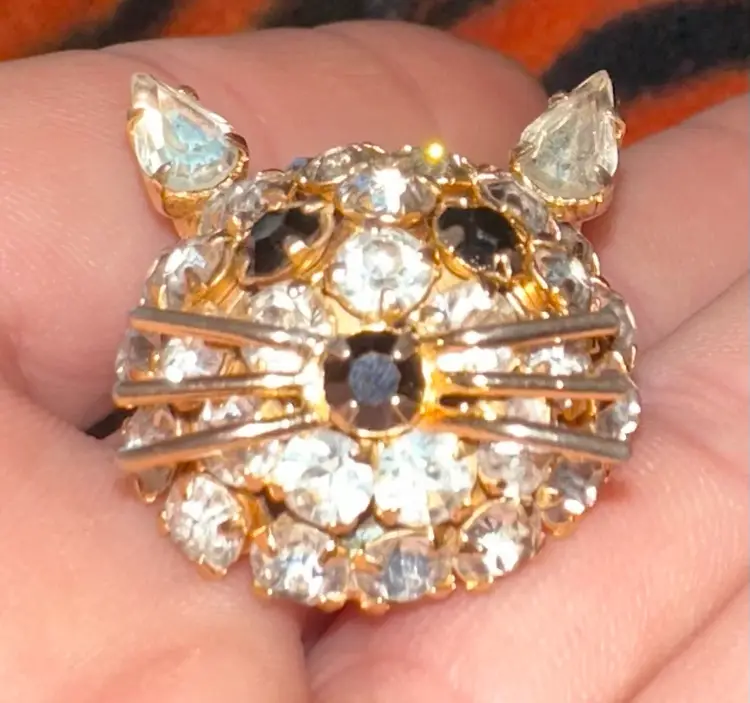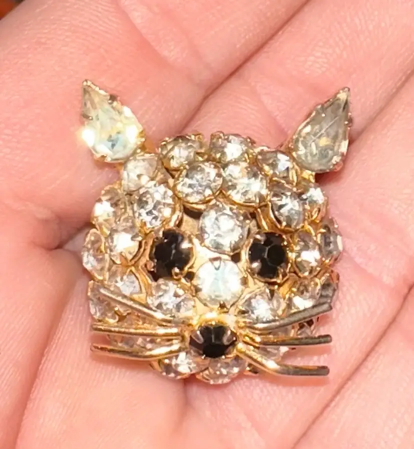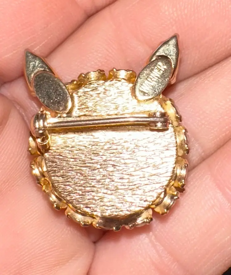 Absolutely stunning is this Warner AB Rhinestone Gold Tone Cat Face Brooch Pin Vintage Excellent condition! Clear & black rhinestones set in gold tone