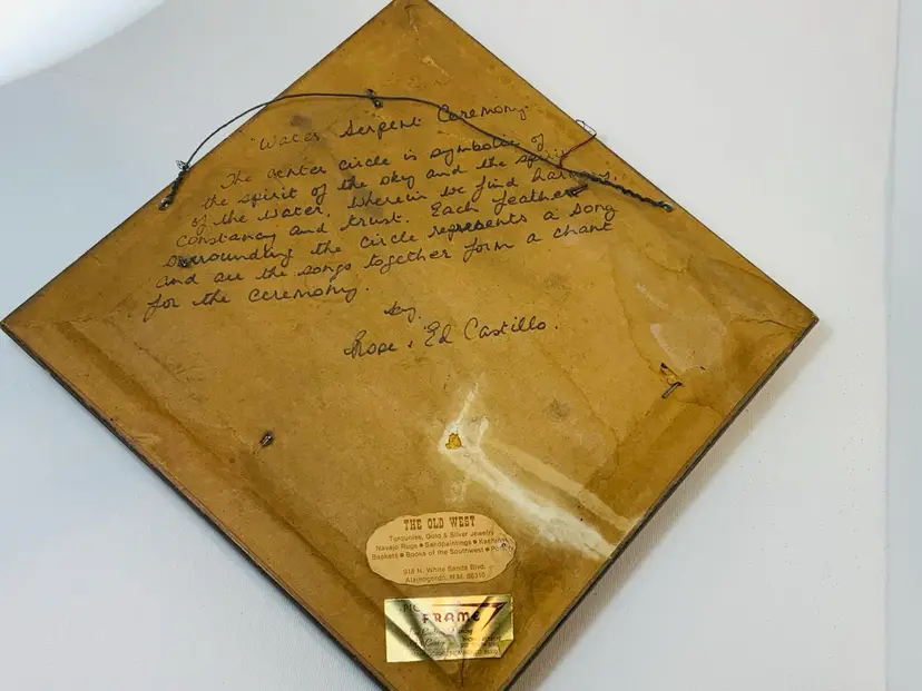 Vintage original art, signed by the artist with written explanation of the symbolism. Shows wear, scuff marks and scratches on frame. Sand painting appears to be in great condition. Painting is on an 8” by 8” wooden panel. Frame appears to be original and made of a dark stained wood. Imbedded dust and sand are prevalent. Looks dusty but I did not clean it. It is as I bought it. Buyers can choose to have it cleaned or leave as is. The dust seems to give it character. Also the nails used to hold wooden panel in place are now showing through the paper backing. It still looks great. Please review photographs, as they are part of the description. Sold as is.