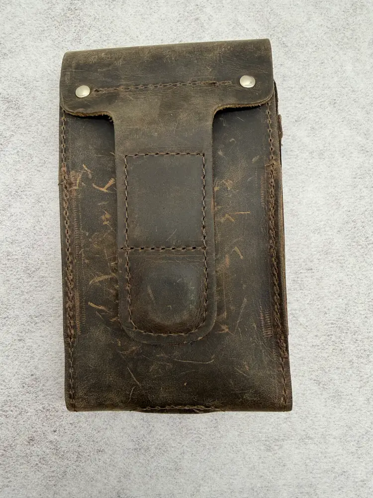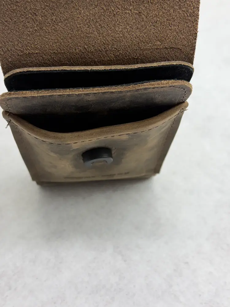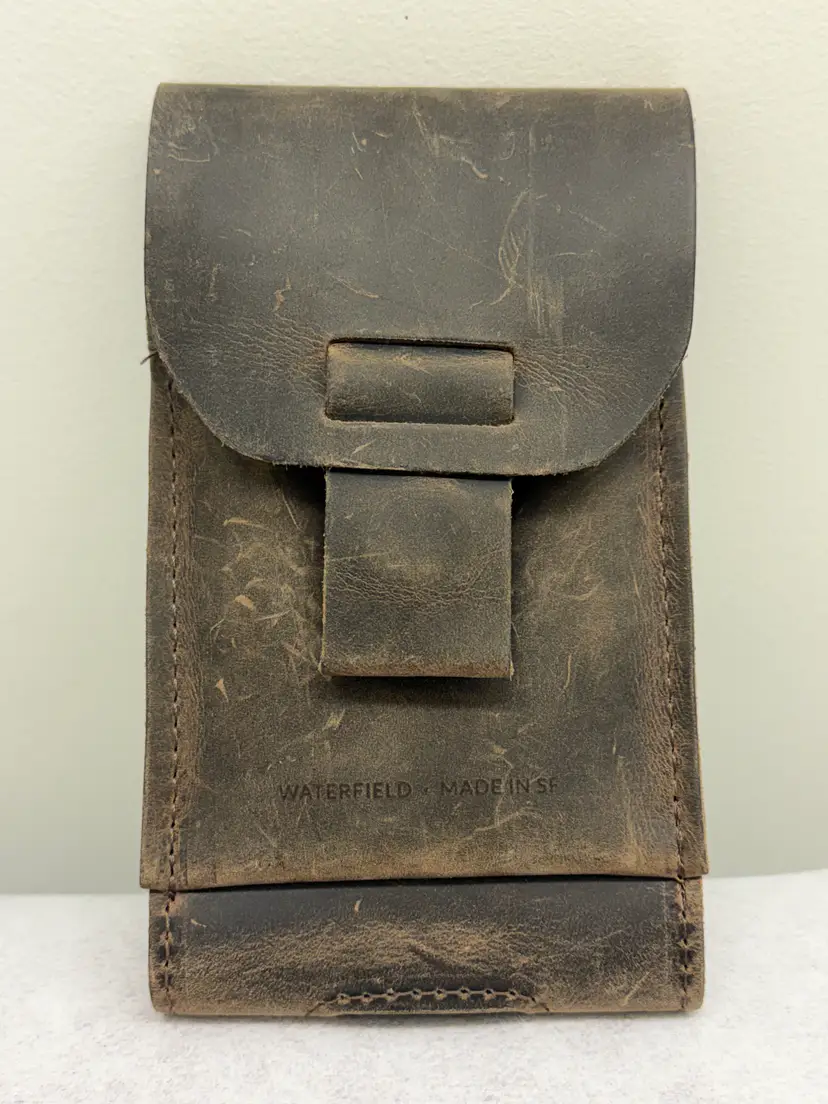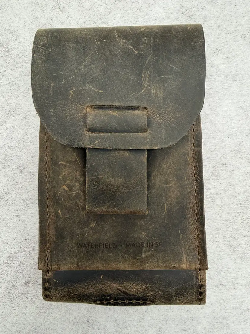 Internet description: The WaterField Ranger Phone Case is a rugged, holster-style case made from full-grain leather with a soft Ultrasuede® lining, featuring a magnetic Fidlock closure and an external pocket for cards or cash, designed for protection and easy one-handed access, with a strong magnetic belt/strap attachment option for secure carrying. It's known for its durable construction, premium feel, and ability to develop a rich patina over time, offering a classic, handcrafted alternative to standard phone cases.