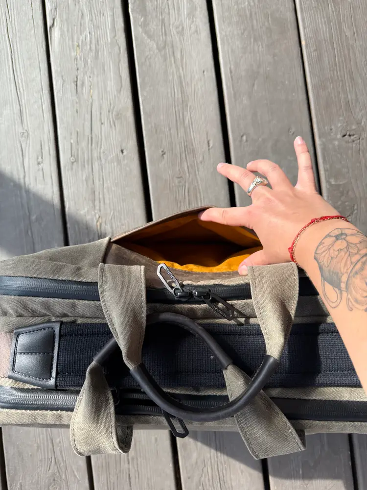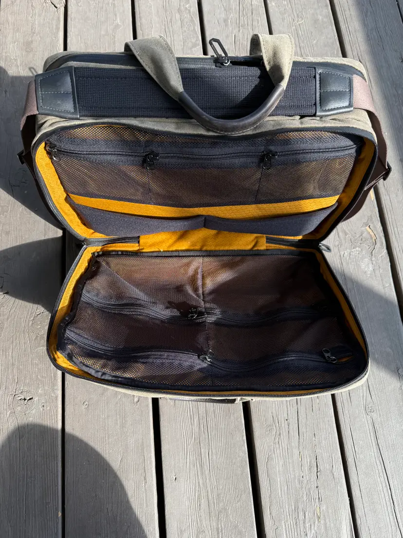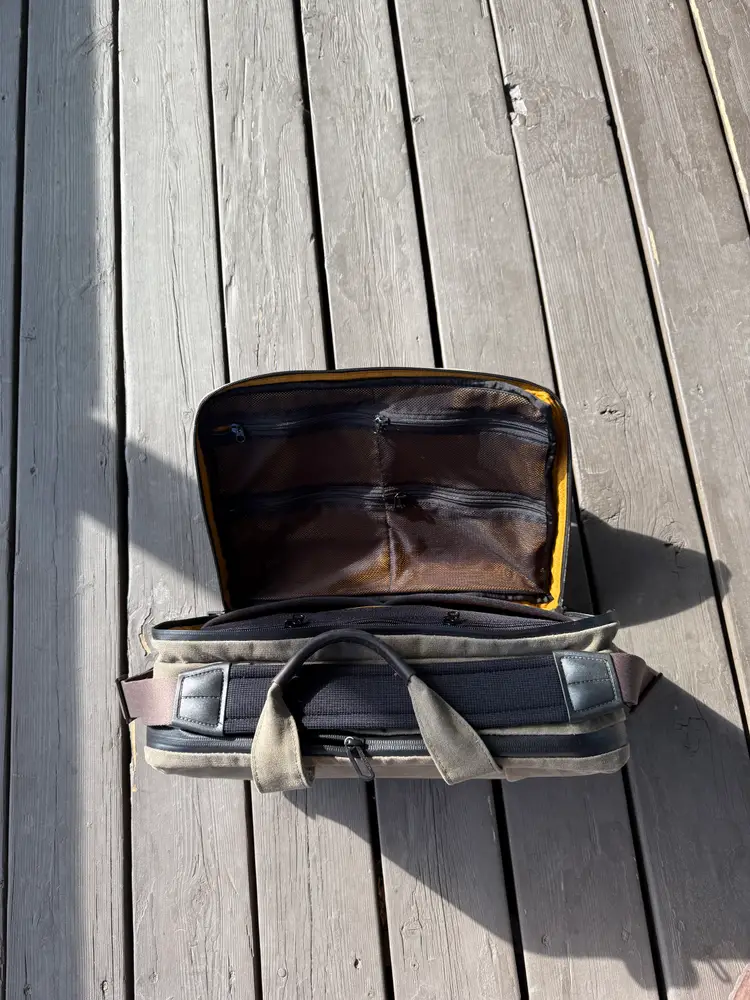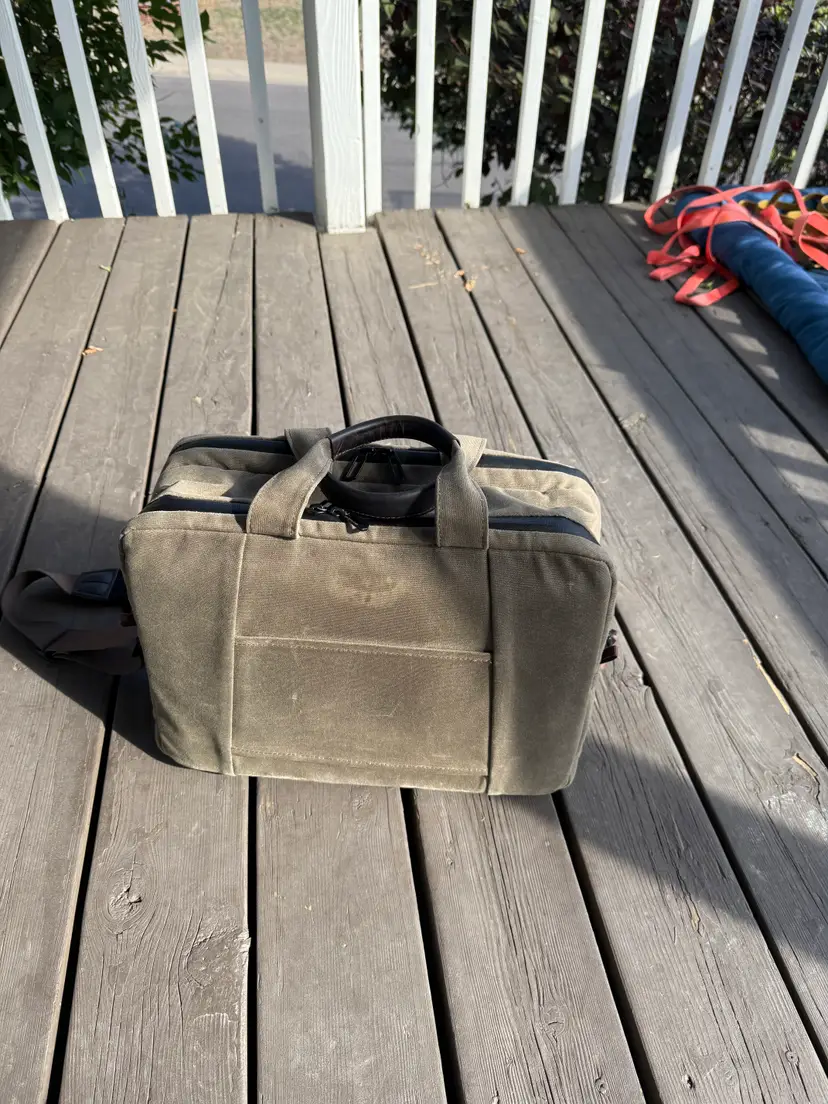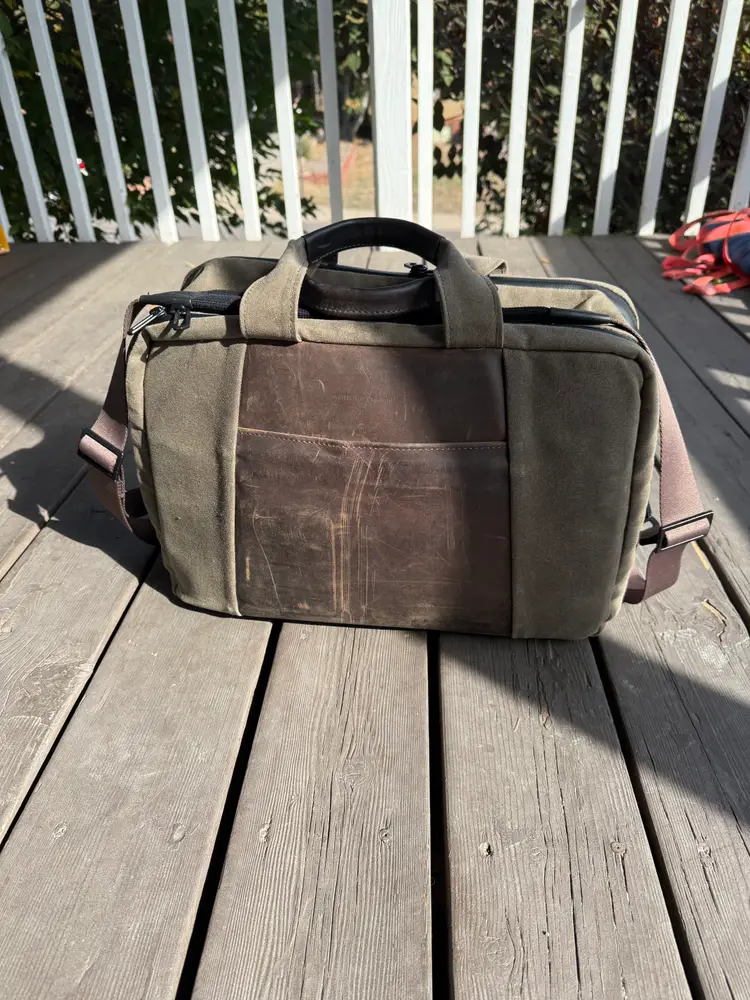 This is the 16” full version of the brief in waxed canvas with chocolate leather accents. Exterior of the bag shows mild signs of wear and tear with patina on the leather and waxed canvas. This can be helped with the use of leather conditioner or re-waxing. Interior of the bag is like new. This brief is perfect for everyday office needs while looking professional and fits perfectly under an airplane seat. Offering for over 40% off the original bag price.