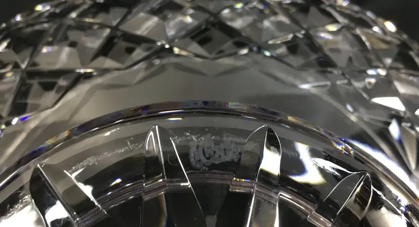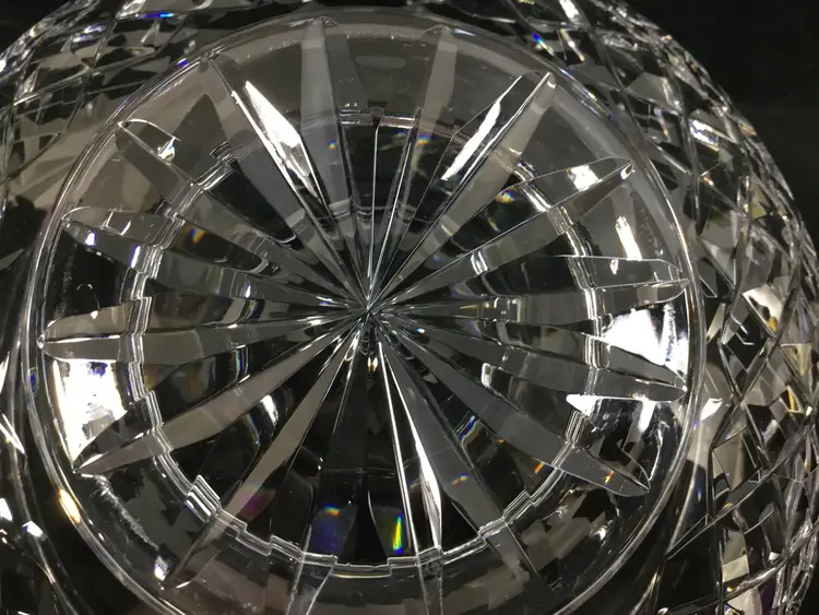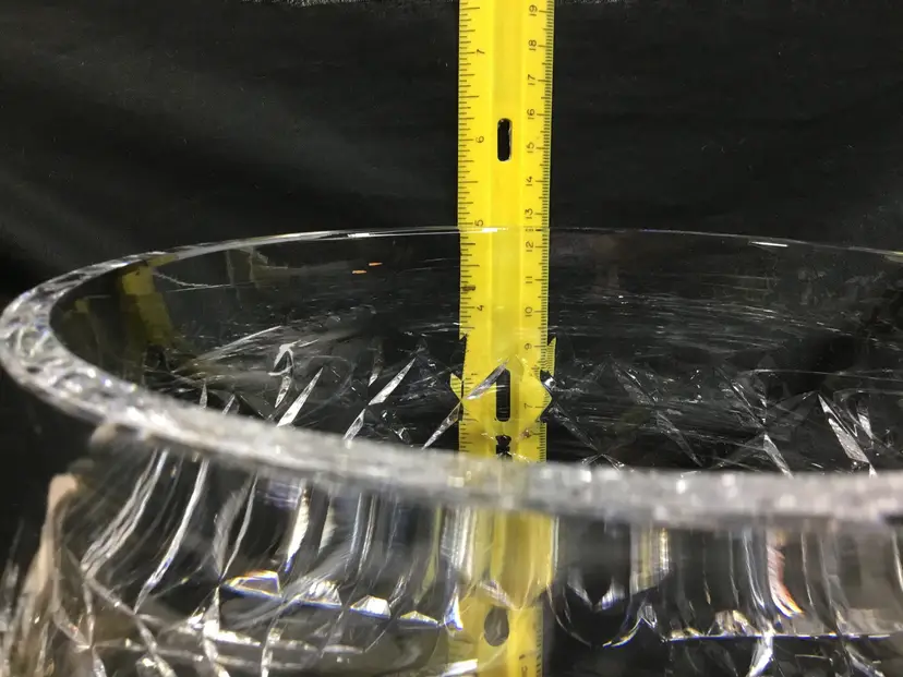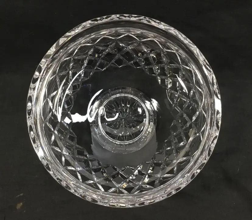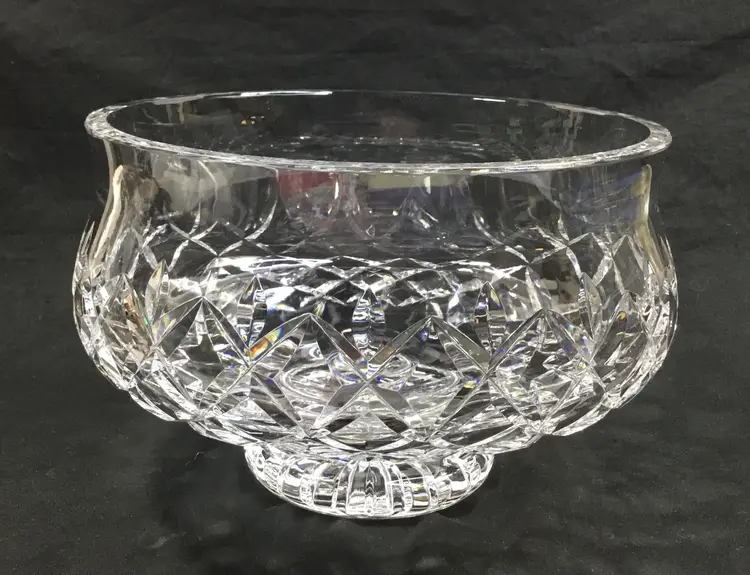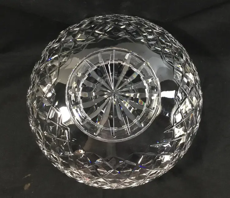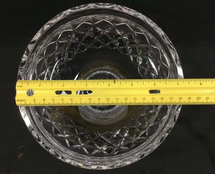7.25 inches wide at the top, 5 inches tall, diamond design with "leaves" called Lismore Essence. Shape of bowl scoops in then flares out at the top. Gothic lettering on bottom says "Waterf' the rest was cut off in the design on the bottom of the foot. Was made before year 2000. Holds 5 cups.