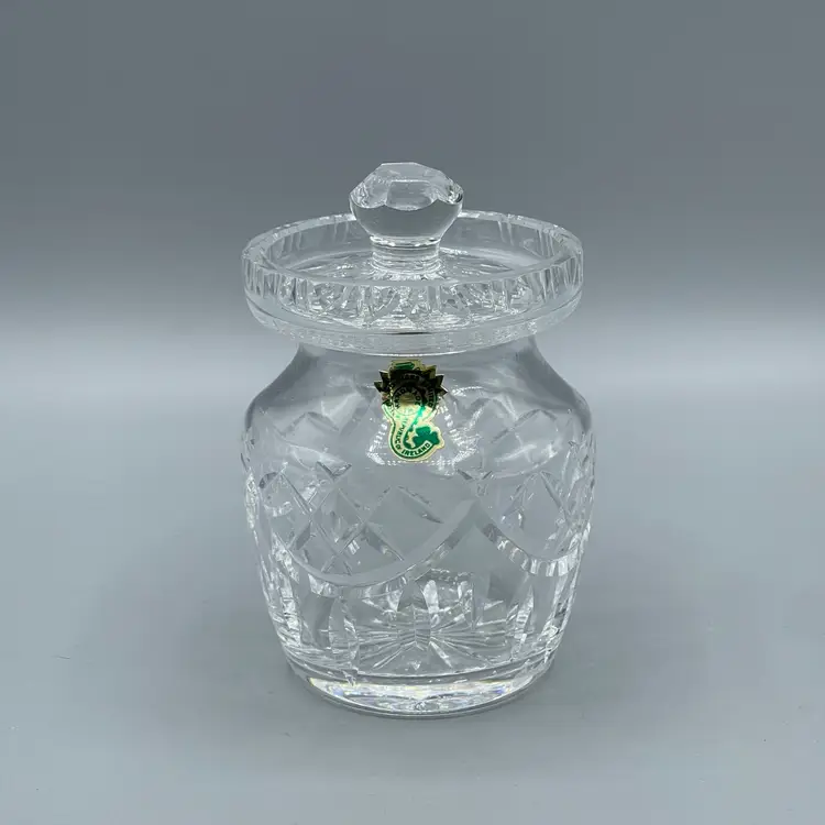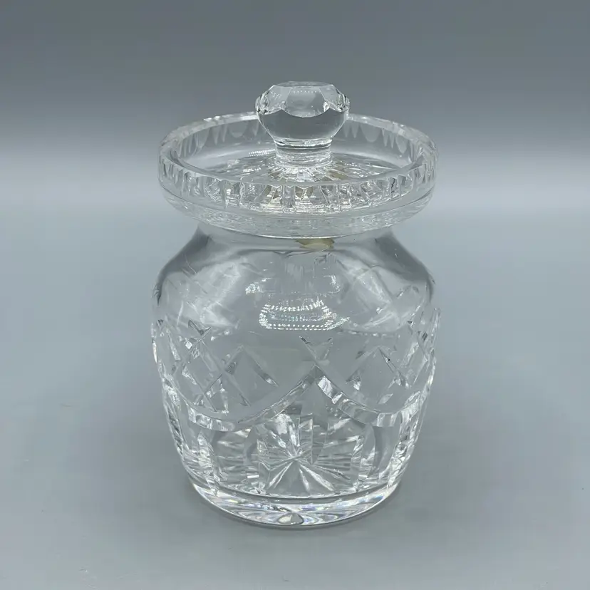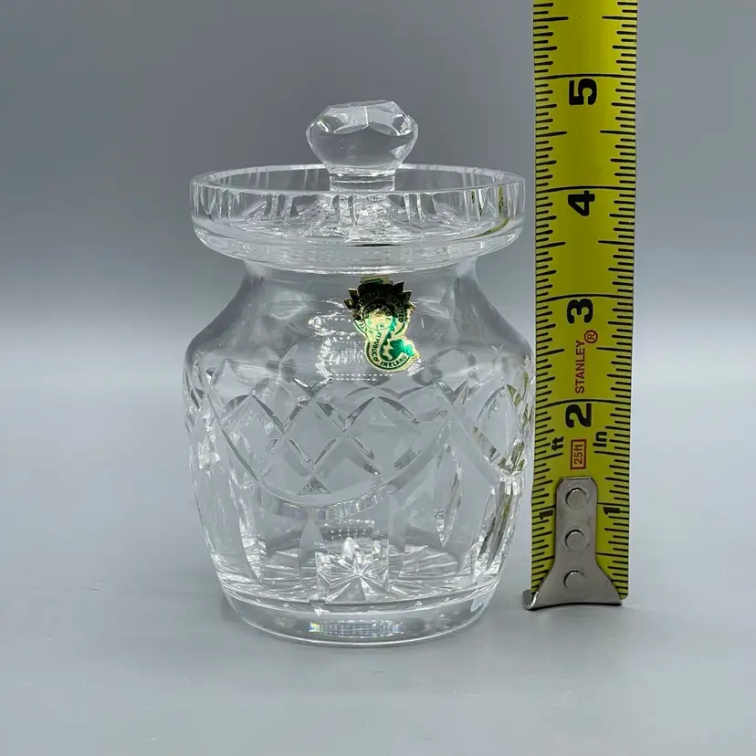 No chips or cracks. Old mark. Older original sticker present. About 4-3/4 inches tall with lid.
