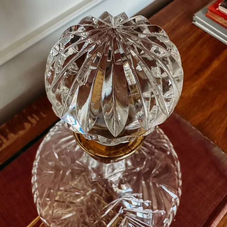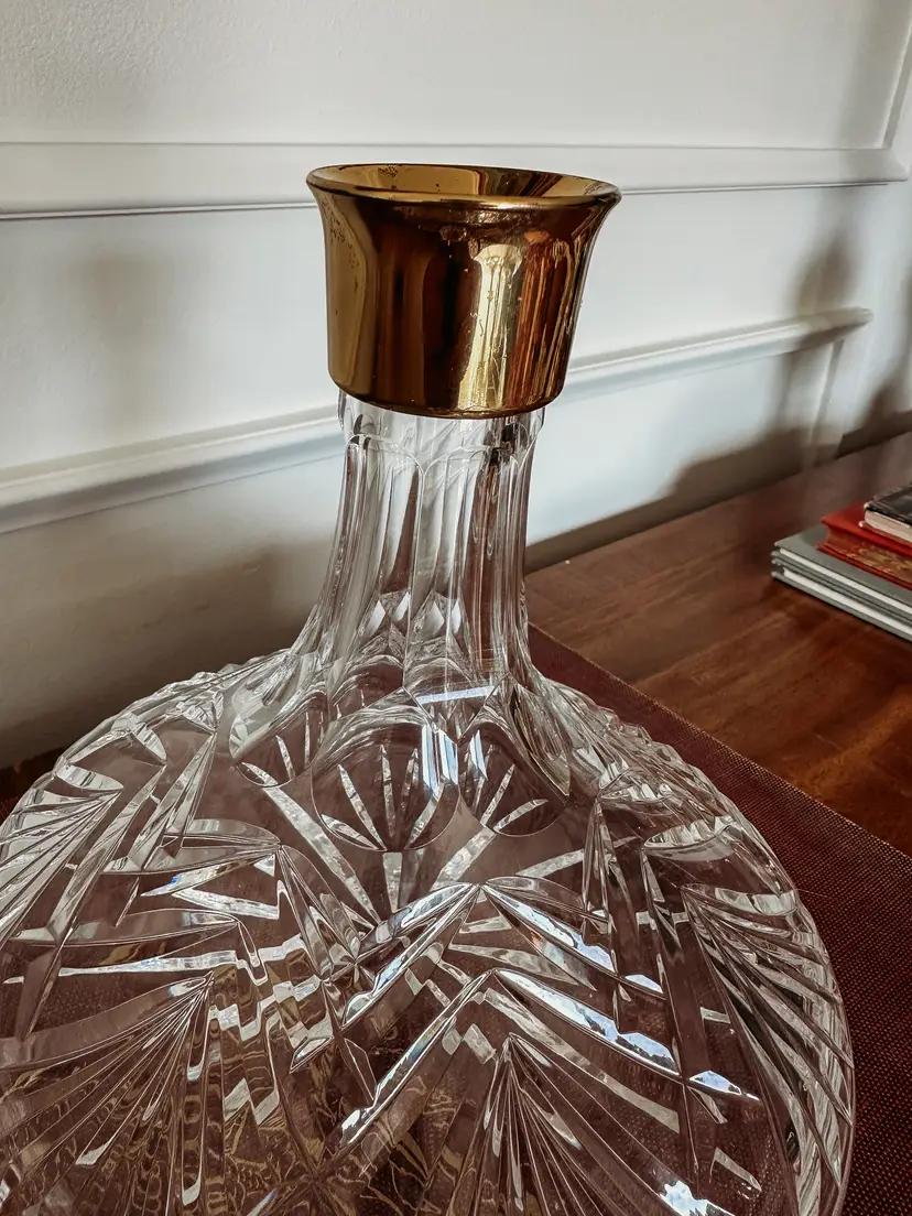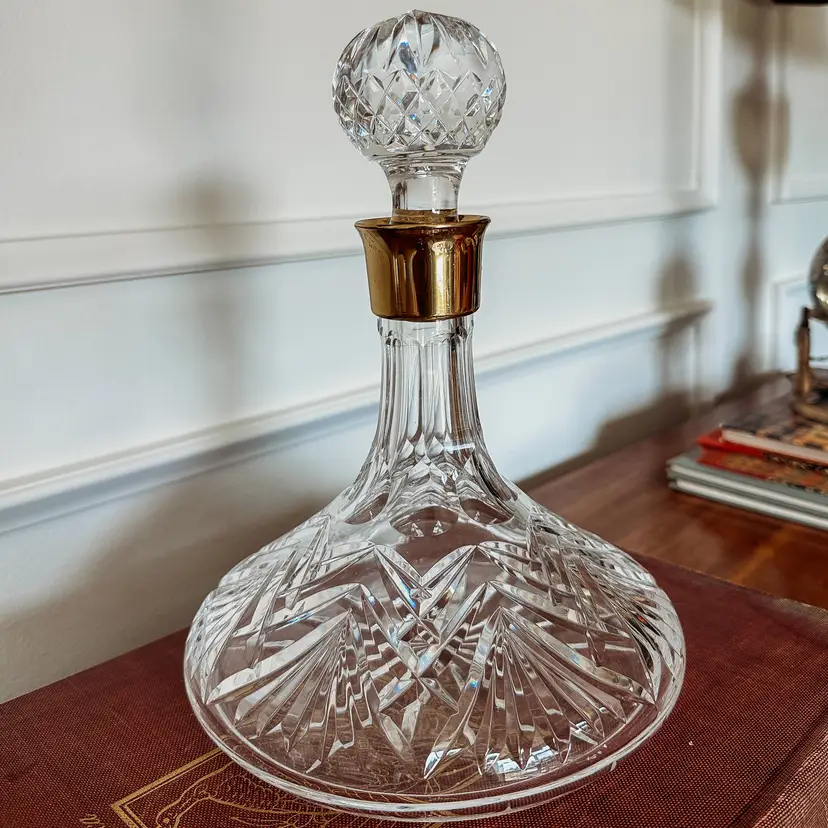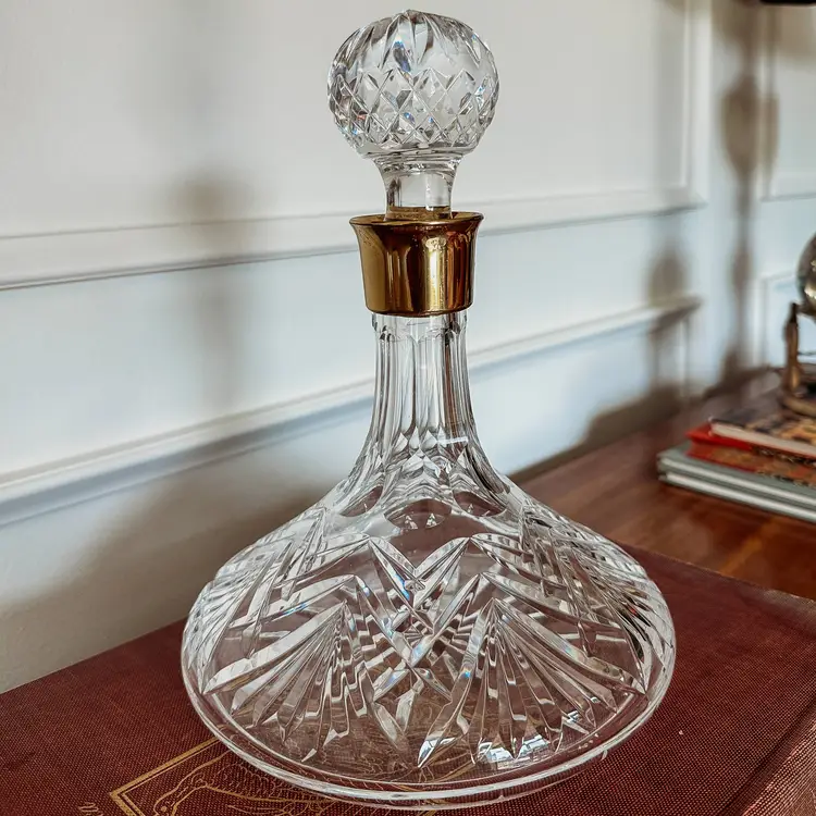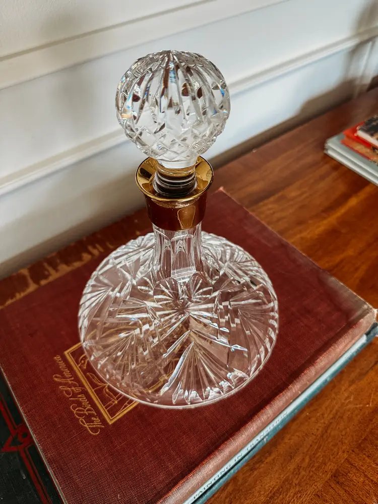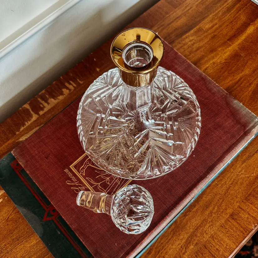 Absolutely stunning and in perfect vintage condition! The Decanter has a fan pattern with a gold-tone band at the top. It stands 7" tall without the stopper. The beautiful ball-shaped stopper adds 2.5" to the height. The decanter has a 7.5" base.