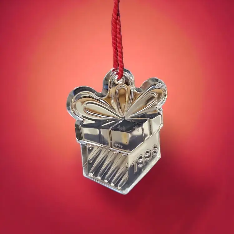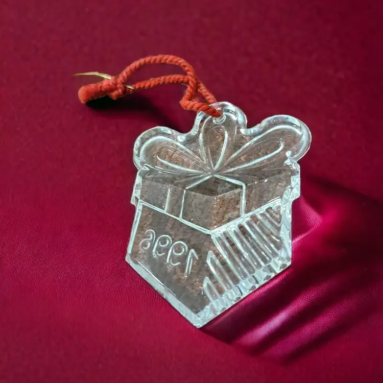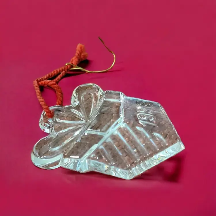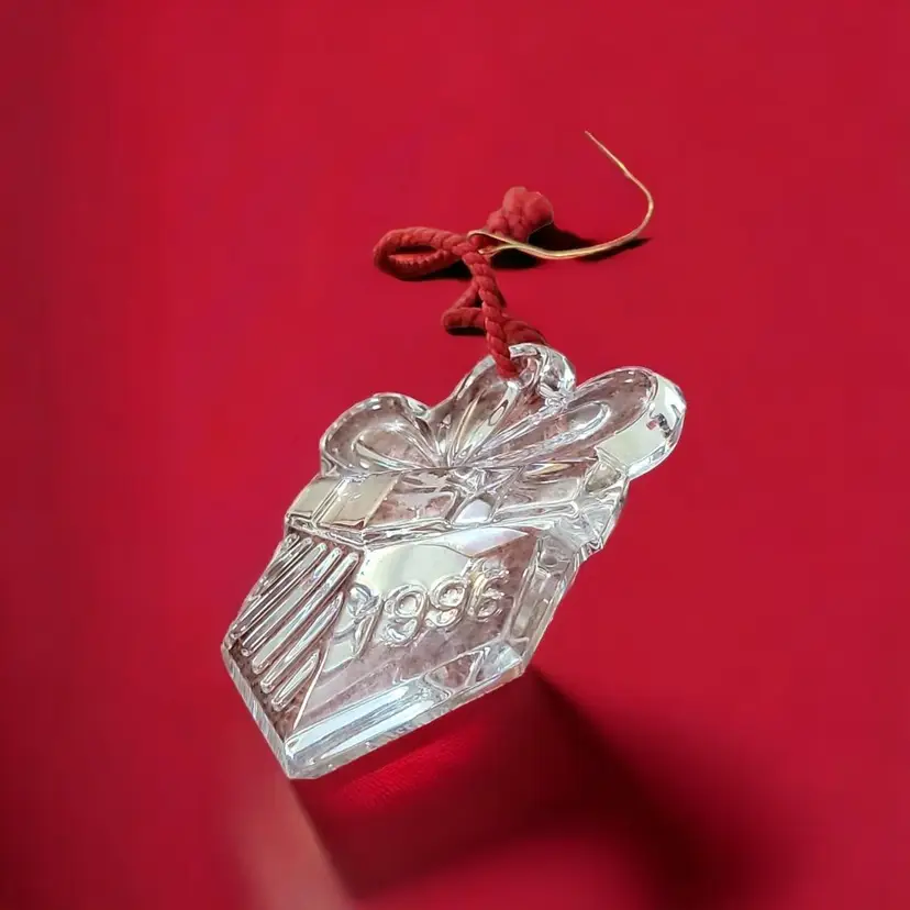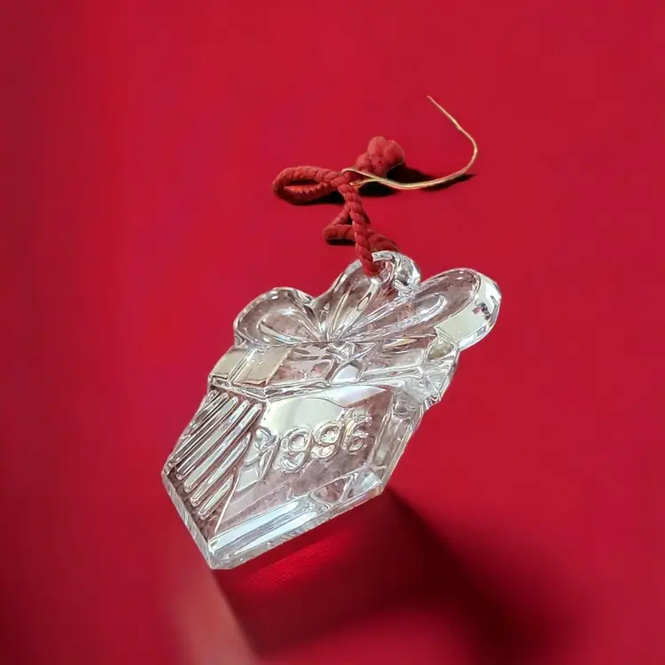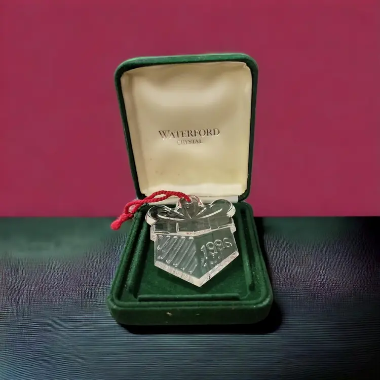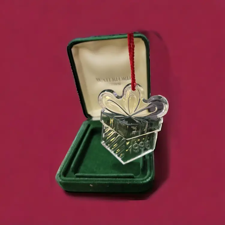 This is a lovely Crystal gift box ornament as part of the series of Memories Collection. The Waterford mark is etched on the side of the glass and 1996 is engraved in block numbers. The giftbox is 3" x 2 1/4" and weighs about 5 ounces. The green box has the Waterford Crystal title on the inside of the box. There is no bag or papers with this one.