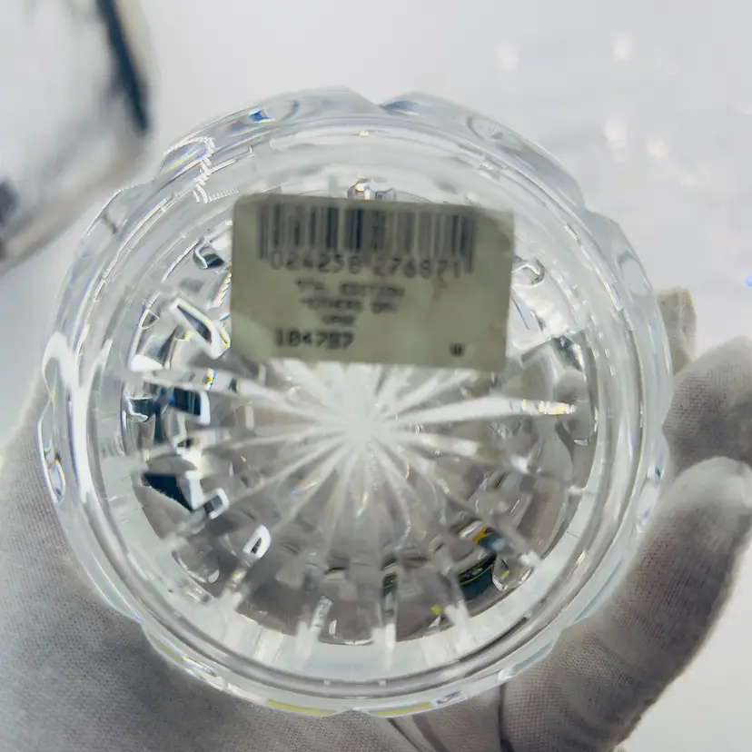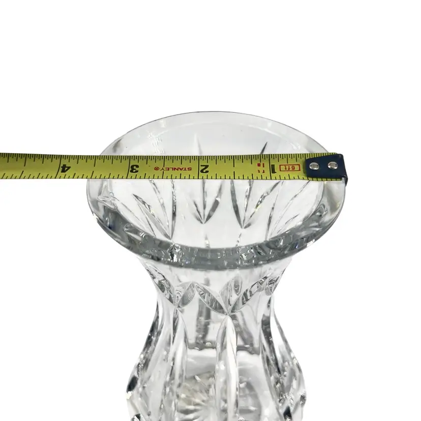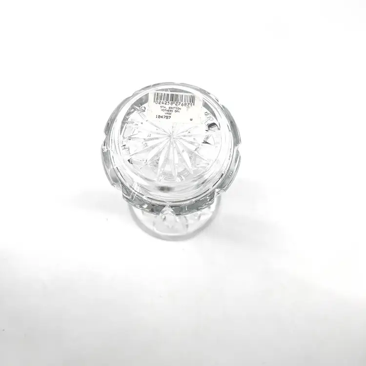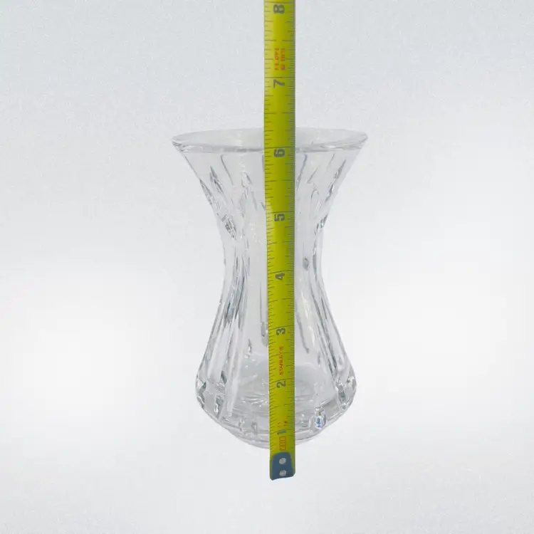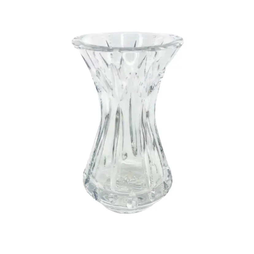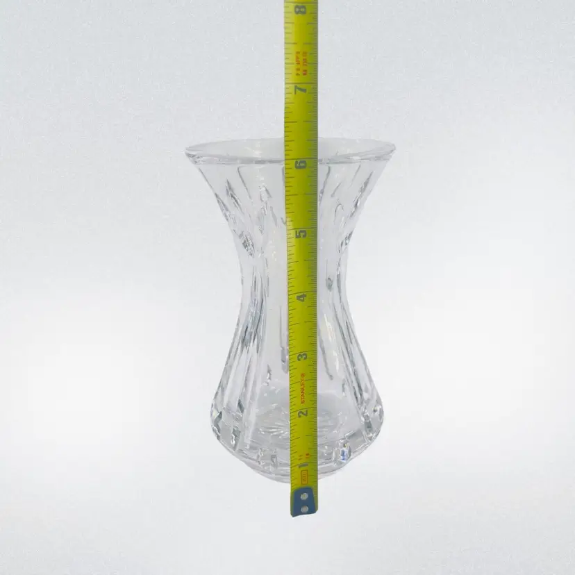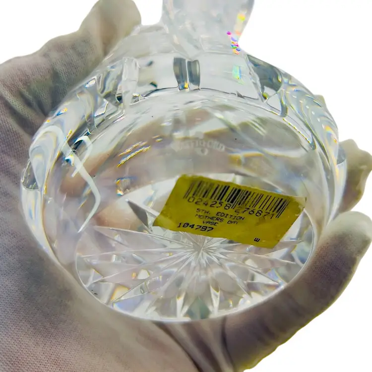 Waterford Crystal Mother's Day 5th Edition vase. It is crafted from full lead crystal. The vase stands approximately 6 inches tall. It features a flared mouth, tapered stem, and a small footed base.