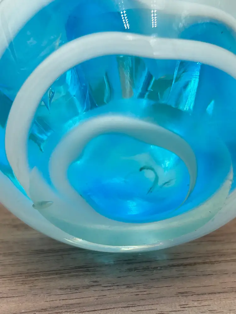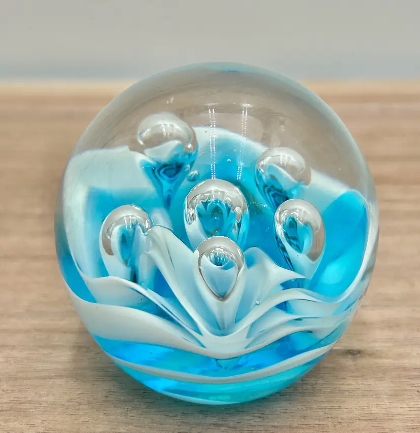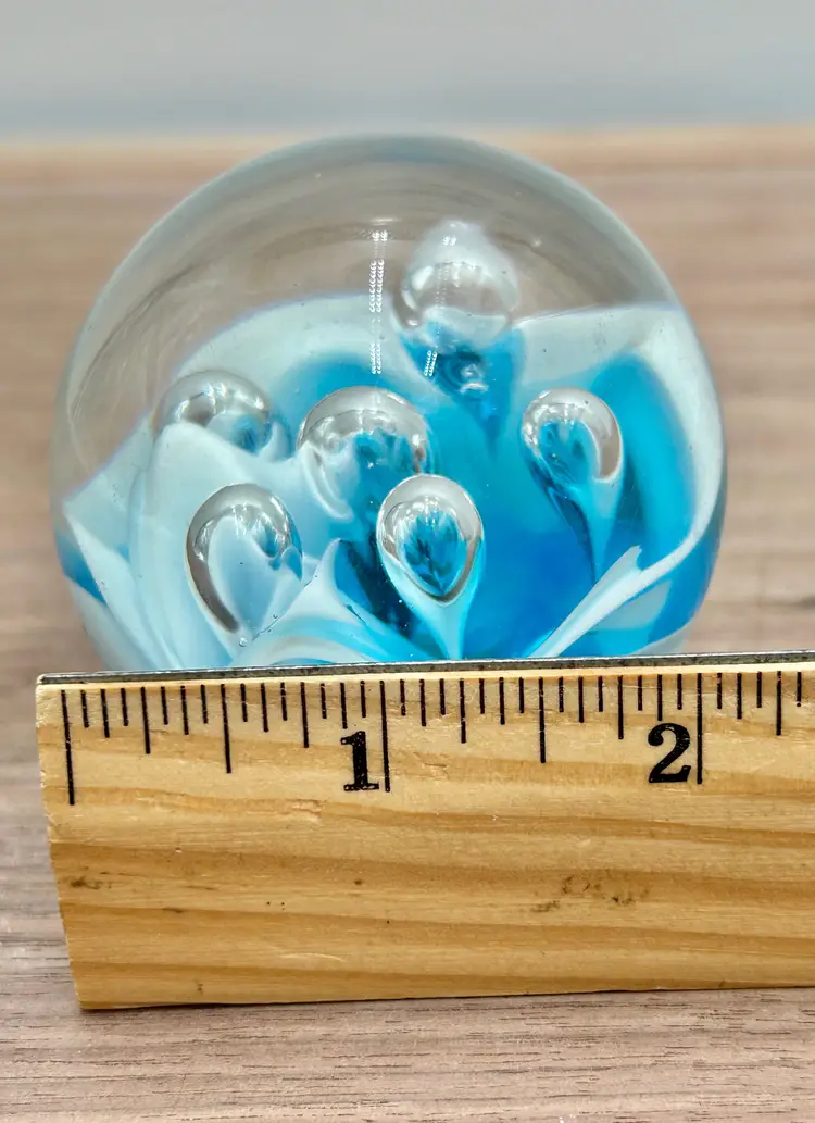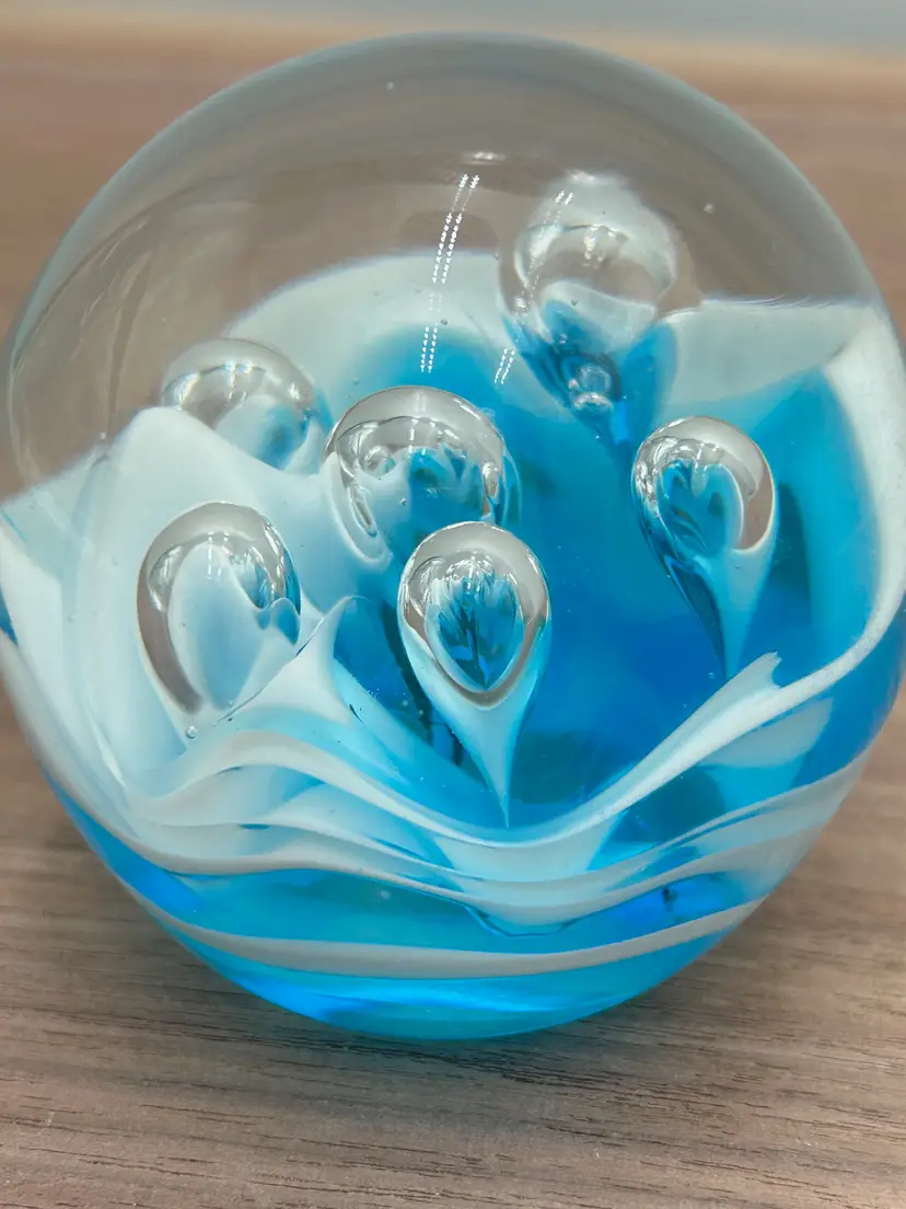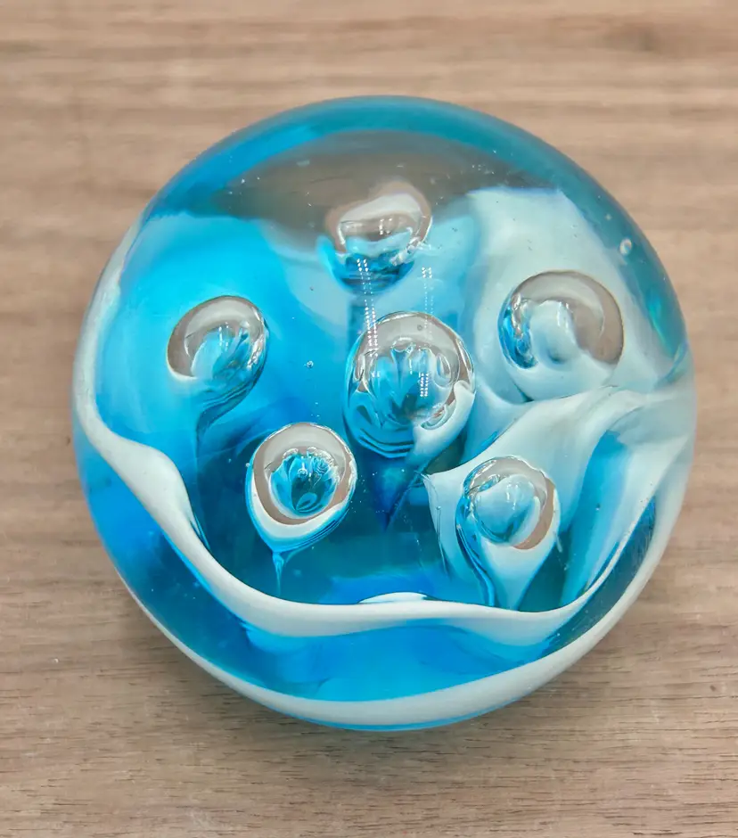 Not a signed paperweight, but it is a super pretty one. The weight is a clear glass with aqua blue and white ribbons swirled throughout the lower half. There are six pretty controlled teardrop shaped larger bubbles coming up from the swirls. It does seem like a good quality piece with a polished bottom and just a couple of small air bubbles in the glass where they weren’t expected to be, near the base. The paperweight is about 2 ¾ inches tall and 2 inches wide. There are no chips or cracks.