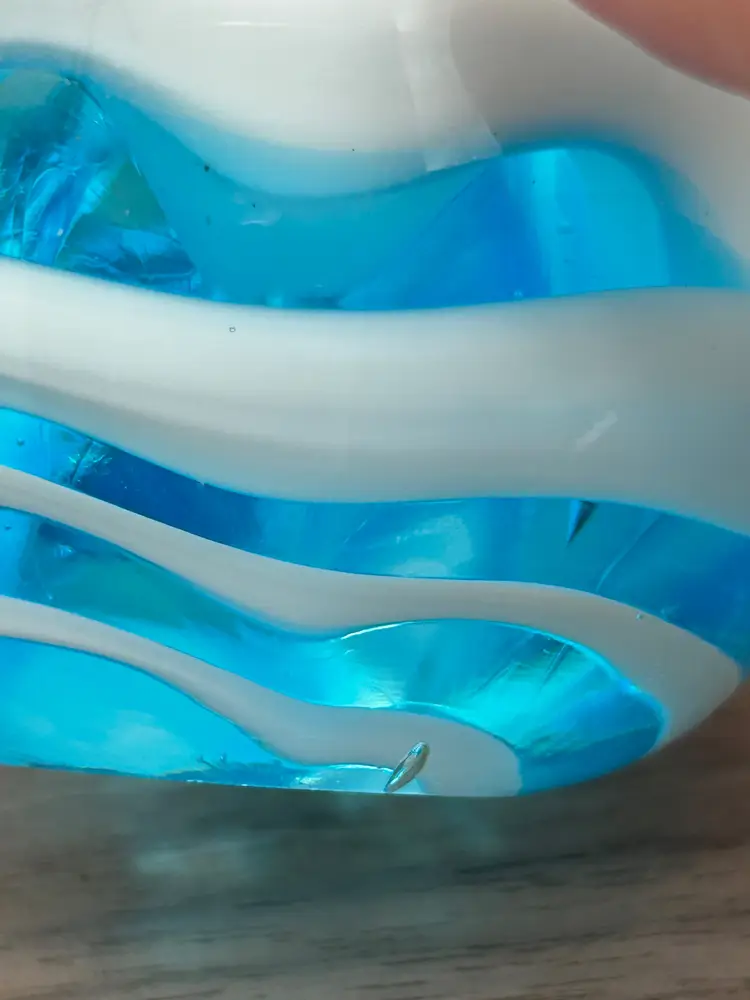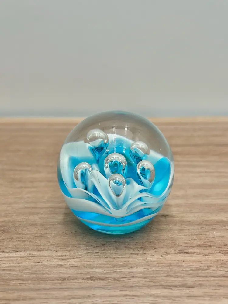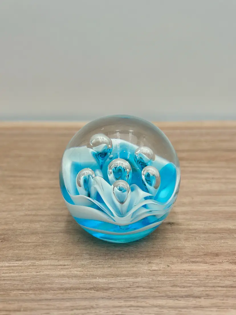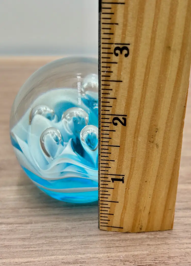 Not a signed paperweight, but it is a super pretty one. The weight is a clear glass with aqua blue and white ribbons swirled throughout the lower half. There are six pretty controlled teardrop shaped larger bubbles coming up from the swirls. It does seem like a good quality piece with a polished bottom and just a couple of small air bubbles in the glass where they weren’t expected to be, near the base. The paperweight is about 2 ¾ inches tall and 2 inches wide. There are no chips or cracks.