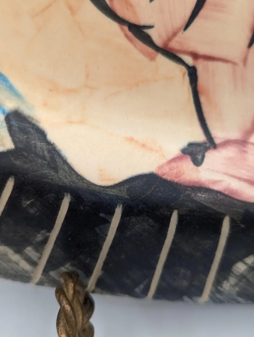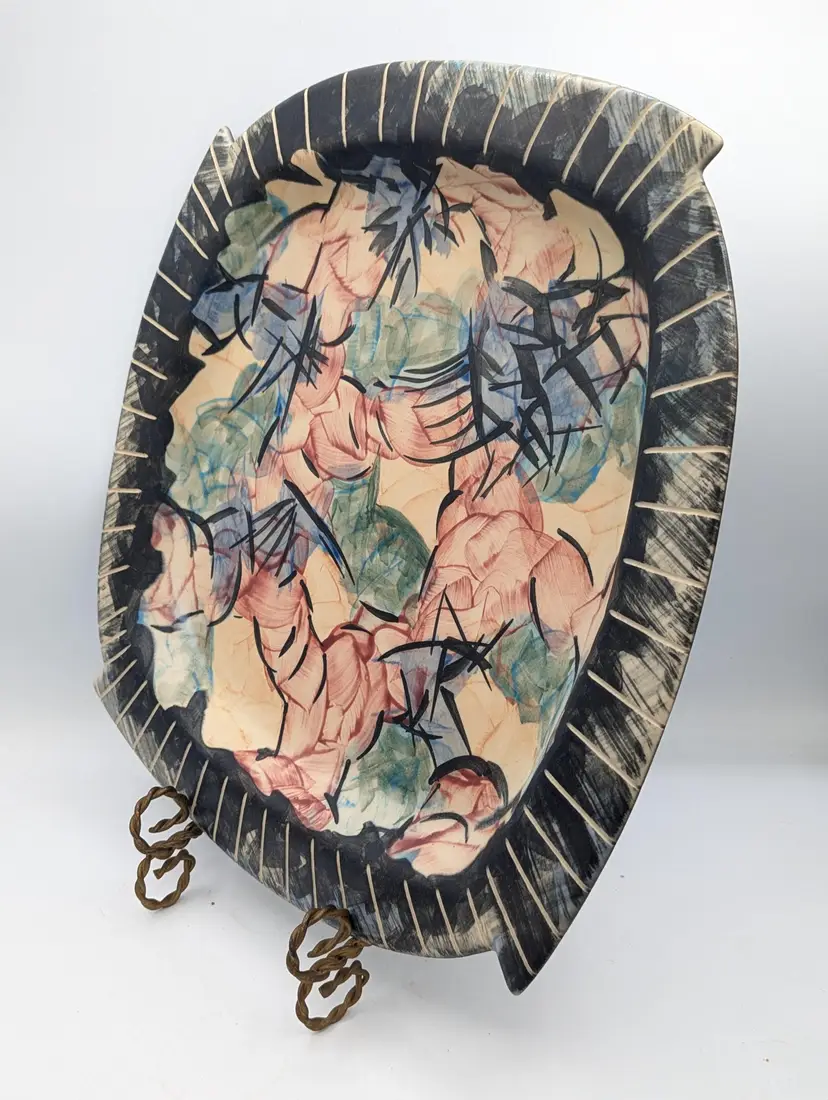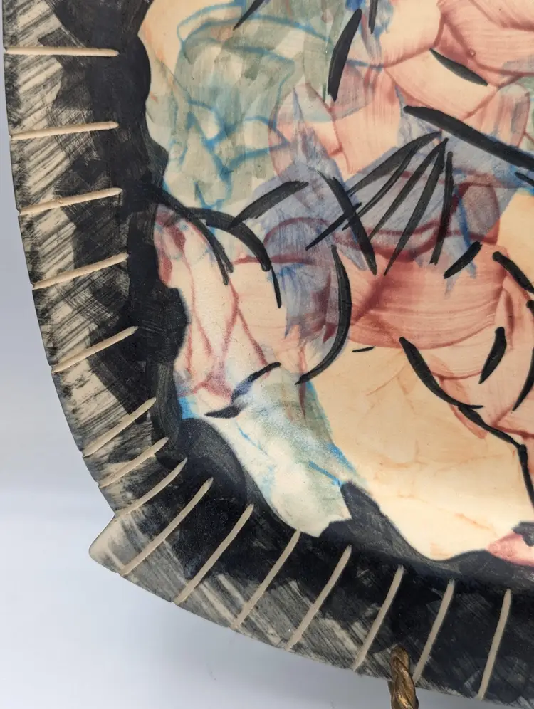Wayne Bates is an amazing artist! This pottery plate is hard porcelain with a colored sgrafitto design; it is like nothing you have ever seen before! 14" in diameter. Signed by Bates on the back . Mint condition. There is a sharpie marker on the back, see photos.