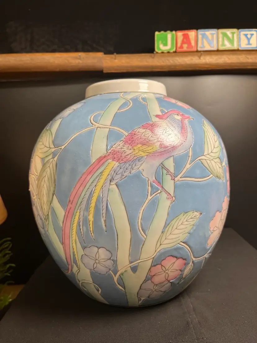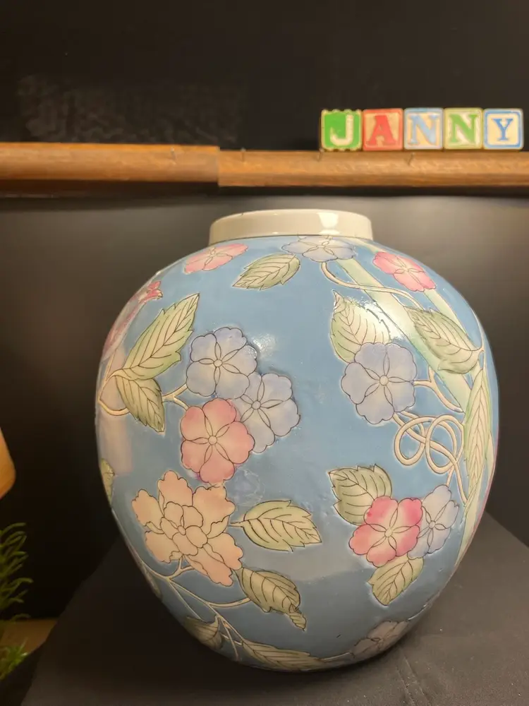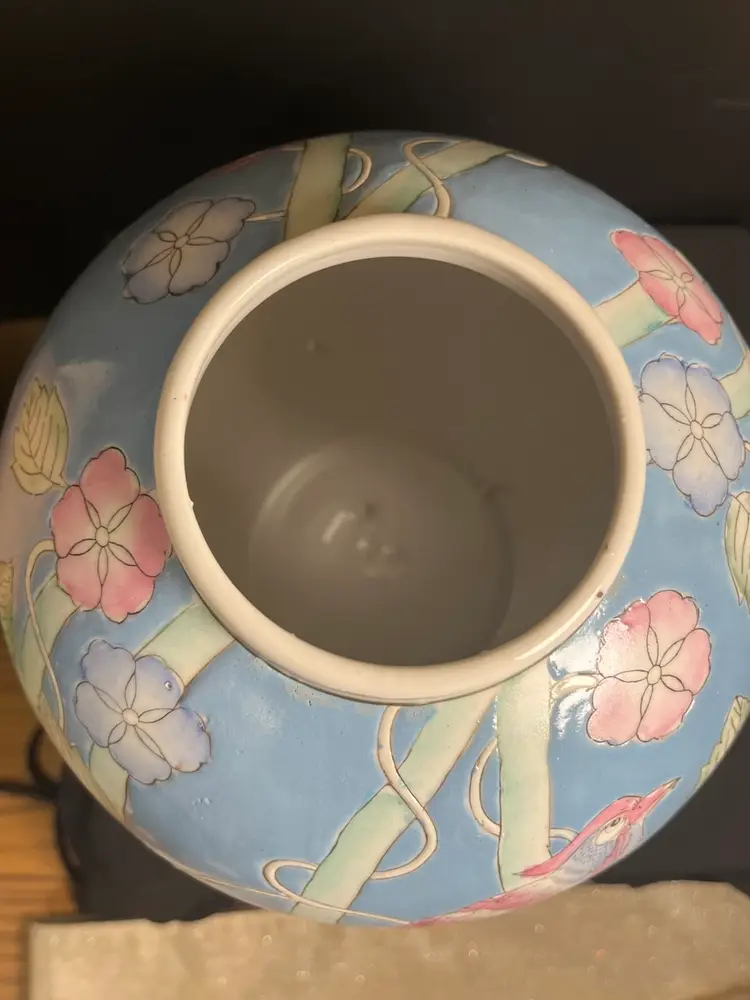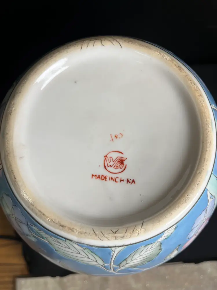 Stamped WBI Made In China in red on bottom. This is in great vintage condition. There are no chips, cracks or paint wear. Beautiful Periwinkle Blue background, lavenders, greens, yellows. Measures approx 8.5"H, 7.5" at widest point, Pre packing for shipping wt is 4 Lb. This will ship alone.