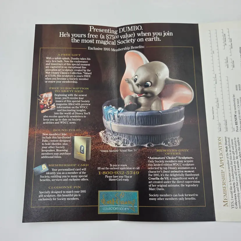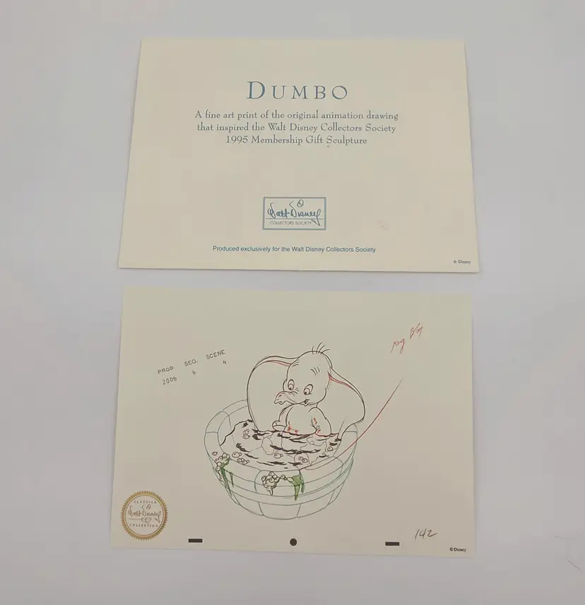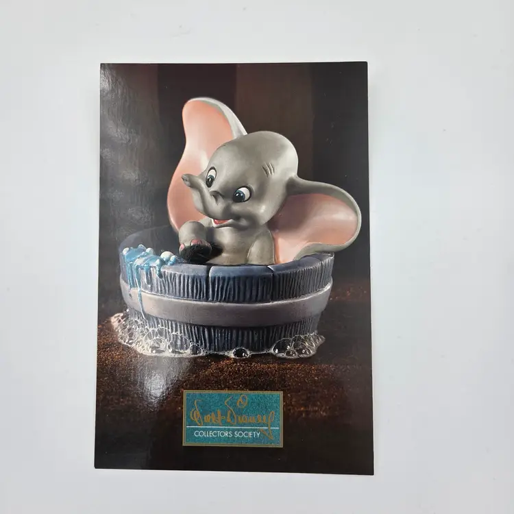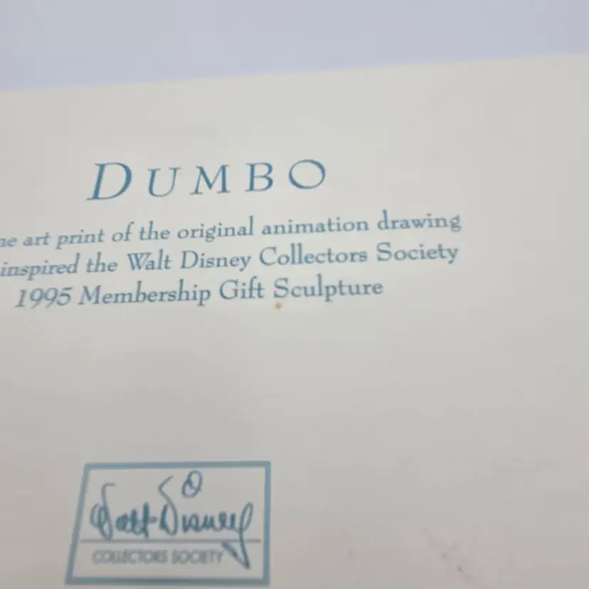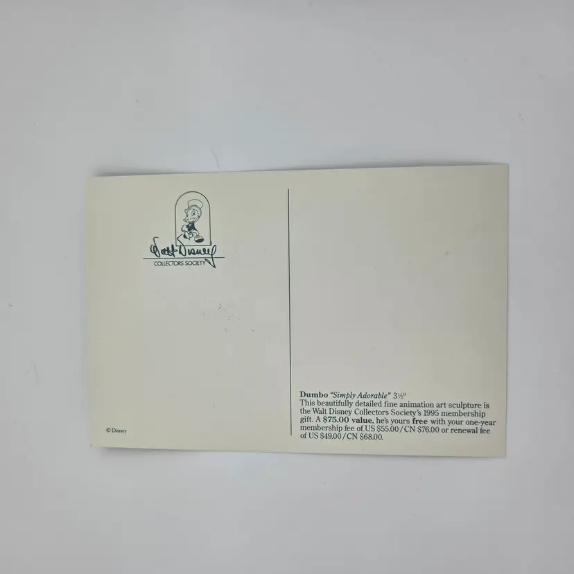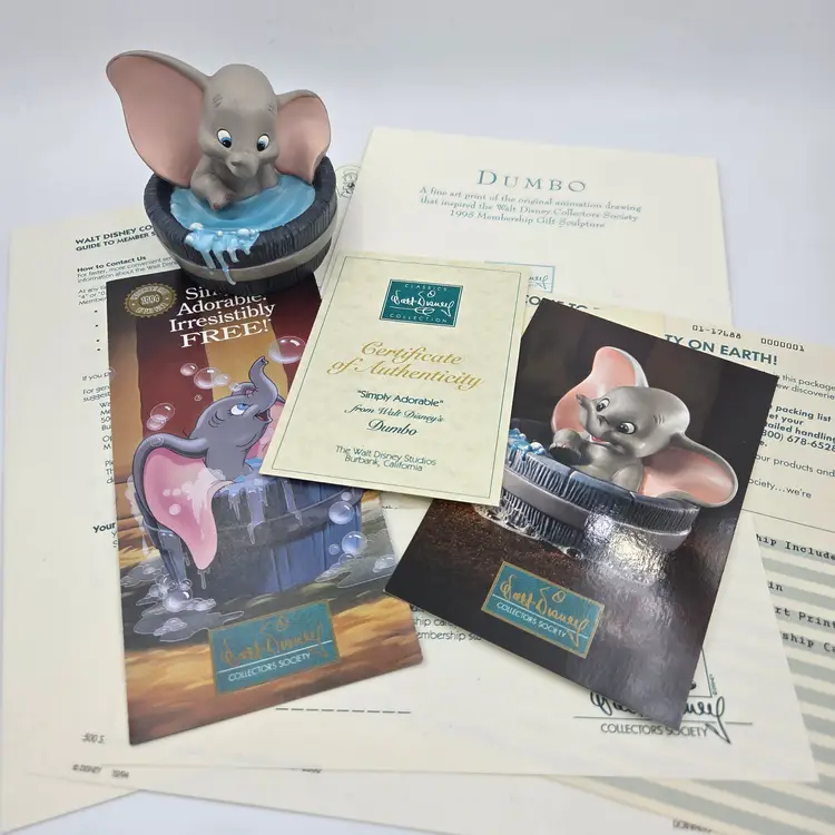 This listing includes the original membership package: • Dumbo “Simply Adorable” membership figurine (1995) • Original Certificate of Authenticity (COA) • Dumbo art print with envelope (animation drawing that inspired the sculpture) • Original WDCS membership paperwork (welcome letter, membership slip, inserts) • 1995 WDCS promotional brochure for the Dumbo gift • Glossy Dumbo figurine postcard