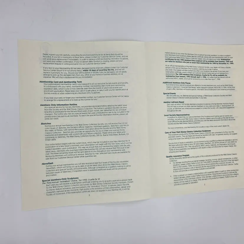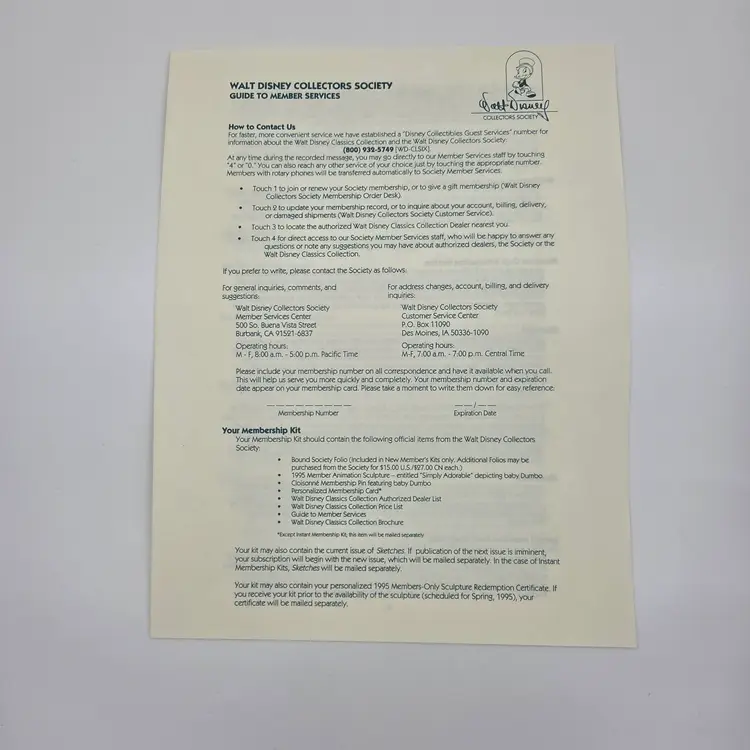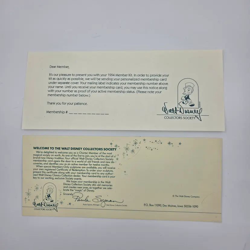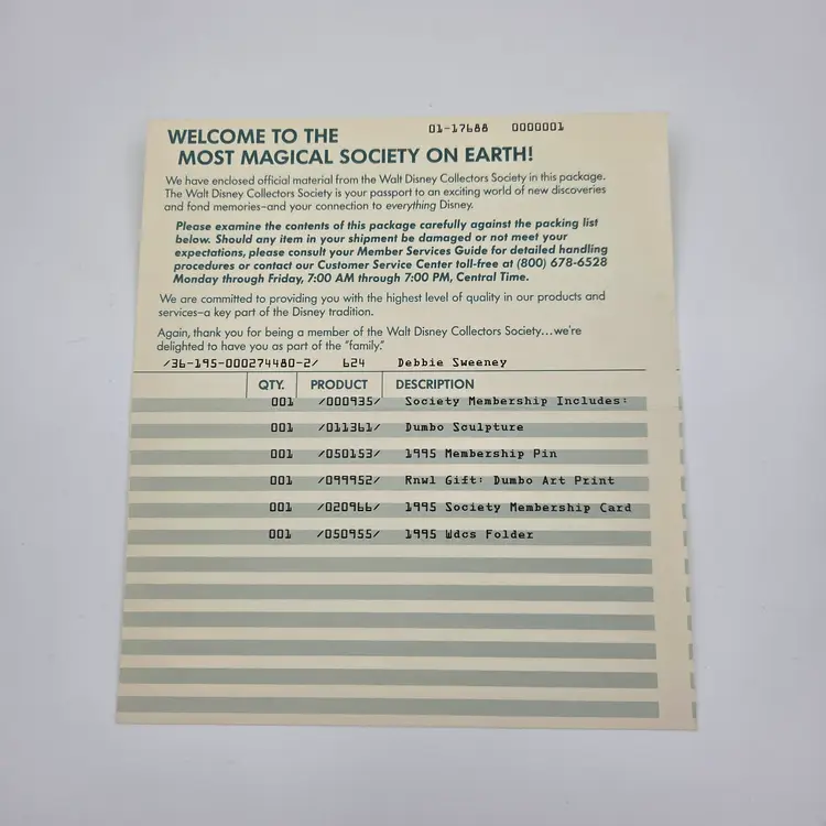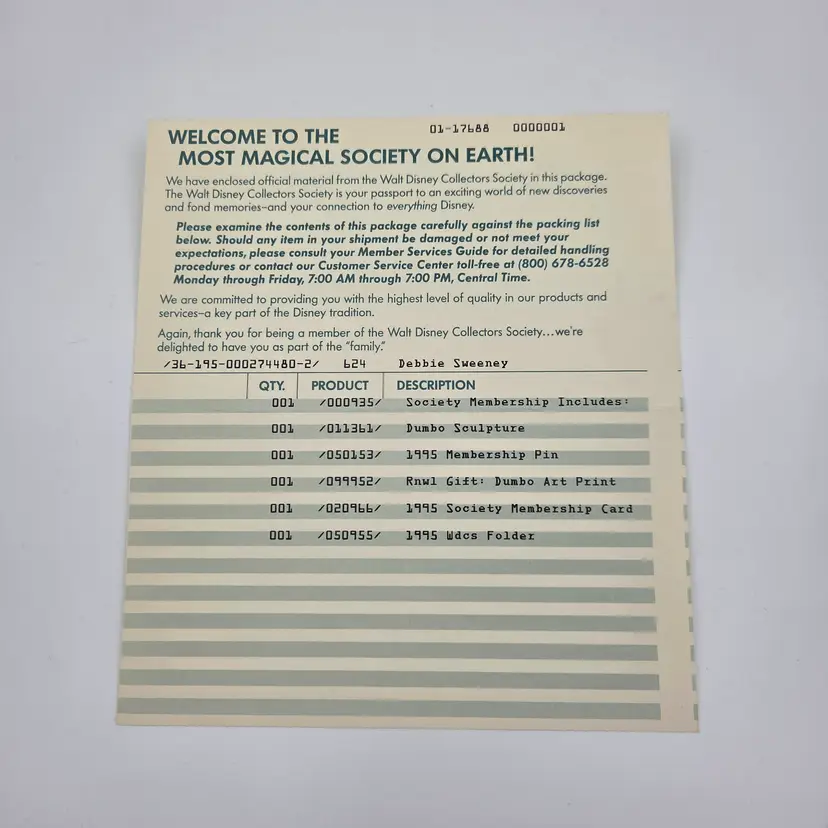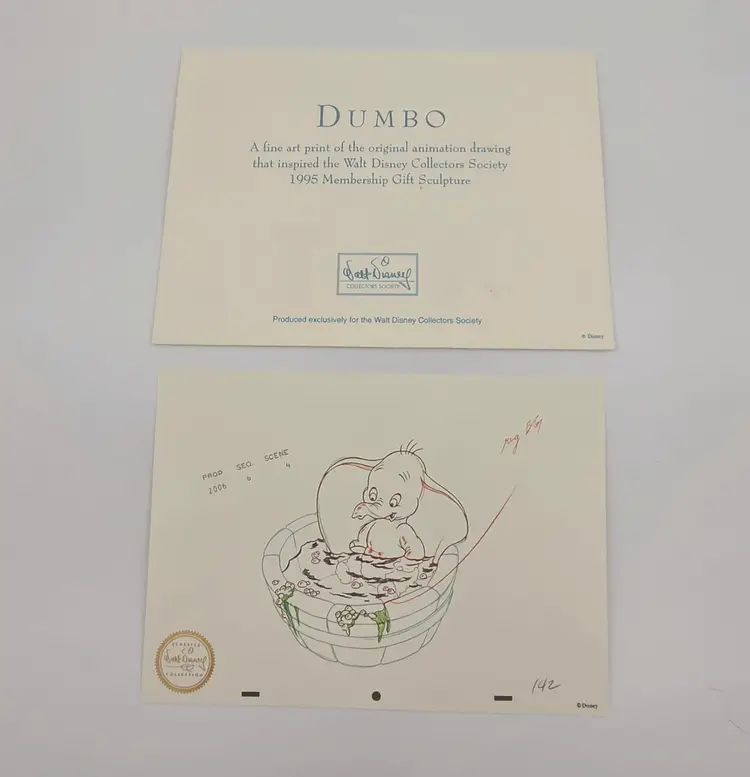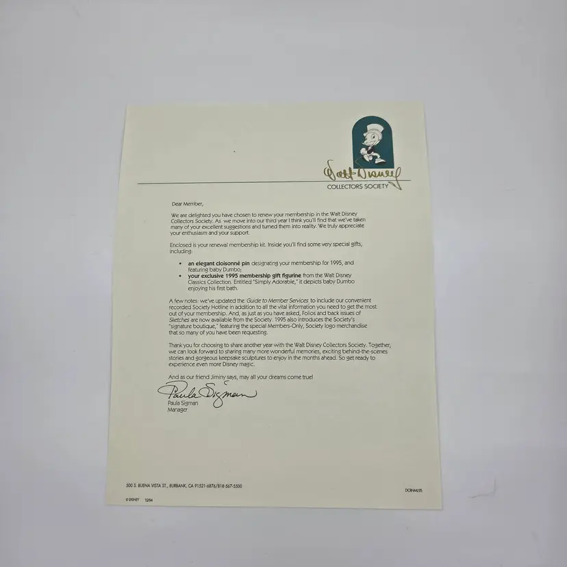 This listing includes the original membership package: • Dumbo “Simply Adorable” membership figurine (1995) • Original Certificate of Authenticity (COA) • Dumbo art print with envelope (animation drawing that inspired the sculpture) • Original WDCS membership paperwork (welcome letter, membership slip, inserts) • 1995 WDCS promotional brochure for the Dumbo gift • Glossy Dumbo figurine postcard