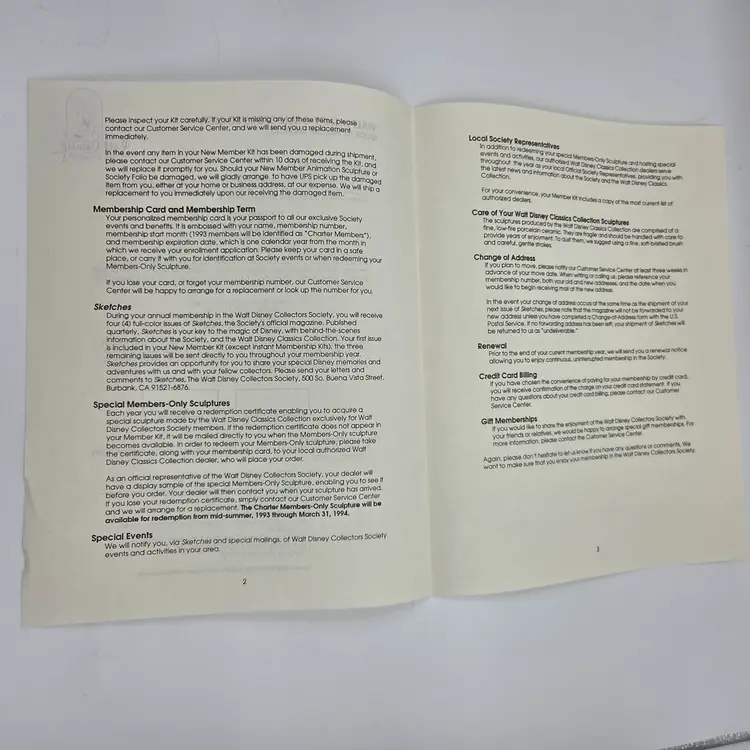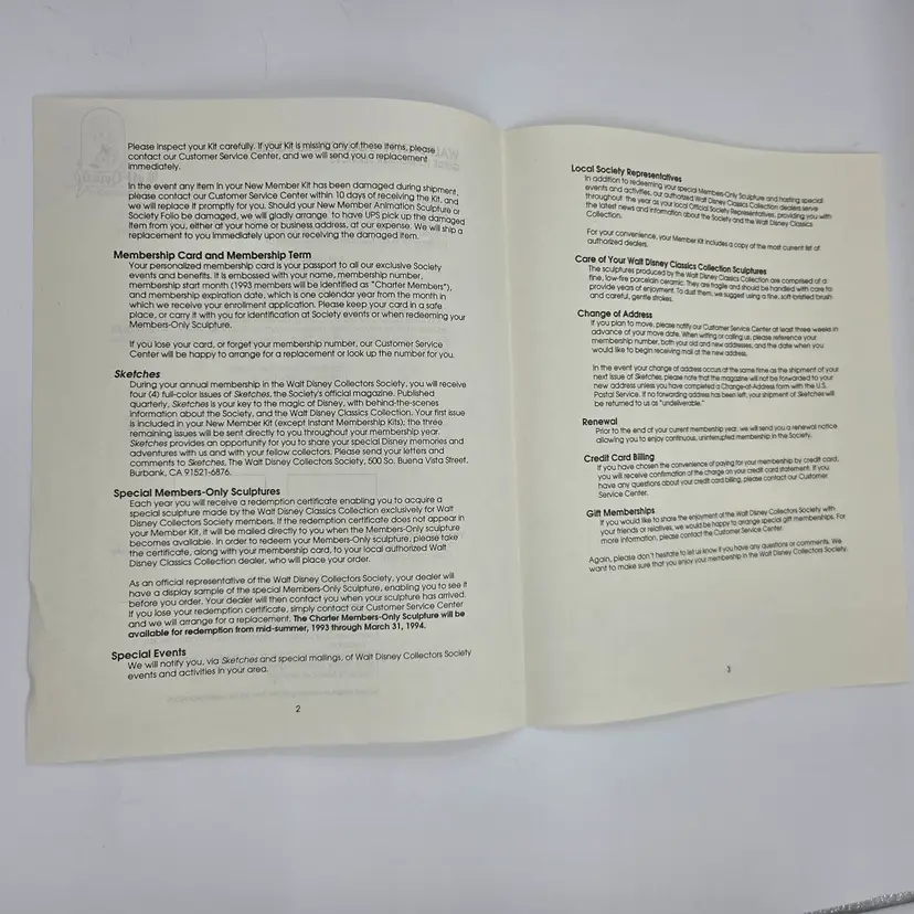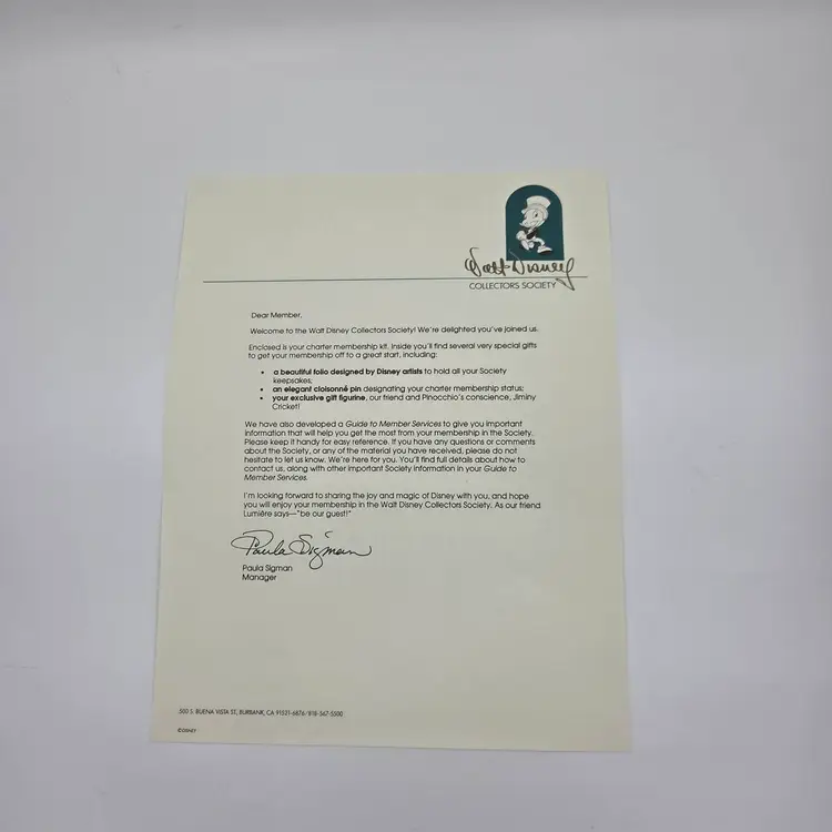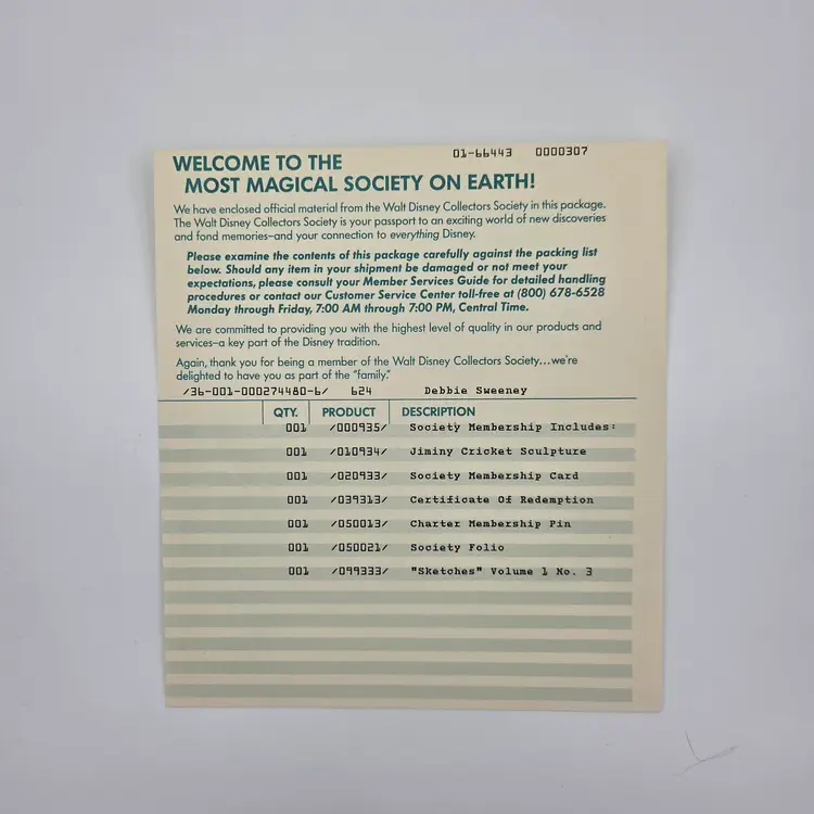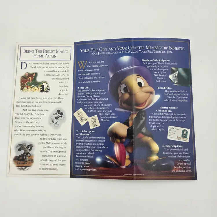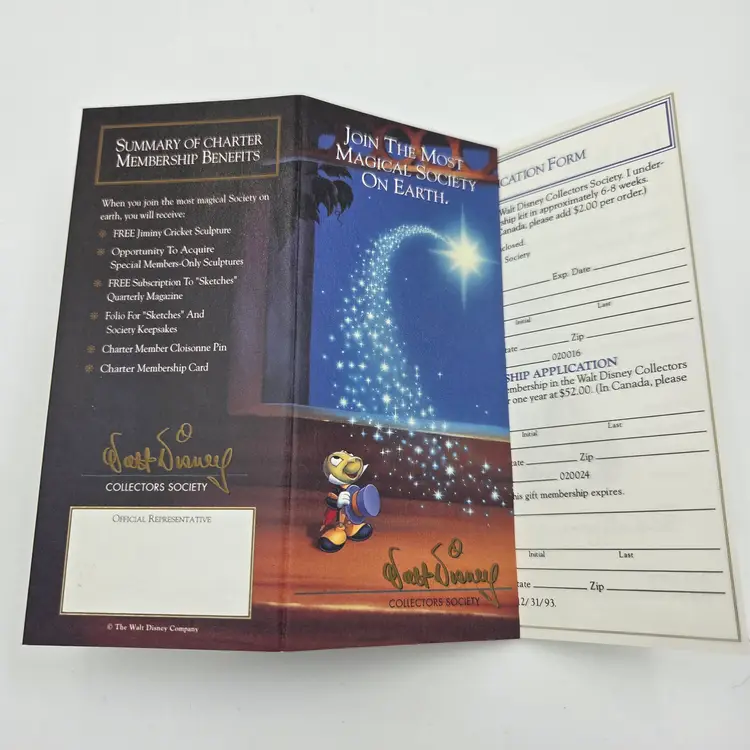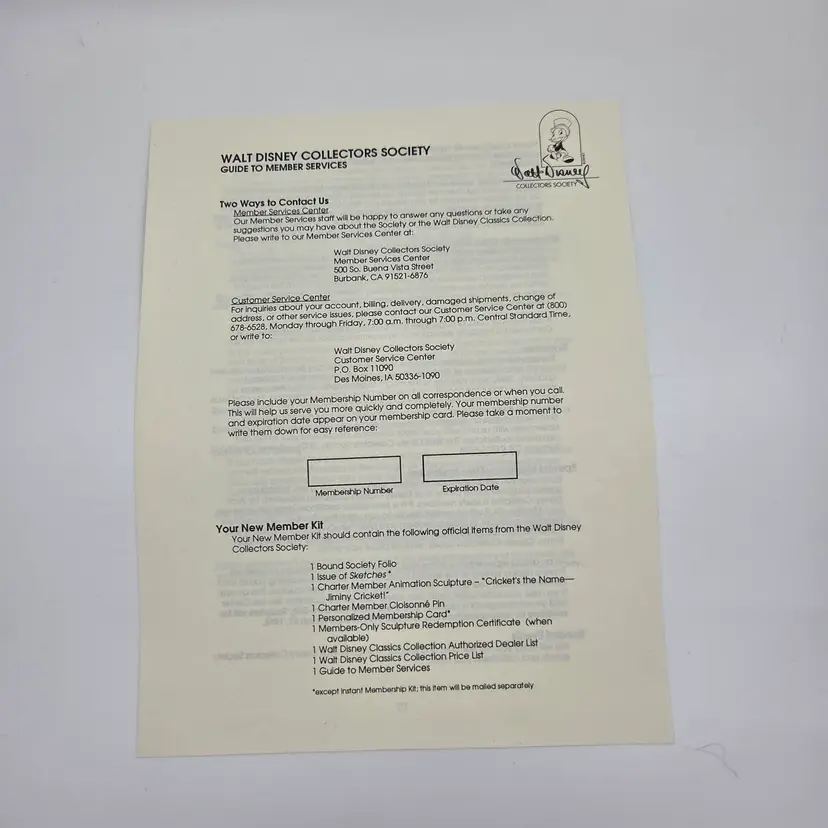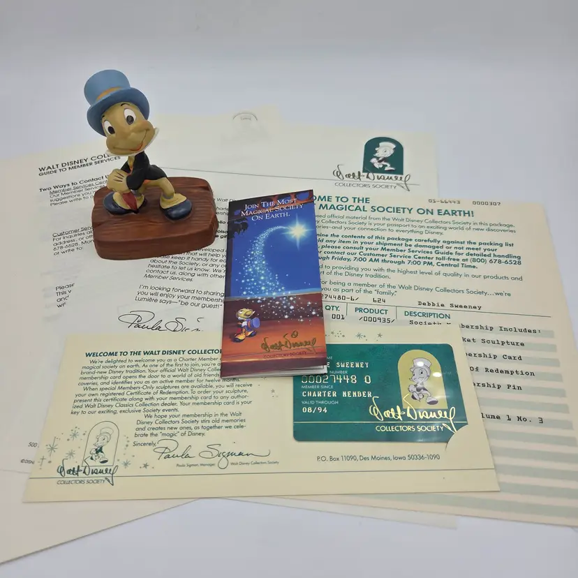 This listing is for a complete membership package, not just the figurine. Included are: • Jiminy Cricket sculpture (1993 WDCS Charter Membership Gift) • Original membership paperwork • Charter Member card with Jiminy illustration • Welcome letter, membership guide, and paperwork inserts