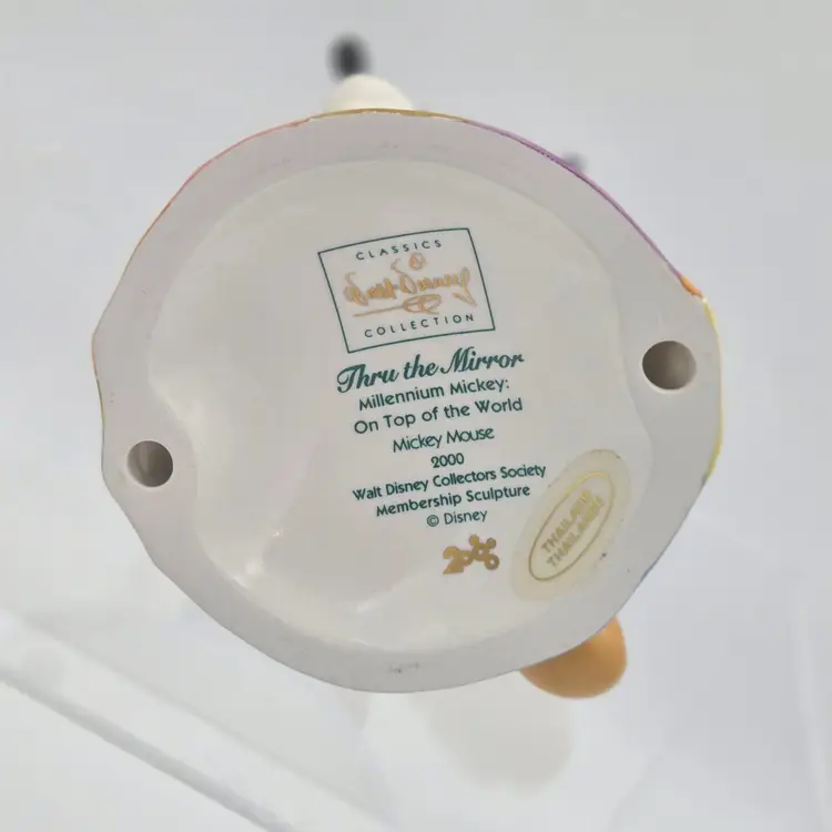 In the year 2000, the Walt Disney Collectors Society introduced a charming piece celebrating Mickey's timeless appeal. "Thru the Mirror" captures Mickey Mouse dancing atop a colorful globe, symbolizing his global influence. Accompanied by a detailed cloisonné pin, this sculpture not only showcases craftsmanship but also embodies the spirit of adventure and nostalgia.