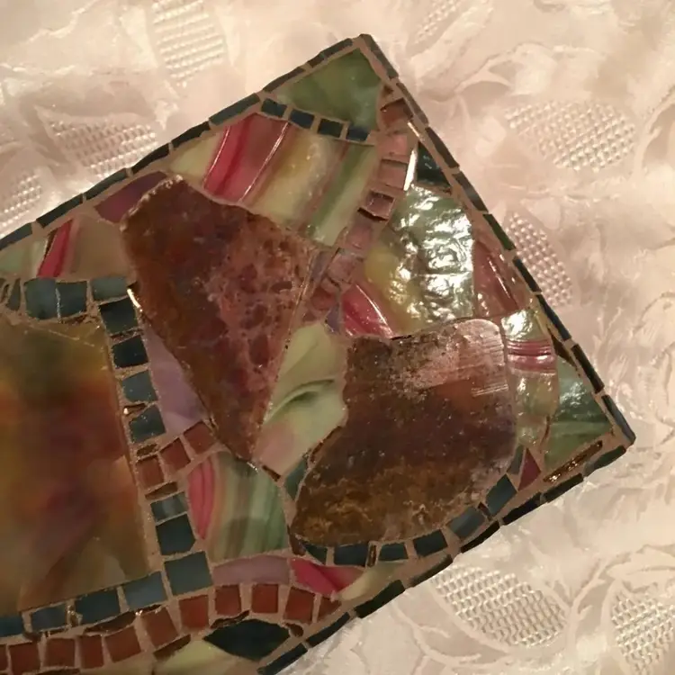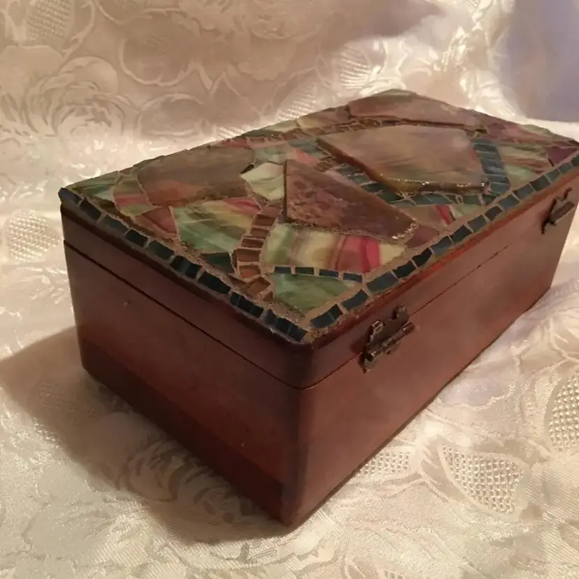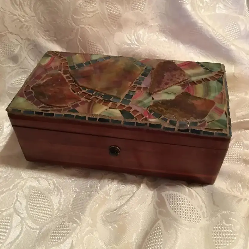 Mosaic Box: Beautifully coordinated specialty glass, stained glass and agate on this treasure box! It is a vintage Lane solid cedar box, with an aged appearance. Mosaic is mauve, burgundy, green and blue with shades of browns and creams. Glints of gold mirror sprinkled throughout. Has installed hardware to safely stay open and then release to close.