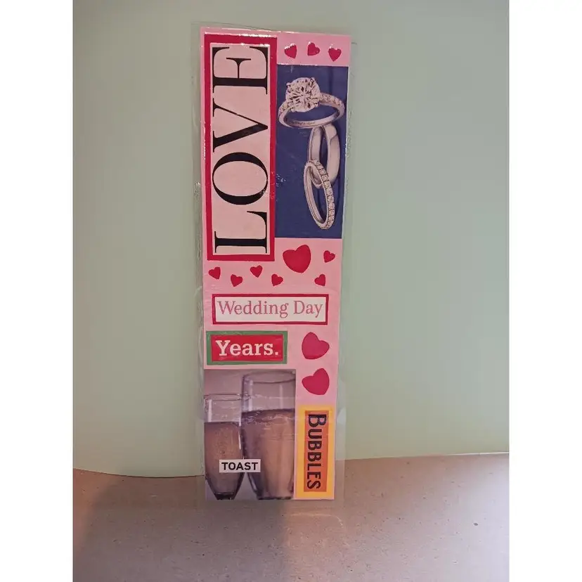 Front and back pictured. All content sourced from old magazines from 1940s to present, and an occasional found sticker. Unique one-of-a-kind art piece. Approximately 8 3/4" x 2 3/4".