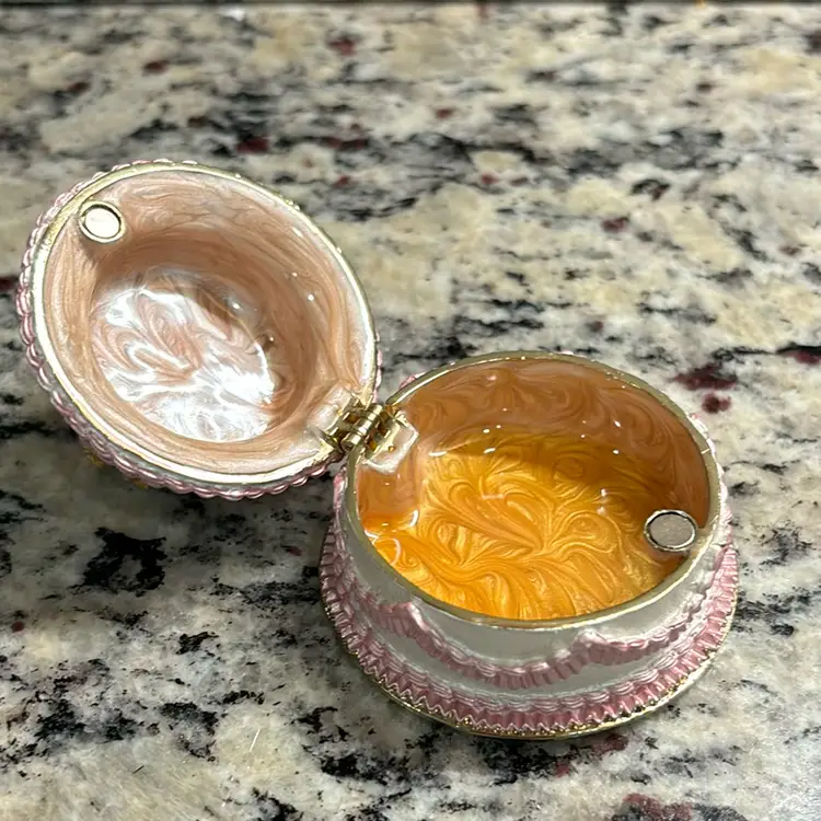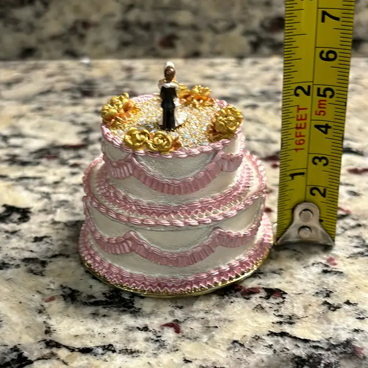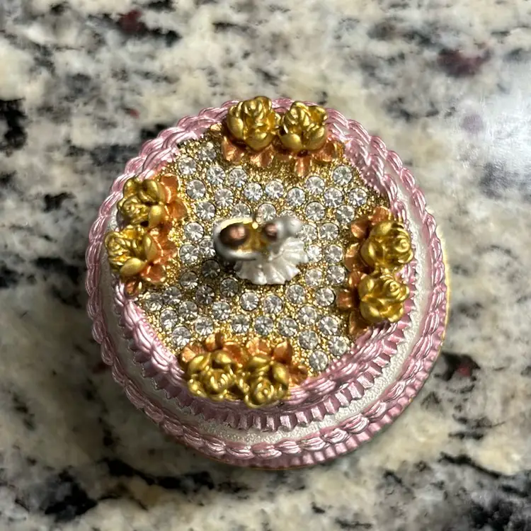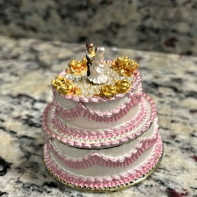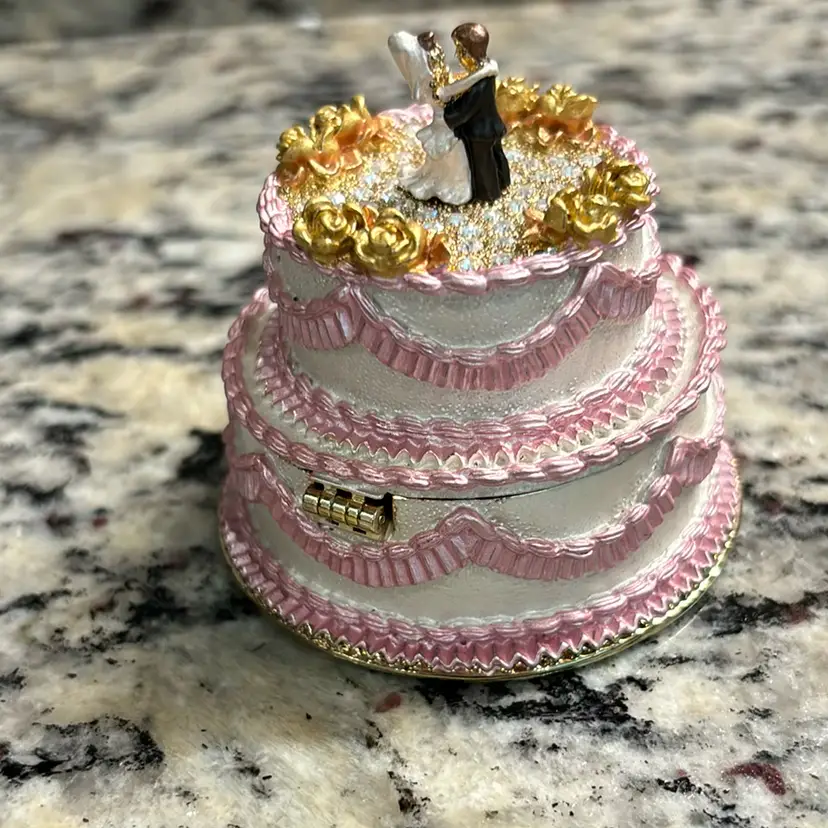 Pretty in pink wedding cake hinged trinket box featuring bride and groom on top of jeweled cake top. Opens to reveal magnetic closure and beautiful swirled interior.