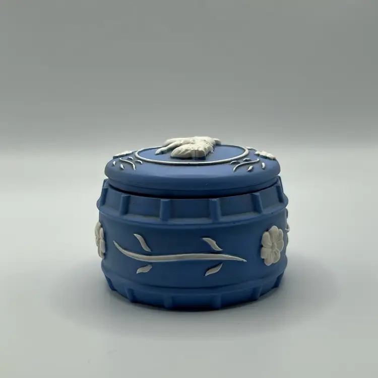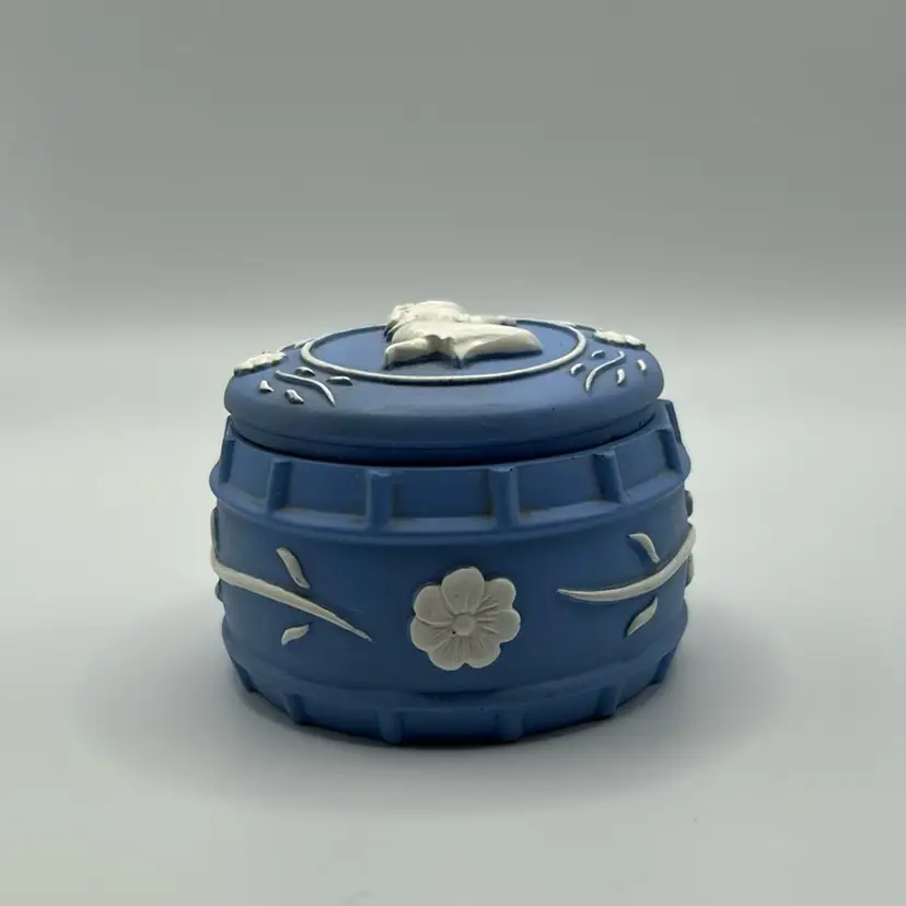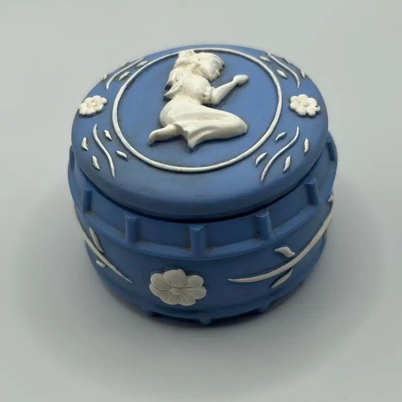 This piece is a vintage Wedgewood jasperware trinket box featuring a cameo design. It stands one and 3/4 inches tall and is 2 inches across there are no condition issues.