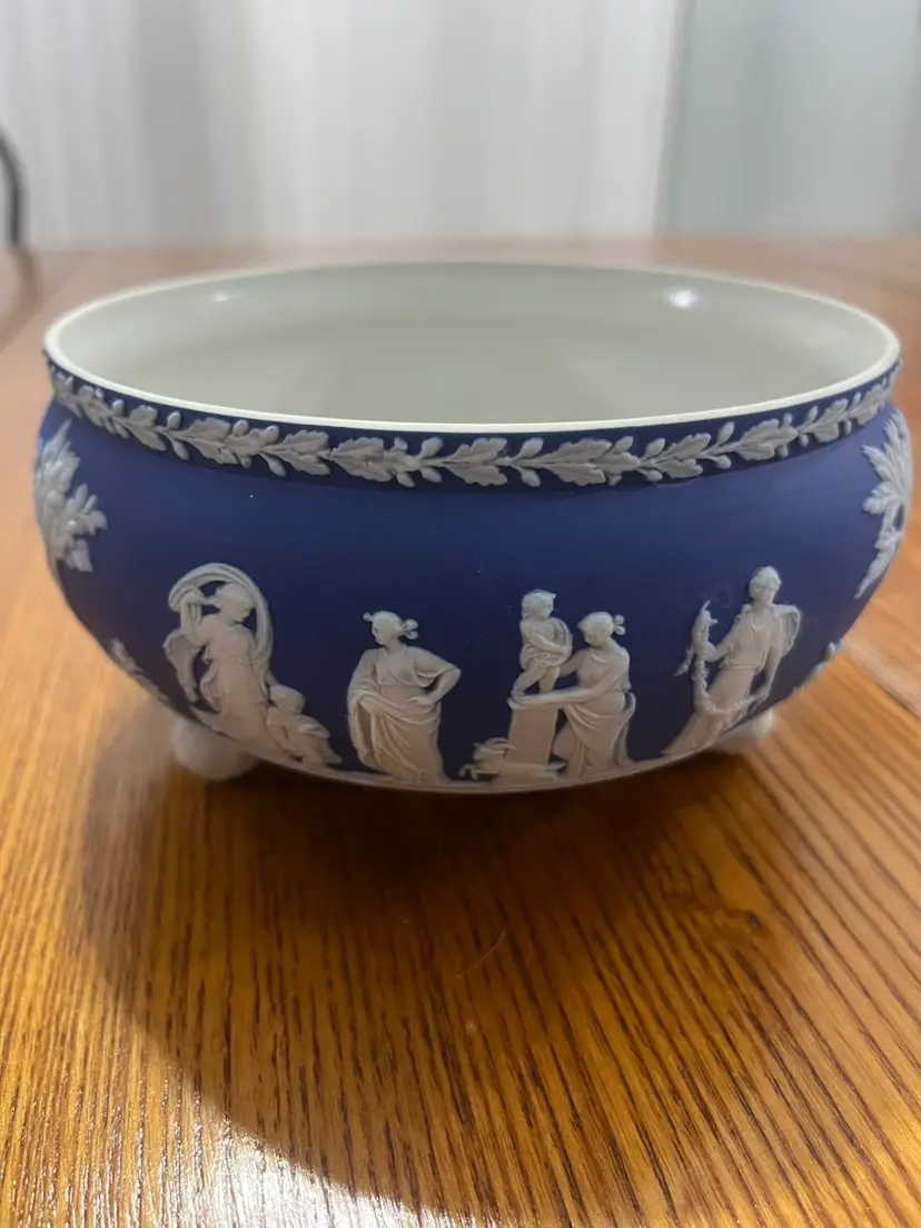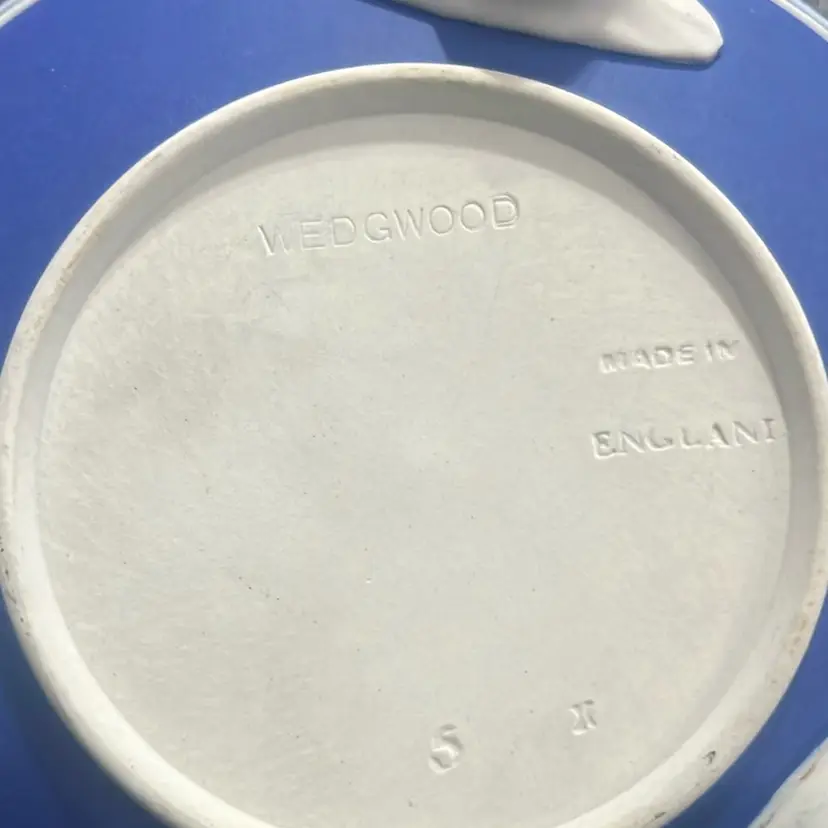 Wedgwood Jasperware is a type of stoneware developed by Josiah Wedgwood in the 1770s. It is characterized by its matte, unglazed finish and the application of relief decorations, often in white, depicting classical scenes, figures, and motifs. The most famous Jasperware color is a deep blue, known as "Wedgwood blue" or "Portland blue," which is prominently featured in this piece.