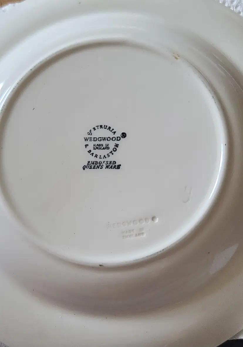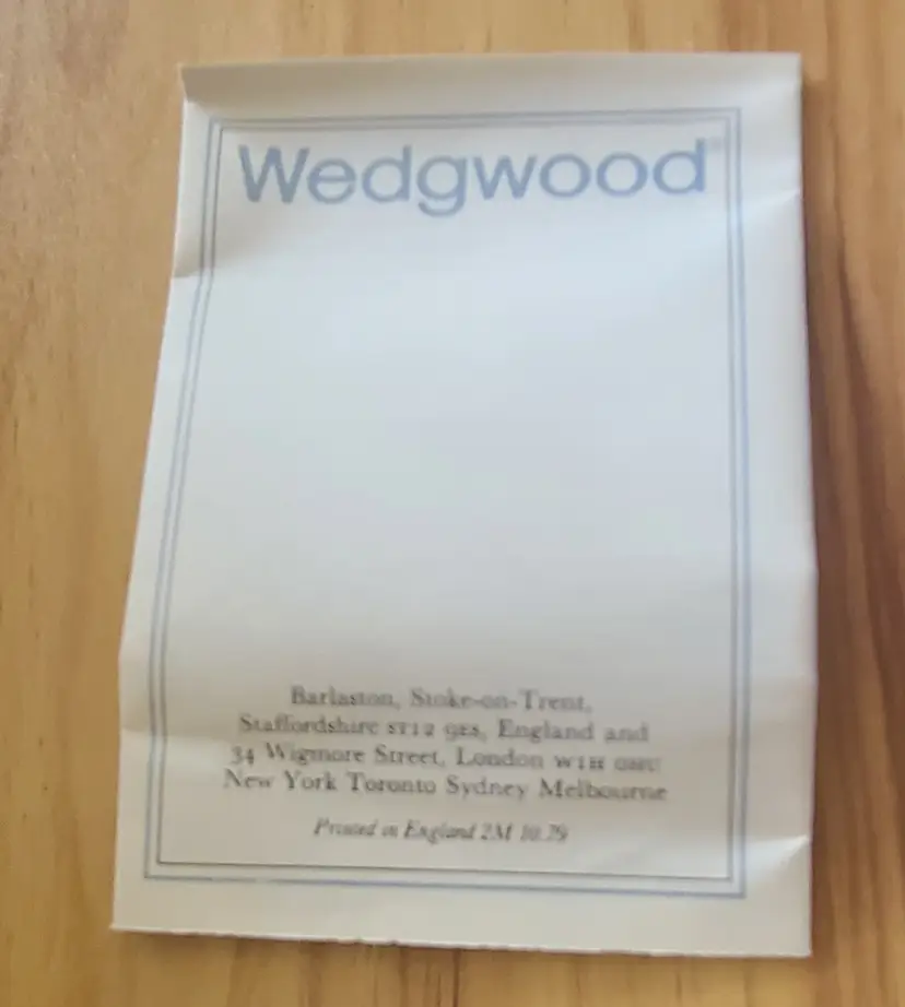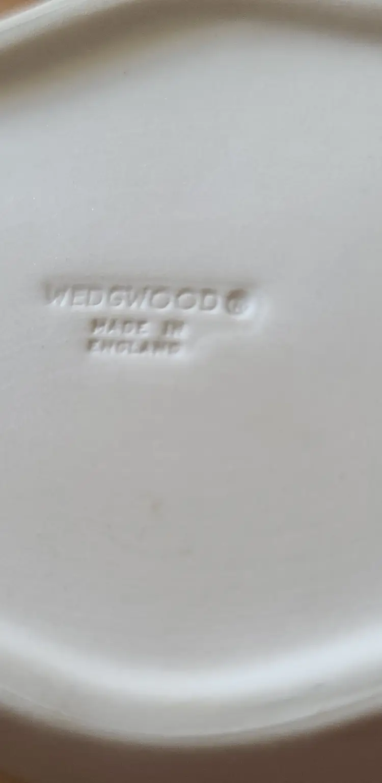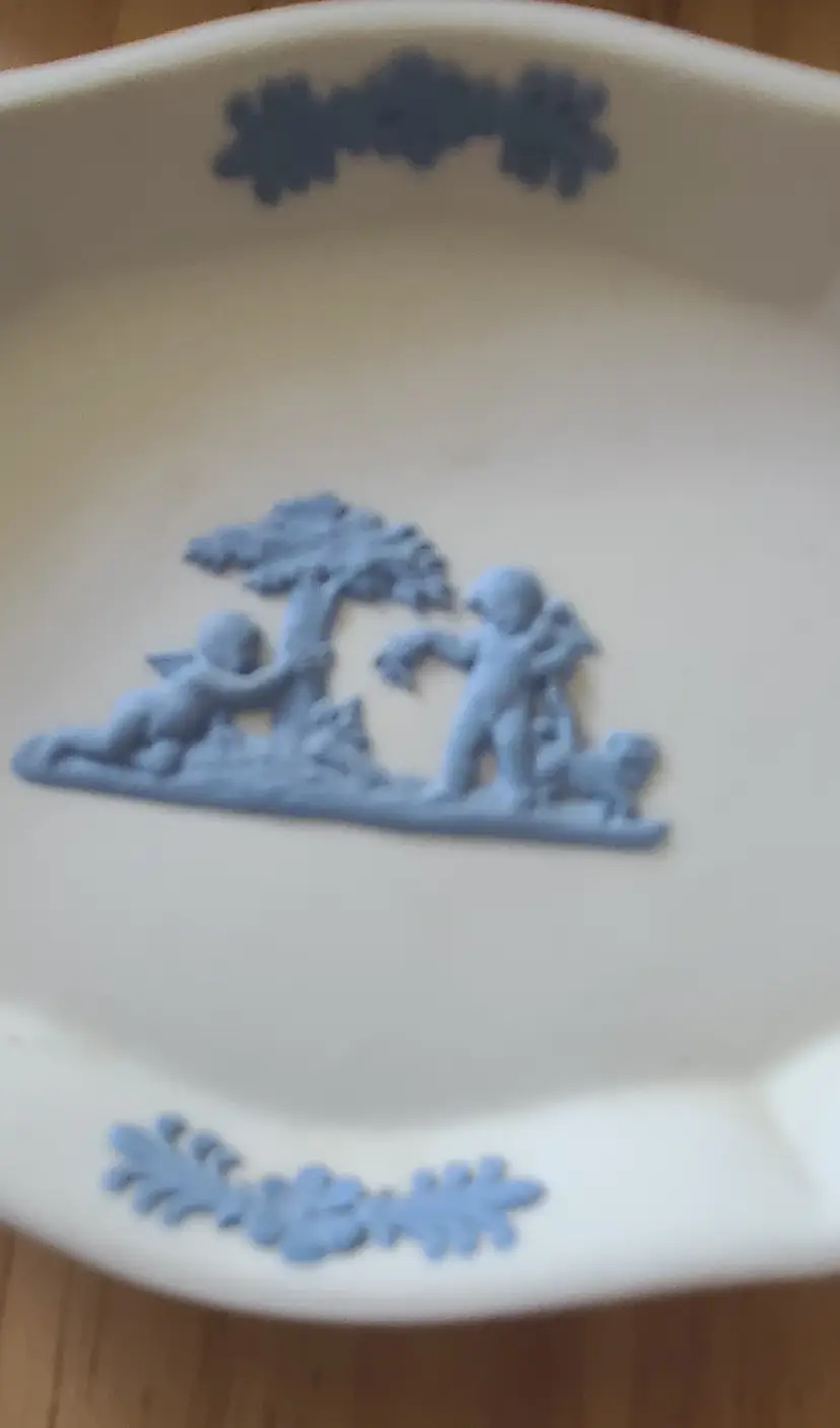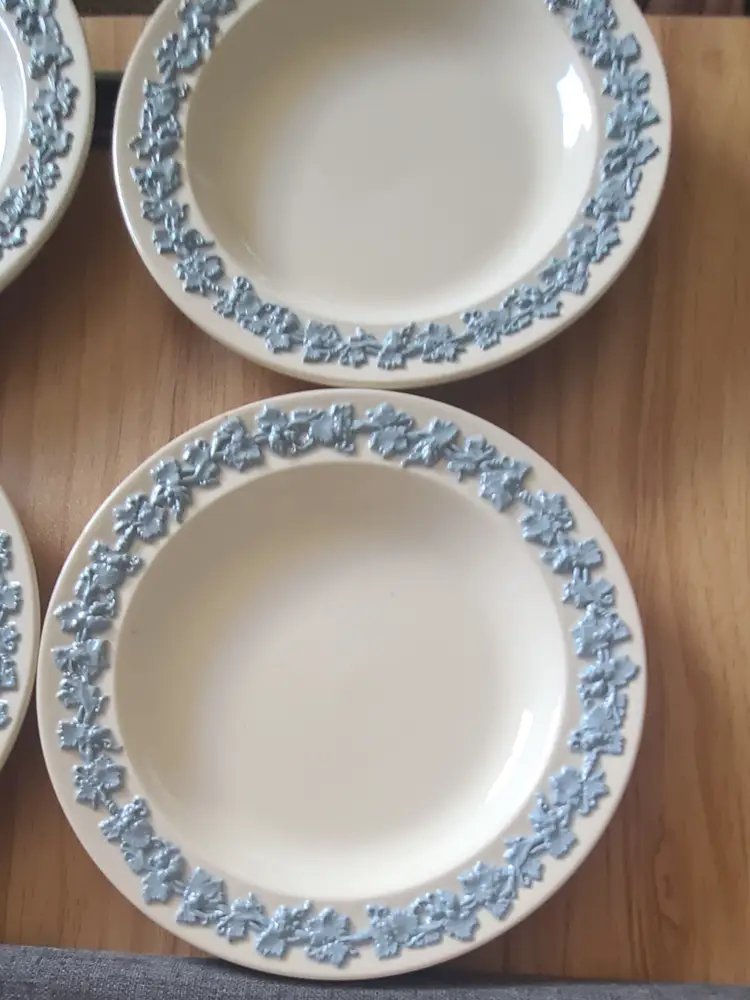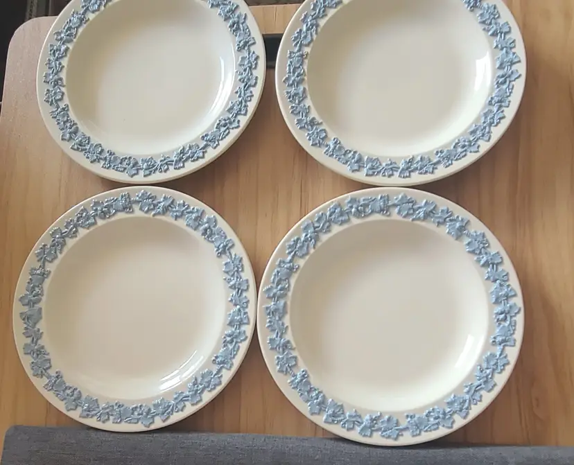 Blue/Lavendar on White Wedgwood collection, 5 pieces. 4 small salad or dessert plates and 1 small trinket dish. Trinket dish in it's box with booklet. All in very good condition. Back of some plates have sticker residue.