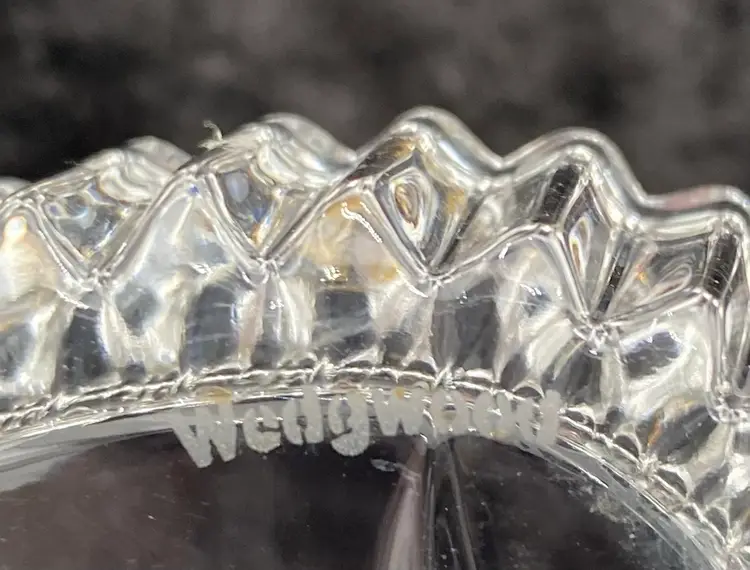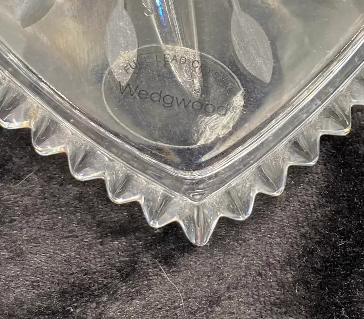 Crafted with precision, this Wedgwood heart-shaped trinket box exudes elegance and is made from full lead crystal, ensuring durability and a classic aesthetic. Originating from Germany, the piece measures 4.3 inches in width and stands 1.6 inches tall, weighing in at 15.3 ounces. It's an exquisite addition to any collection or as a stand-alone keepsake. The box comes with its original sticker and 'Wedgwood' etched on the bottom side, affirming its authenticity and provenance. With beautiful etching and frosted leaves, the attention to detail and quality are evident, making it an ideal treasure for holding small jewelry or keepsakes.