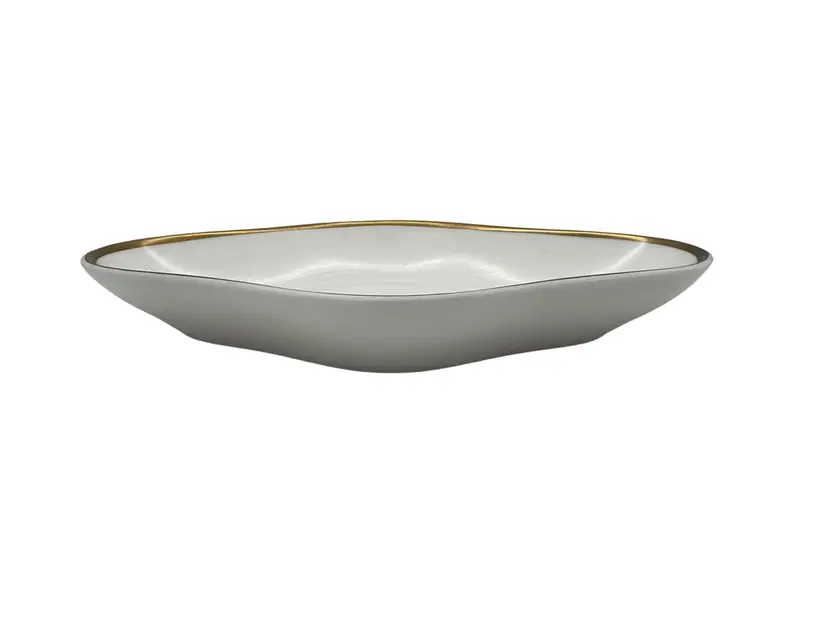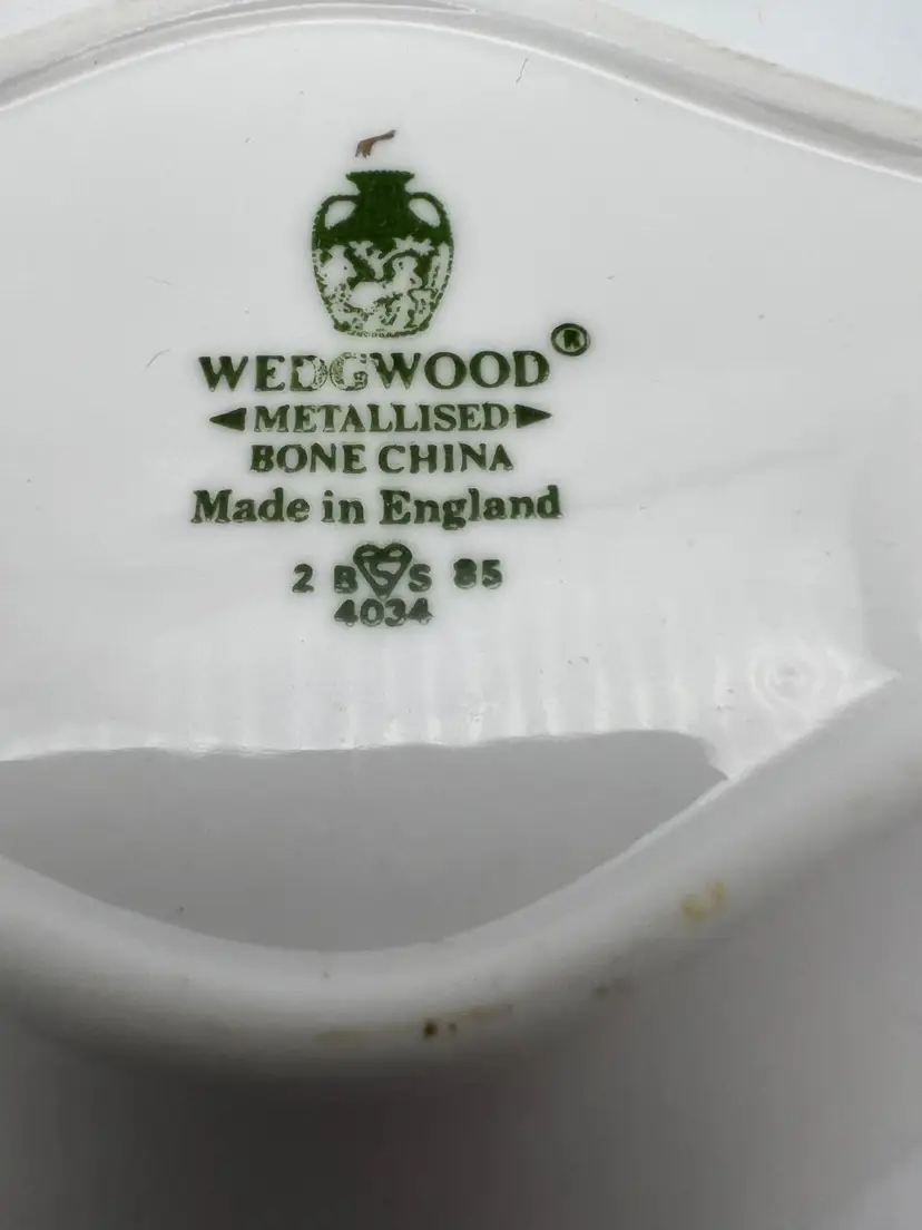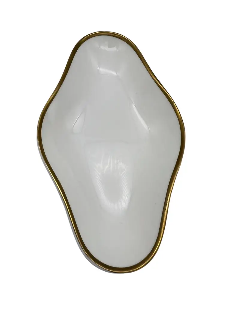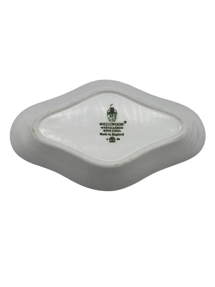 Wedgwood Metallised bone china relish dish in white with gold trim. The dish measures 6" x 3.5". It was made in England and is number 4034.