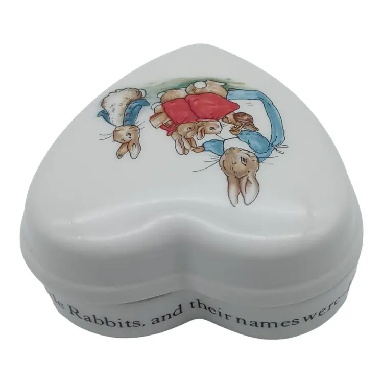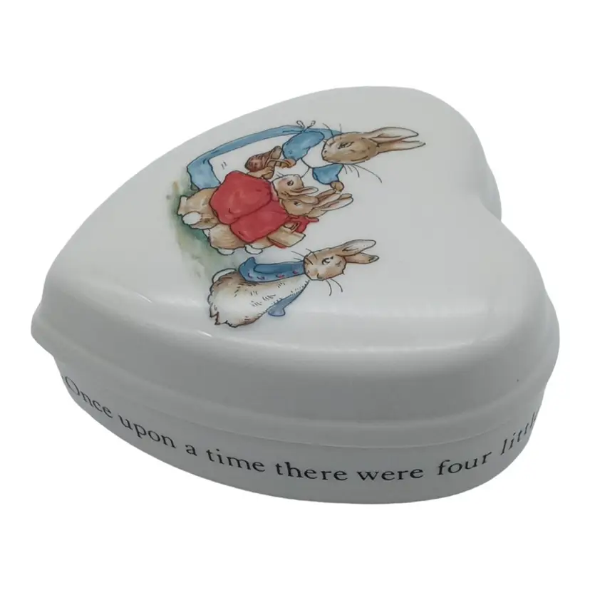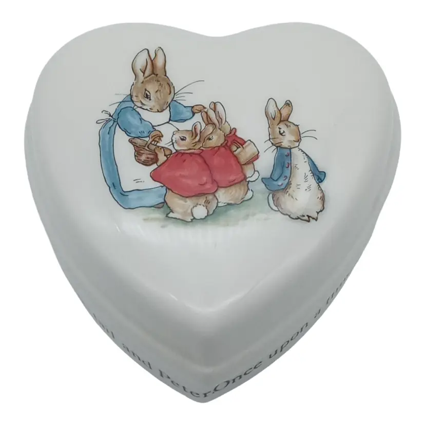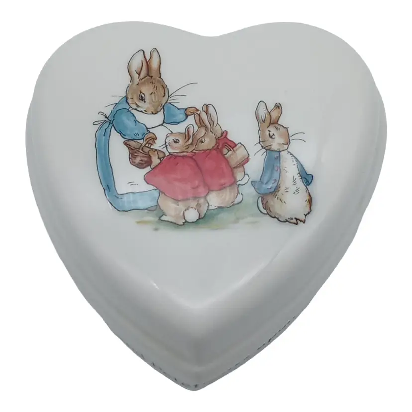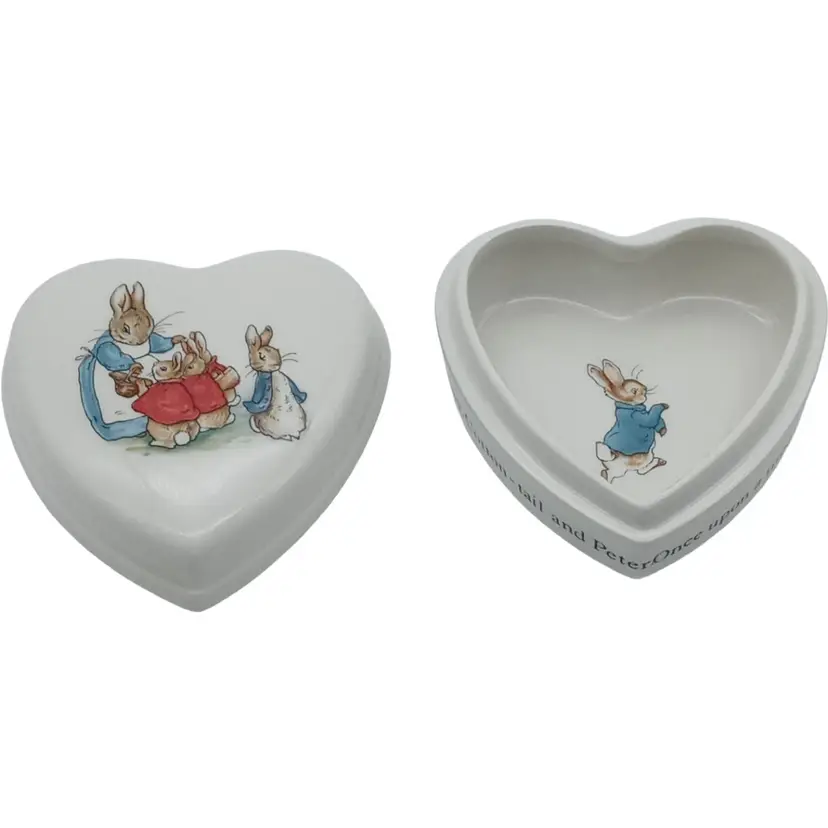 Wedgwood Peter Rabbit Beatrix Potter Porcelain Heart Shaped Trinket Box with Lid Like New. Excellent Condition. No Signs of Use. No Chips. No Cracks. No Damage. Please Look at Pictures to See Item's Condition. Words on trinket dish: "Once upon a time there were four little rabbits and their names were - Flopsy, Mopsy, Cotton-tail and Peter." Material: Bone China Measures: 4.5" L x 4" W x 2" H Made in England