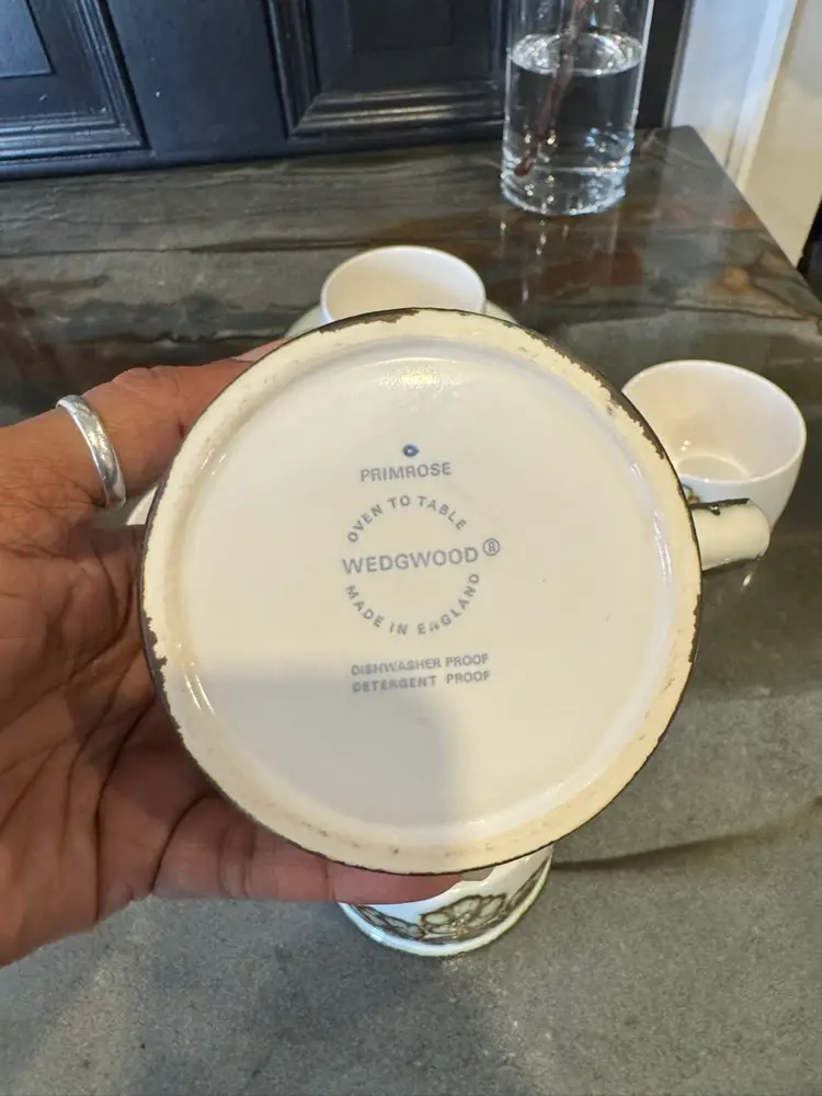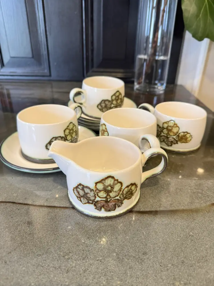 Serve tea in timeless elegance. Beautiful Wedgwood Primrose pattern. Four teacups and saucers and one creamer. Cups hold 8 ounces.