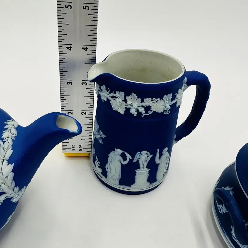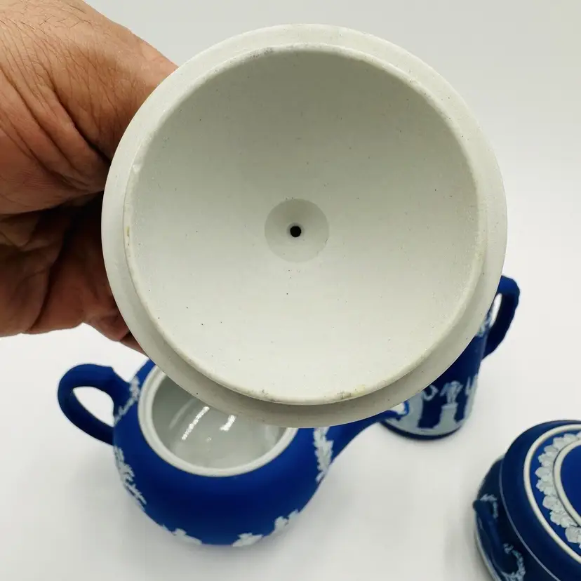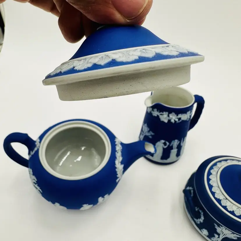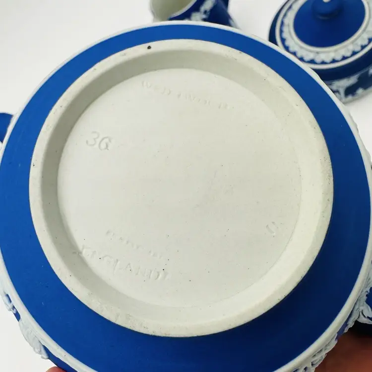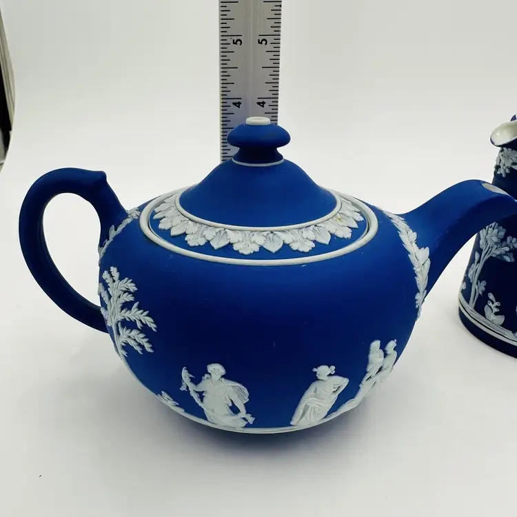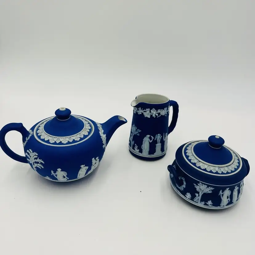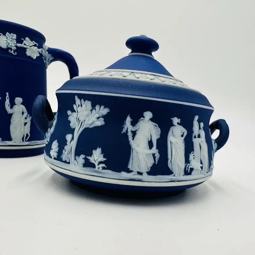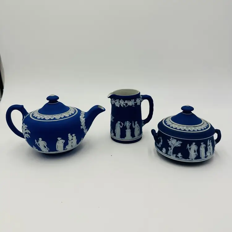 Handmade: Yes Item Width: 6 in Pattern: Jasperware Dipped Blue Number of Items in Set: 3 Vintage: Yes Size: Medium Country/Region of Manufacture: United Kingdom Material: Porcelain Year Manufactured: 1949 Number of Compartments: 3 Shape: Abstract Packaging: Unboxed Finish: Matte Franchise: Wedgwood Jasperware Brand: Wedgwood Antique: Yes Color: Blue Set Includes: Sugar Bowl Original/Licensed Reproduction: Original Item Depth: 5 in Type: Tea Set