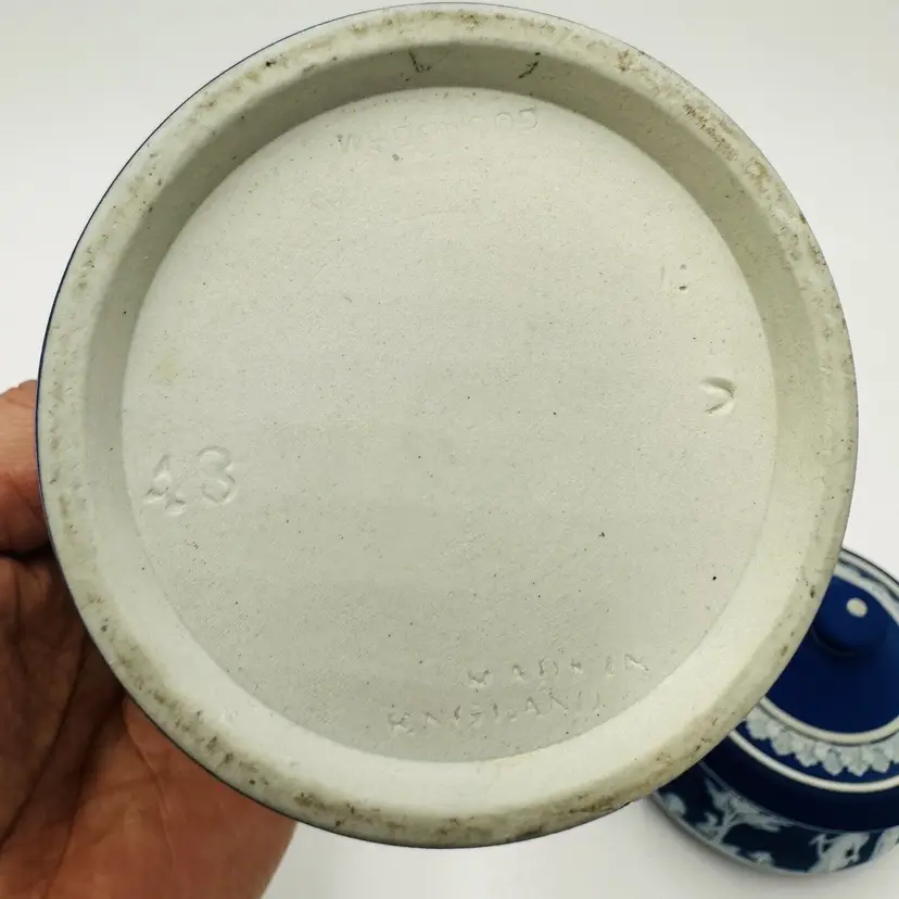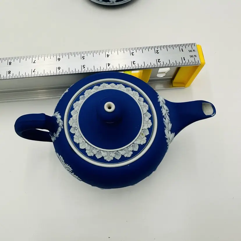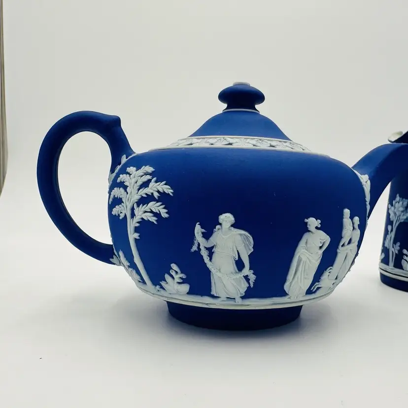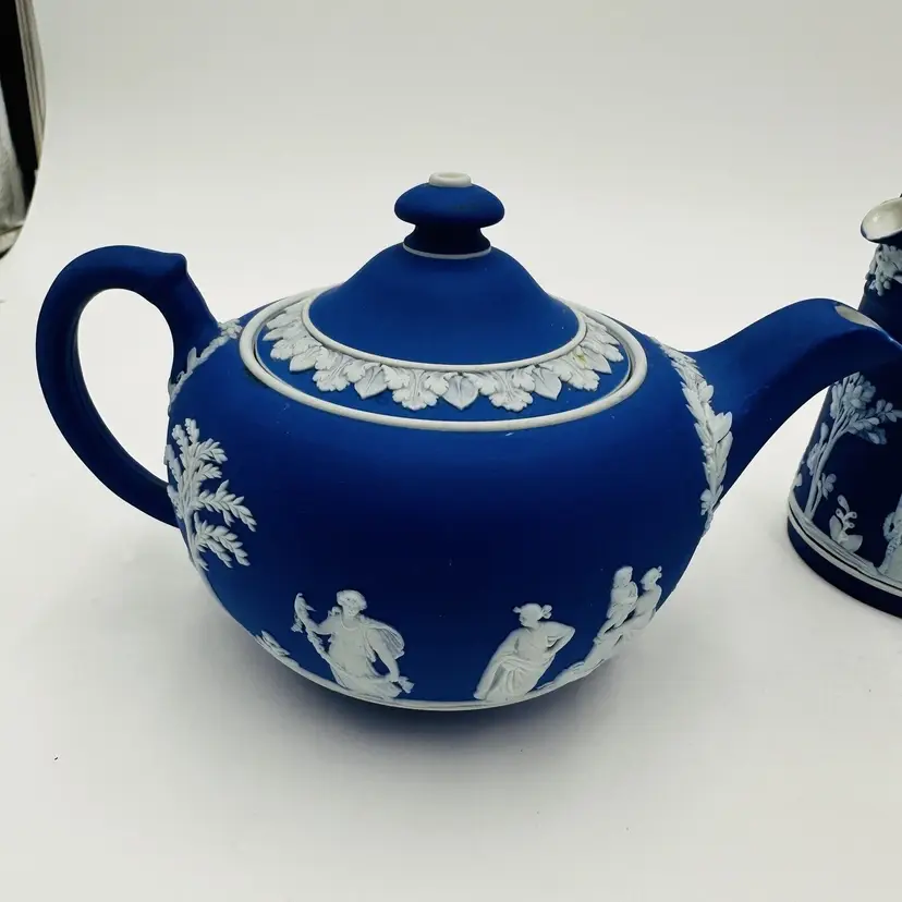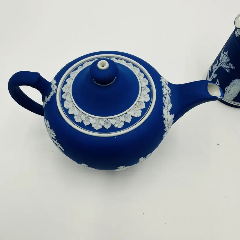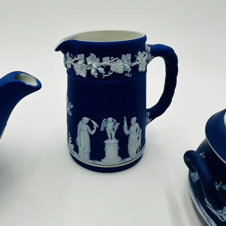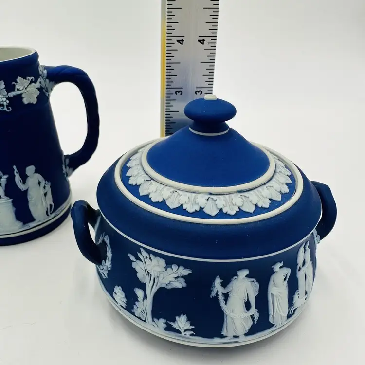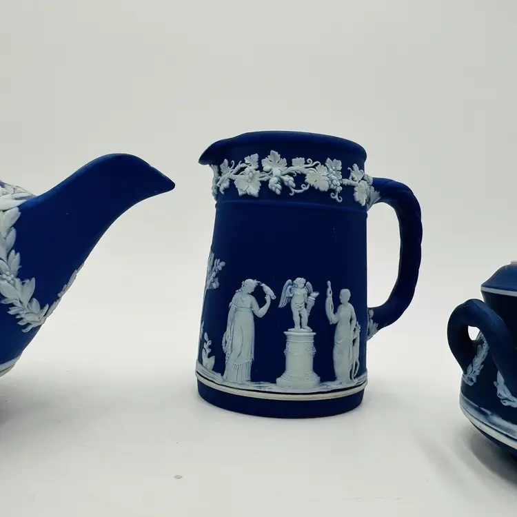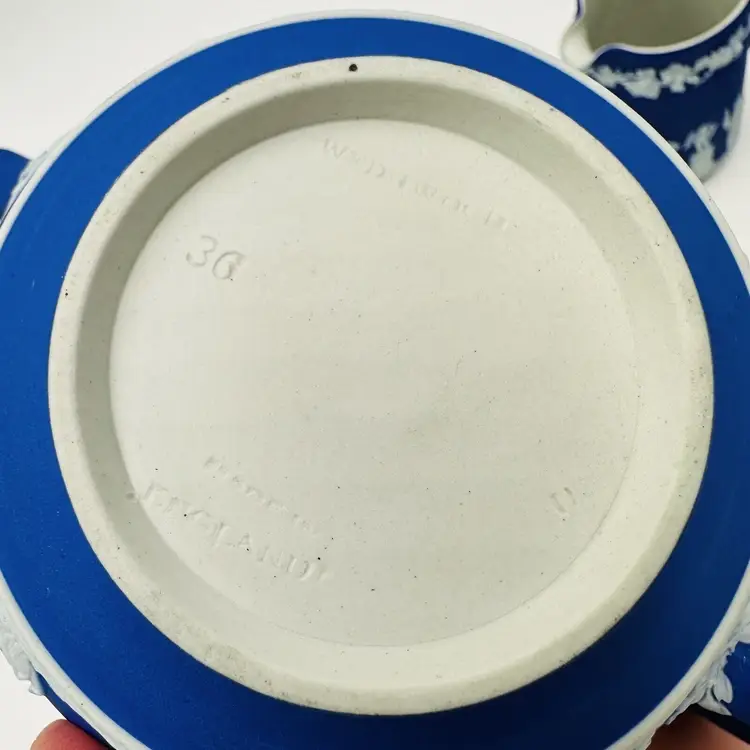 Handmade: Yes Item Width: 6 in Pattern: Jasperware Dipped Blue Number of Items in Set: 3 Vintage: Yes Size: Medium Country/Region of Manufacture: United Kingdom Material: Porcelain Year Manufactured: 1949 Number of Compartments: 3 Shape: Abstract Packaging: Unboxed Finish: Matte Franchise: Wedgwood Jasperware Brand: Wedgwood Antique: Yes Color: Blue Set Includes: Sugar Bowl Original/Licensed Reproduction: Original Item Depth: 5 in Type: Tea Set