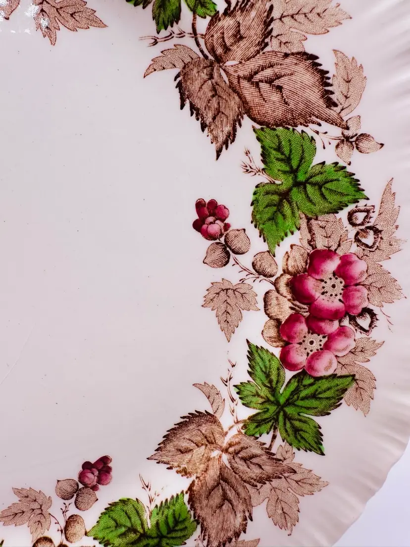 This item is a vintage Wedgwood dinner plate in the "Wildbriar" pattern, featuring a creamy white background with a border of brown and pink floral designs and a textured, ruffled edge.