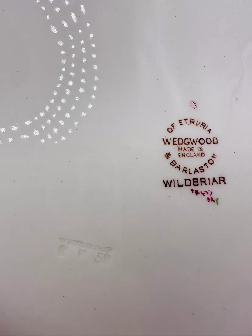 This item is a vintage Wedgwood dinner plate in the "Wildbriar" pattern, featuring a creamy white background with a border of brown and pink floral designs and a textured, ruffled edge.