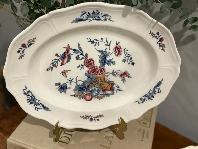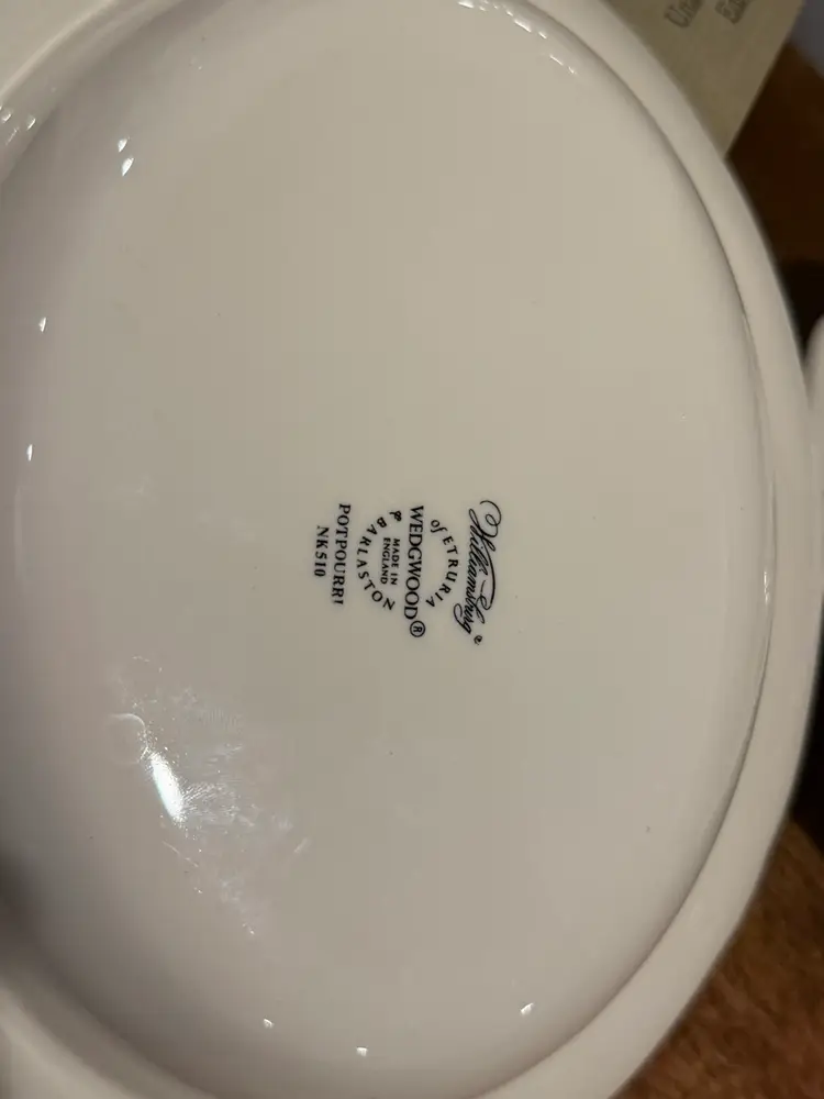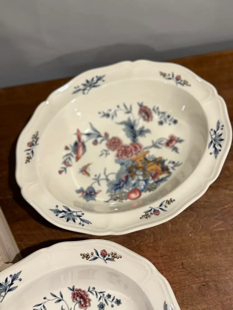 These exquisite Wedgwood Williamsburg Potpourri oval vegetable serving bowls and platter feature a beautiful floral and bird pattern. "Made in England" and part of the Etruria & Barlaston collection, this particular pattern is named 'Potpourri' (NK510). The bowls measure 9.75 inches. This set is perfect for serving at your next dinner party. Excellent pre-owned condition with no chips or cracks.