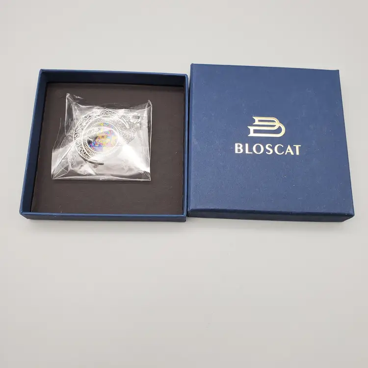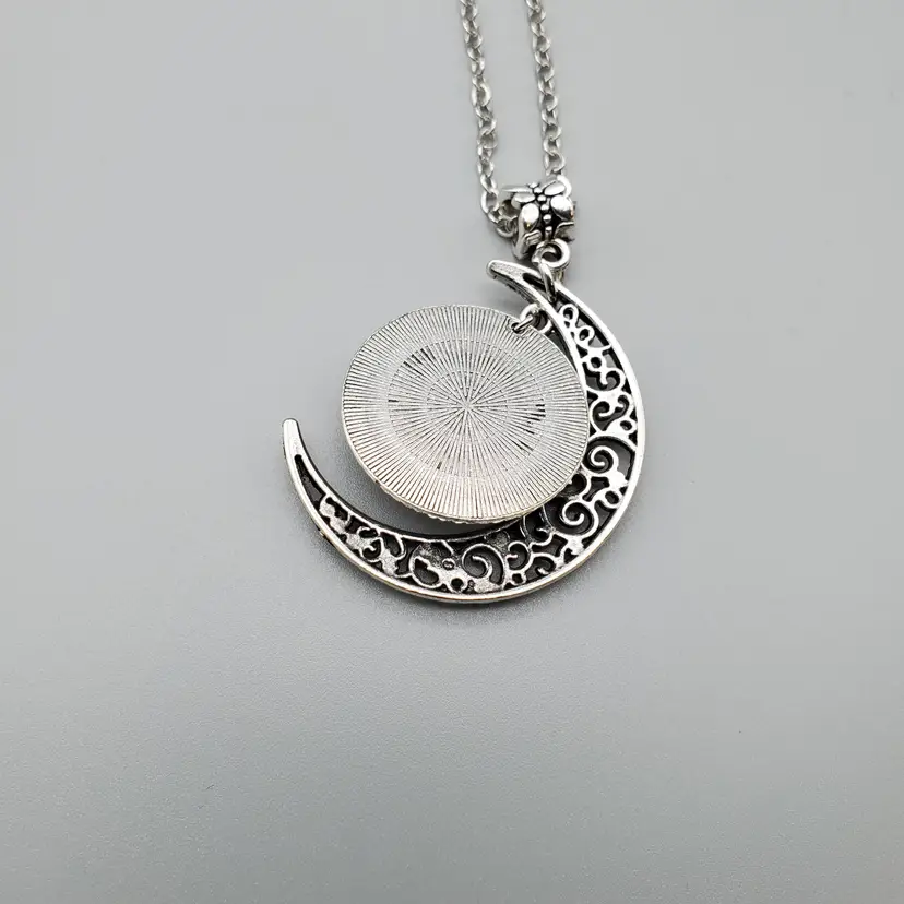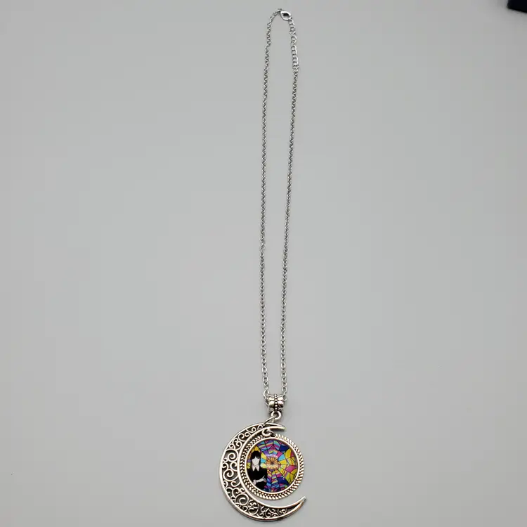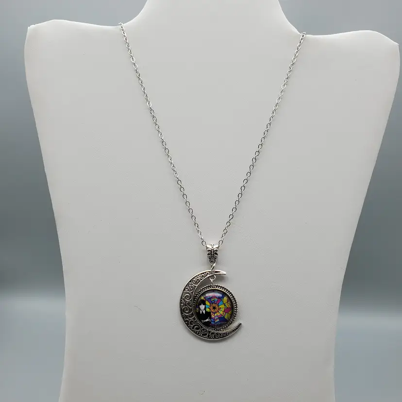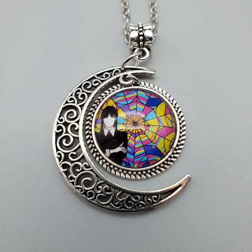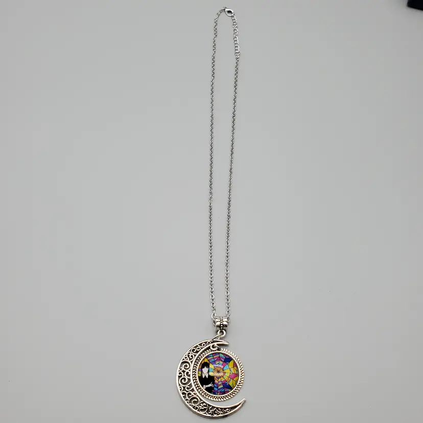 -Signed: Box Marked Bloscat-No Makers Mark on Necklace -Item: Wednesday Addams (From the Addams Family) Crescent Moon Necklace -Measurements: Appx 20" Length-Can be adjusted slightly at the neck for length-Pendant is appx 1 1/2" -Condition: New in Box-Some Boxes May have Minor Shelf Wear-Nothing Major -Accents/Features: Silver Tone Filigree Crescent Moon With Wednesday Addams in the multicolor Circle that fits inside the crescent -Year: ? -Material: Mixed Materials -Color: Silver, Multicolor