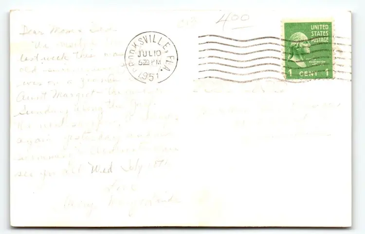 Posted with 1951 cancel. Real photo vintage postcard. Has slight impression front hand cancel, corner dings, and age wear. Stock #FL46.