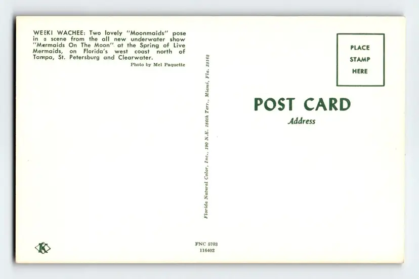 Number of Items in Set: 1 Unit of Sale: Single Unit Artist: Unknown Occasion: Sayings & Quotes Size: Standard (5.5 x 3.5 in) Signed: No Custom Bundle: No Year Manufactured: 1960 Material: Paper City: Weeki Wachee Original/Licensed Reprint: Original Franchise: Does Not Apply Brand/Publisher: Florida Natural Color Subject: Mermaids Continent: North America Type: Printed (Lithograph) Era: Photochrome (1939-Now) Region: Florida Country: USA Theme: Cities & Towns, Community Life, Events, Exhibitions, Famous Places, Greetings, Landscapes, People, Tourism, Shows, Mermaids, Weeki Wachee Mermaids, Underwater Features: Chrome Time Period Manufactured: 1960-1969 Country/Region of Manufacture: United States Postage Condition: Unposted