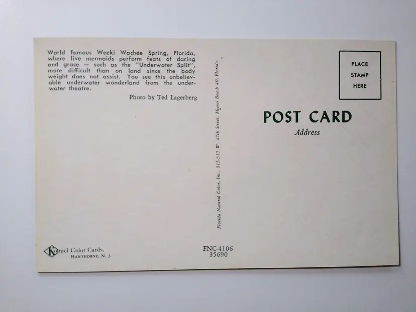 Number of Items in Set: 1 Unit of Sale: Single Unit Artist: Unknown Occasion: Sayings & Quotes Size: Standard (5.5 x 3.5 in) Signed: No Custom Bundle: No Year Manufactured: 1955 Material: Paper City: Weeki Wachee Original/Licensed Reprint: Original Franchise: Does Not Apply Brand/Publisher: Koppel Subject: Weekie Wachee Mermaids Continent: North America Type: Printed (Lithograph) Era: Photochrome (1939-Now) Region: Florida Country: USA Theme: Cities & Towns, Community Life, Events, Exhibitions, Famous Places, Greetings, Landscapes, People, Tourism, Shows, Mermaids, Weeki Wachee Mermaids, Underwater Features: Chrome, Divided Back Time Period Manufactured: 1950-1959 Country/Region of Manufacture: United States Postage Condition: Unposted
