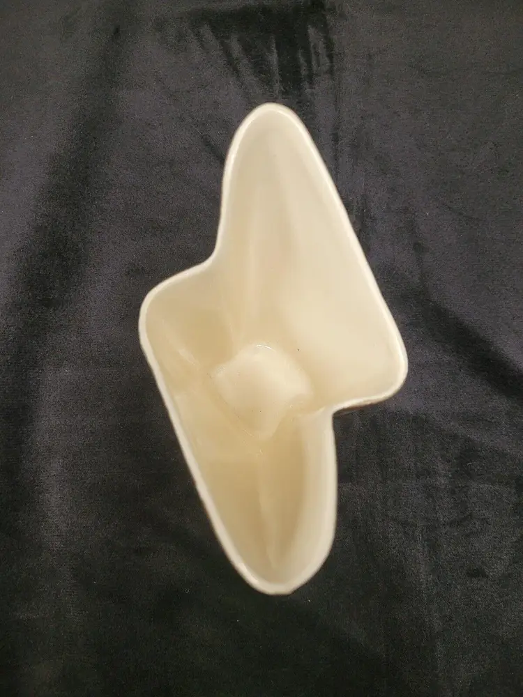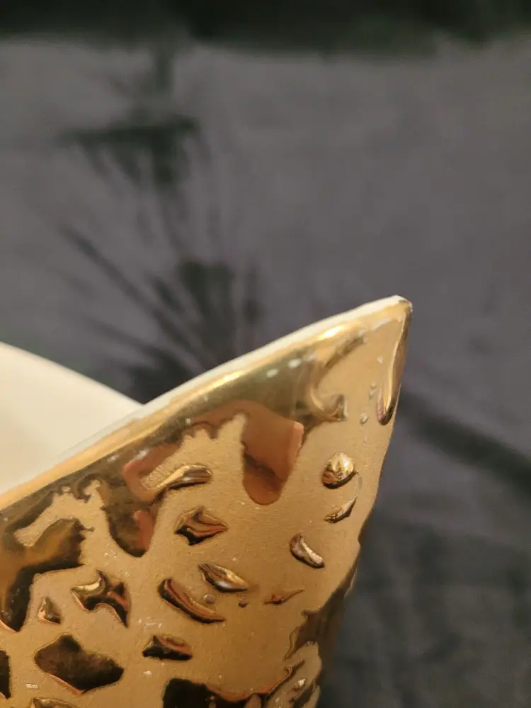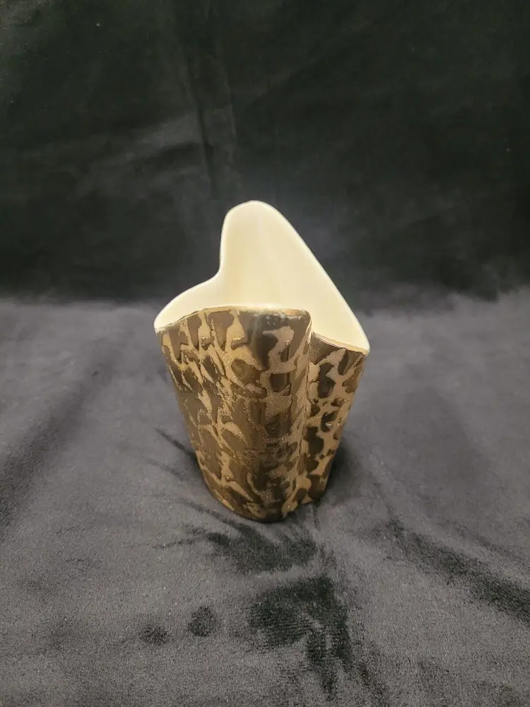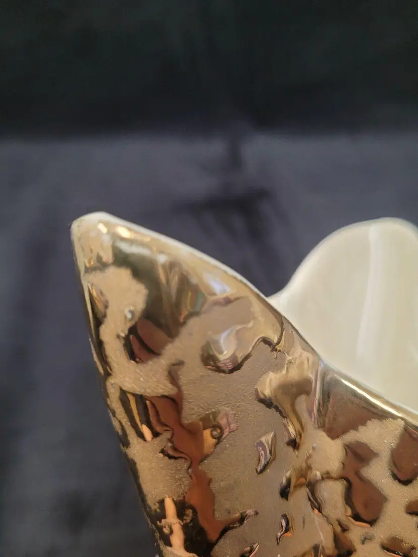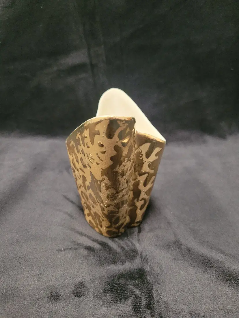 This beautiful art deco vase, with weeping gold on the outside and cream on the inside, would be perfect on a side table. 4 3/4" tall at its' highest point x 3 1/2" x 5". Some wear to the gold outside and stamped on the bottom 24 KT Gold and Made in the USA