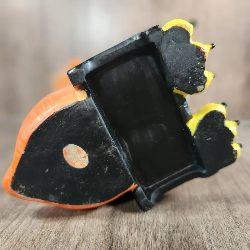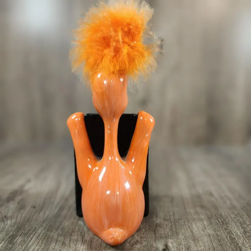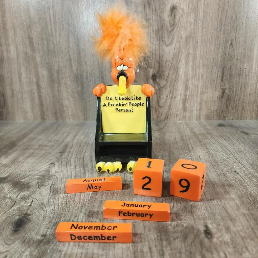 Does he look like a freakin' people person? Orange Weirdo with feather hair will help you keep track in the new year (and every year after) with his perpetual calendar. Blocks are all there to cover everyday of the year. There is a little paint chipping around the edges if you look close. The sticker is hard to read but it's still there. He measures approximately 8" tall including his hair.