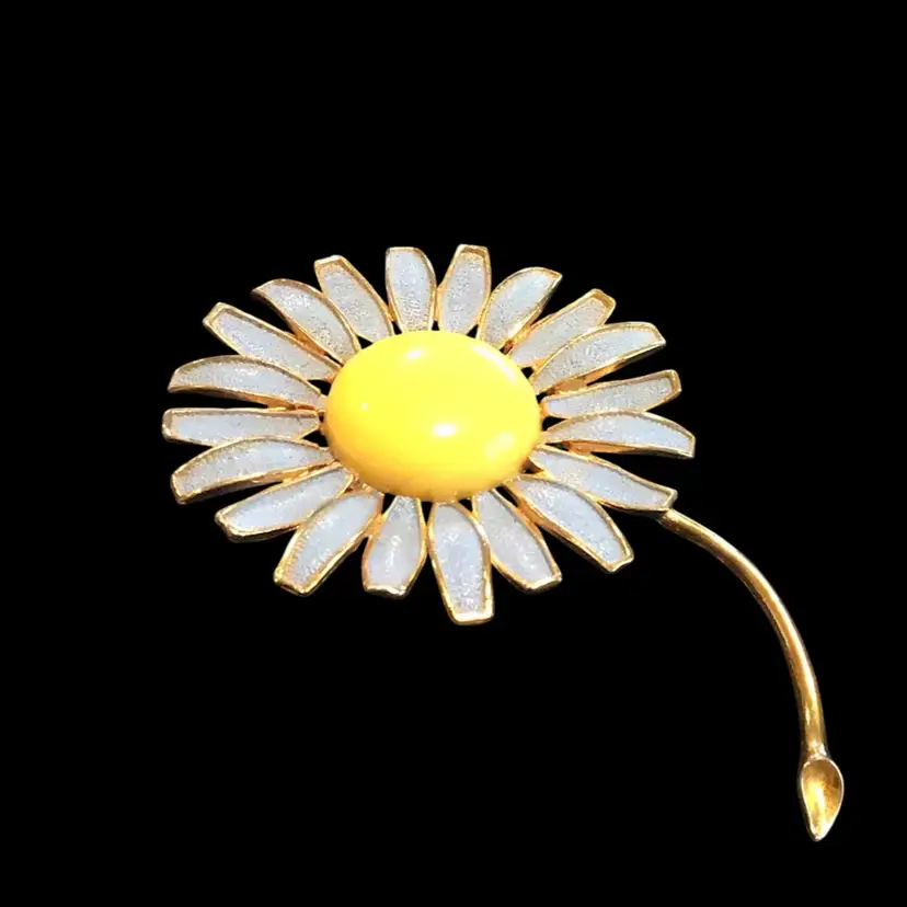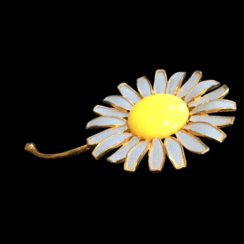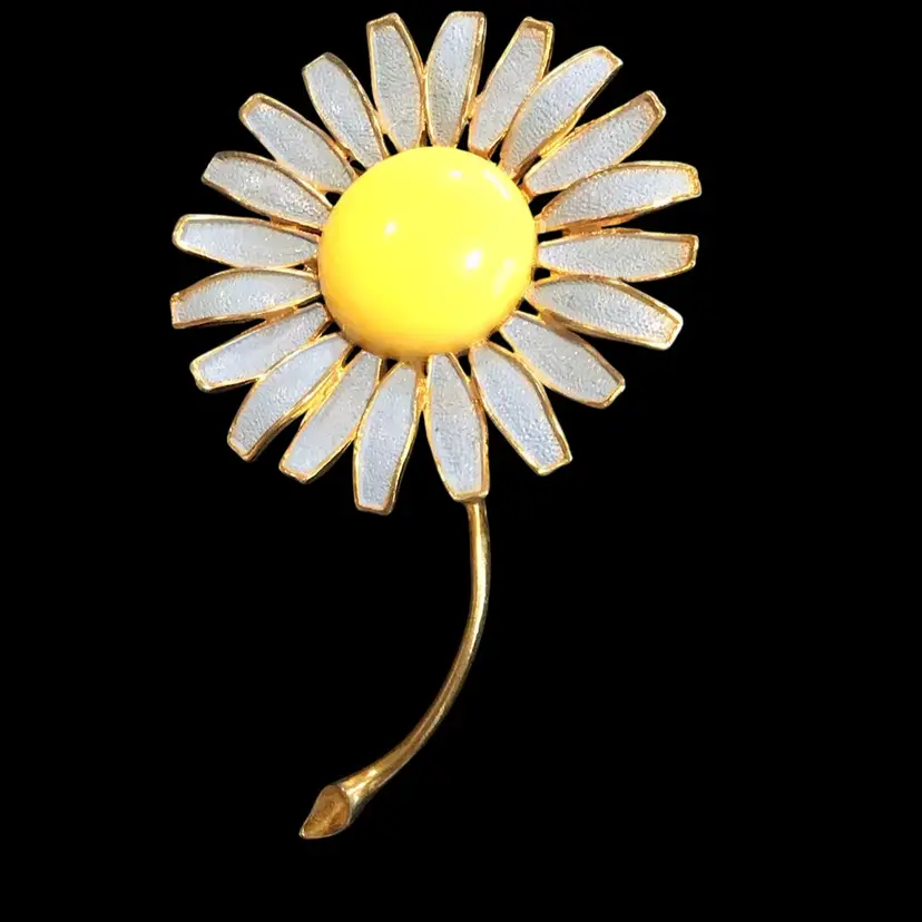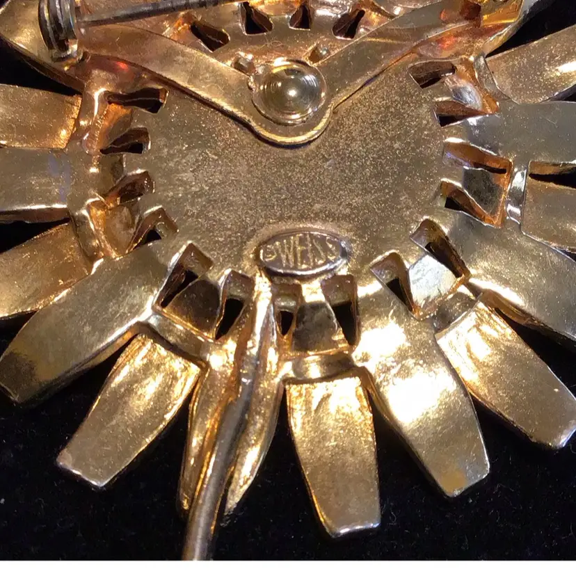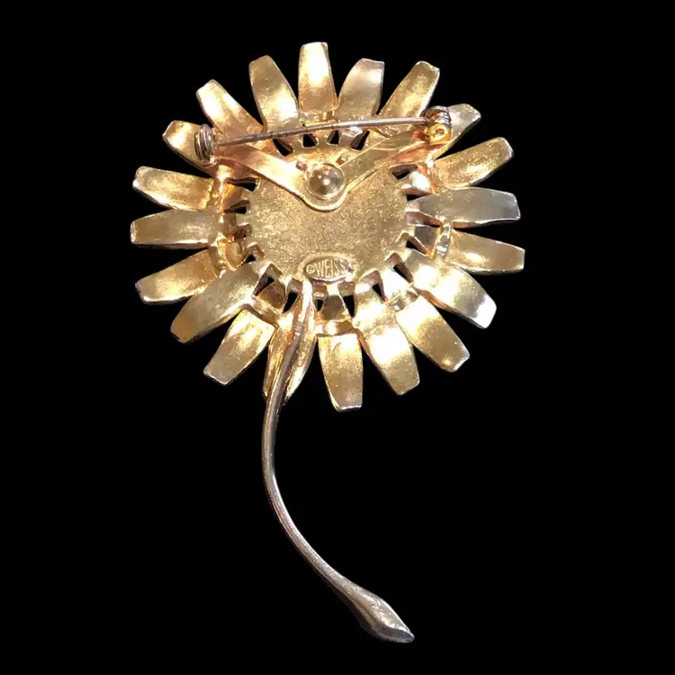 Albert Weiss blue & yellow flower power with gold tone stem 1960s, 3-1/2”x 2-1/4”. #400
