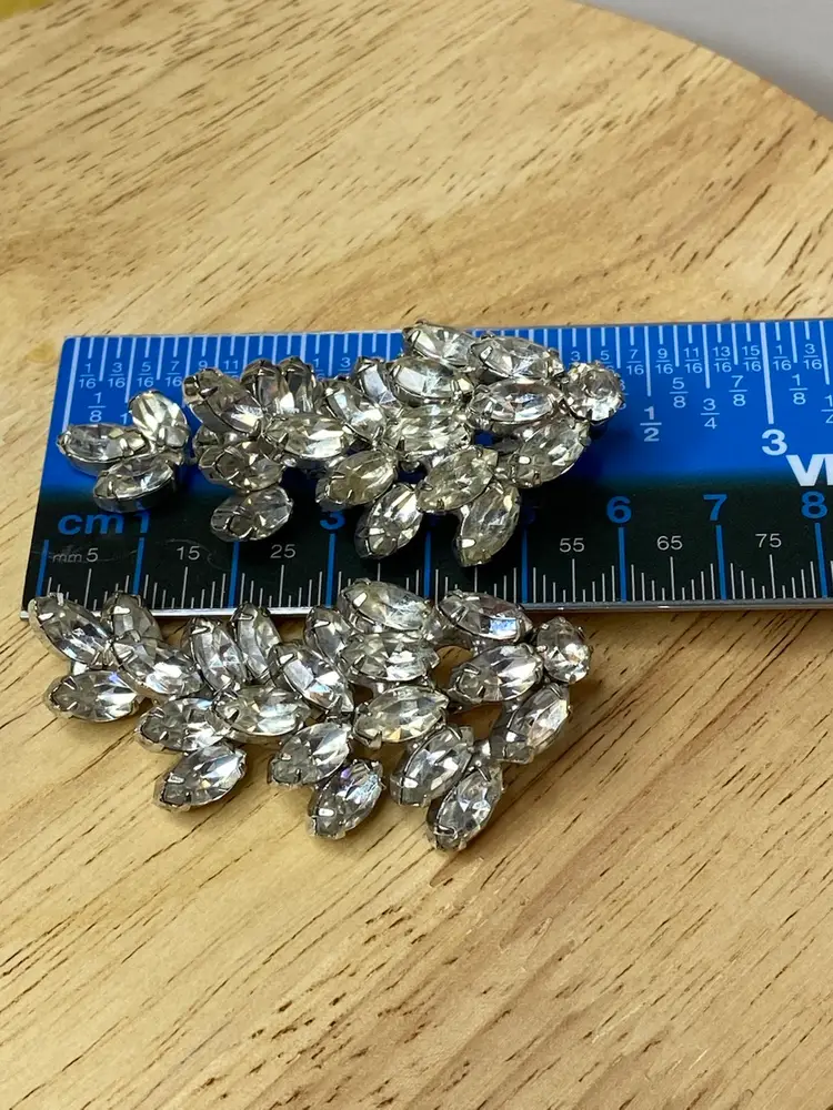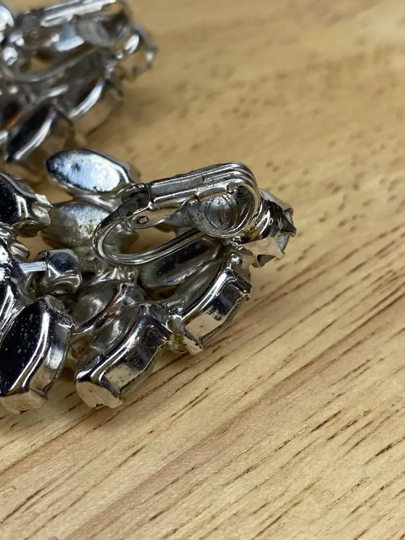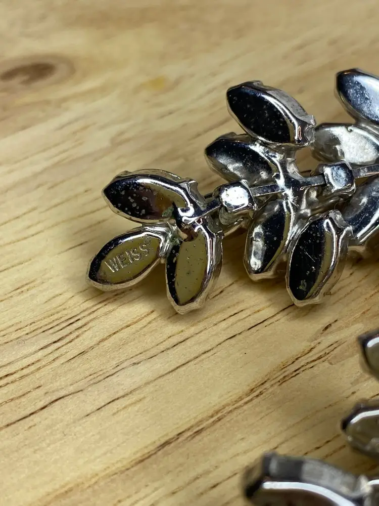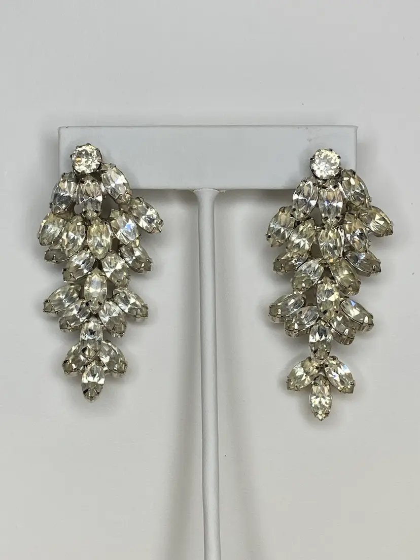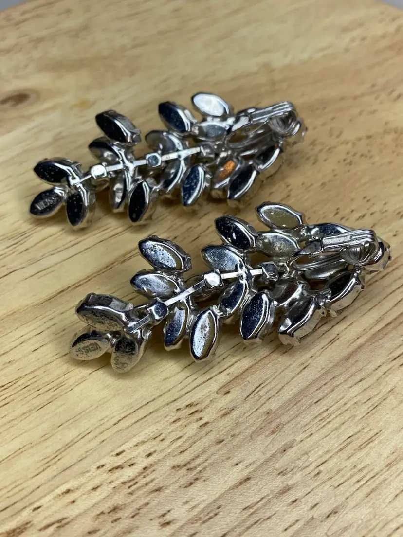 Add a touch of vintage glamour to your outfit with these beautiful clip-on earrings from WEISS. The clear rhinestone chandelier design is perfect for adding a statement to any ensemble, and the silver tone metal gives them a timeless appeal. These earrings are signed on the very bottom of each earring. The earrings are ideal for those who love vintage and antique jewelry, and the clear color of the stones makes them a versatile addition to any collection.