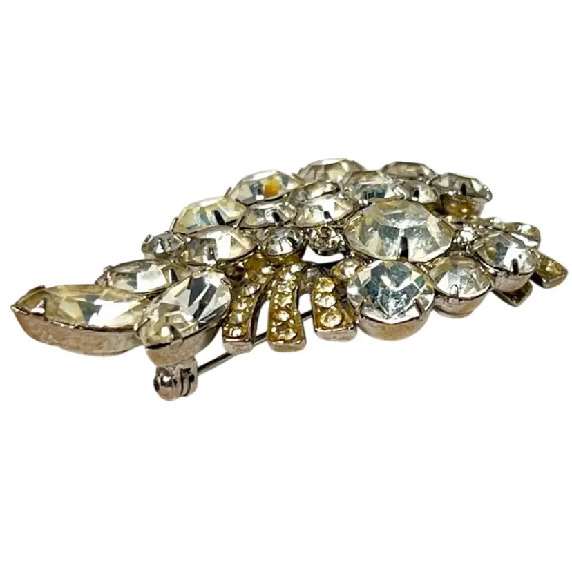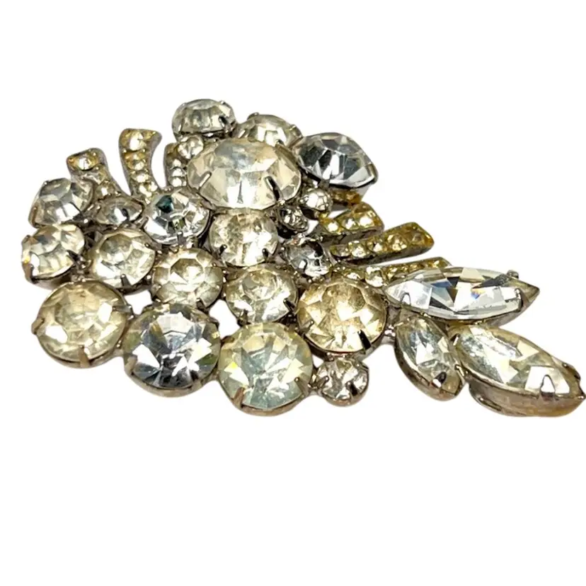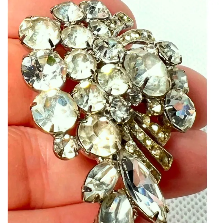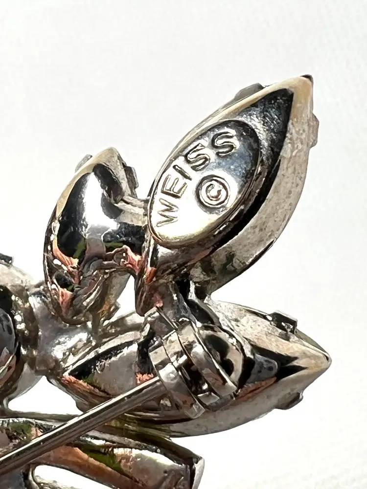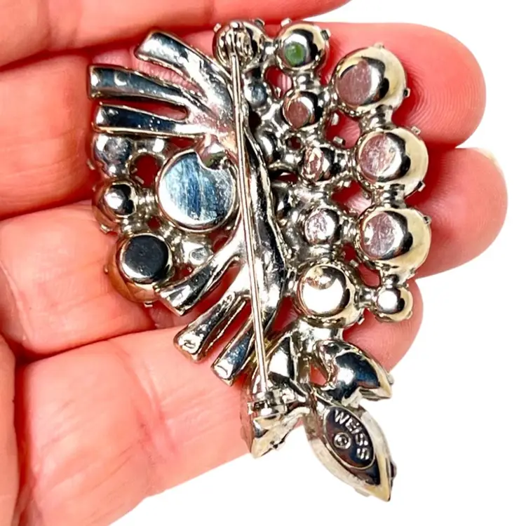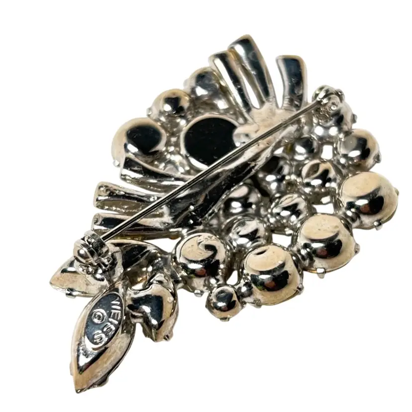 Weiss Grape π Cluster Design. Rhinestone Vintage Brooch. Very Nice Mid-Century Costume Jewelry. Silver-tone metal. Marked βWeissβ on Back. 2-1/8β x 1-1/4β x 3/8β. Condition: No issues. Prongs intact.