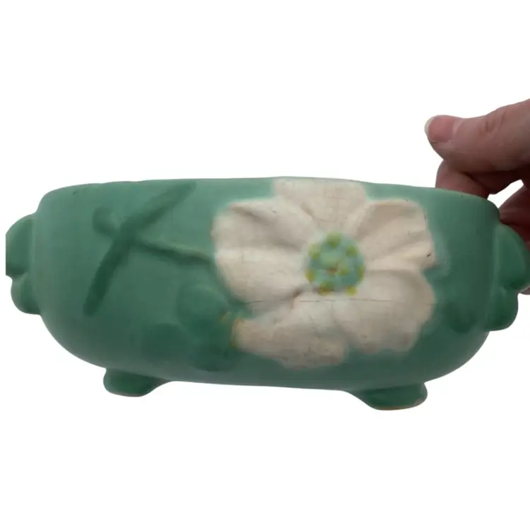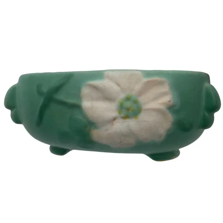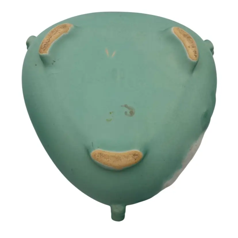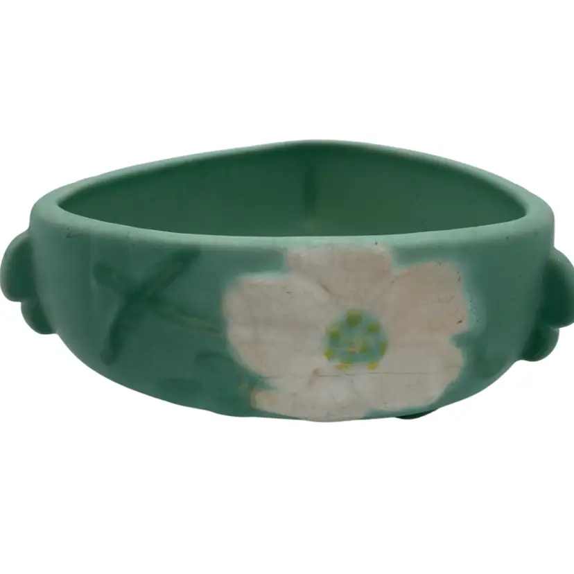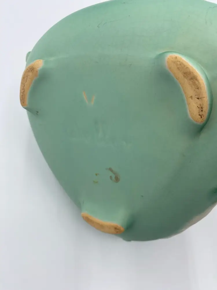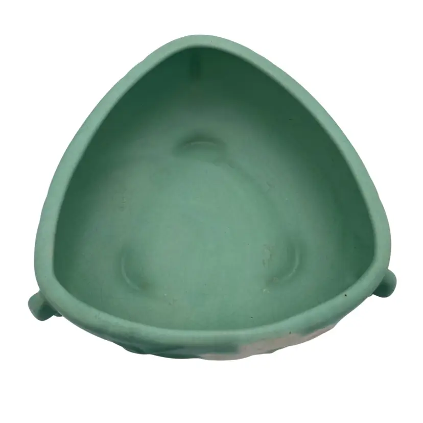 Enhance your vintage pottery collection with this Weller Wild Rose ceramic bowl/planter from the early 1930s. This stunning art deco piece features a beautiful mint matte green finish and a unique triangular shape with tab handles and footed base. The beautiful Wild Rose pattern with the Weller incised signature used from 1927-1932 makes it a harder to find piece. Measuring at 3 inches tall and 7.5 inches wide, this bowl is perfect for displaying your favorite flowers or as an elegant decorative piece.