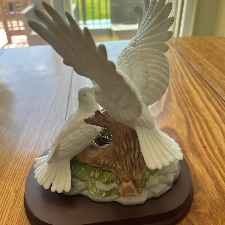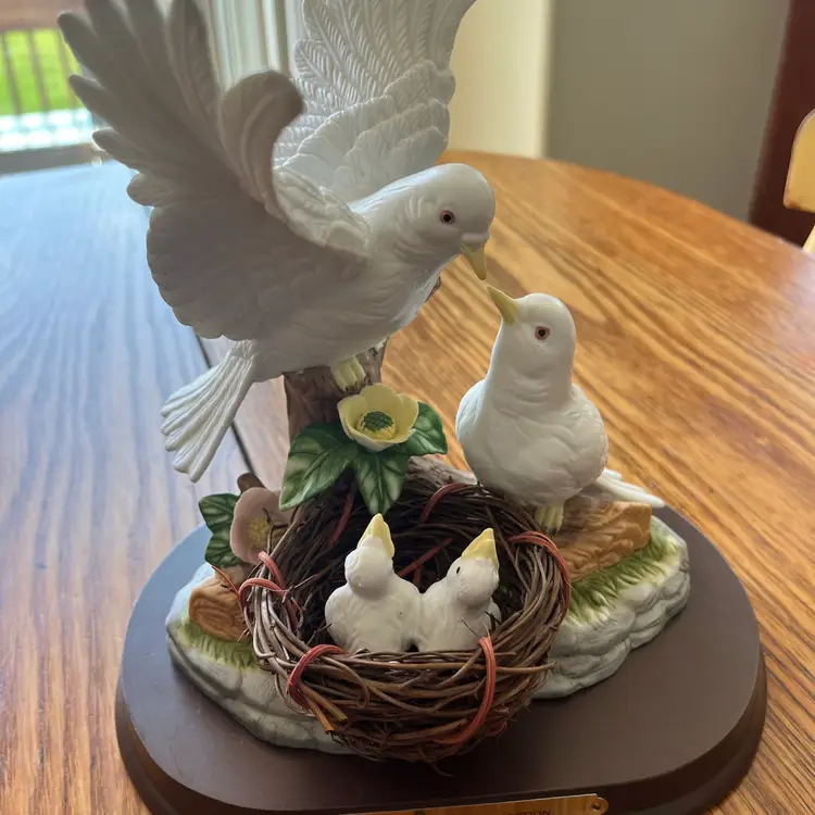 This particular piece depicts a family of birds, likely cockatoos, in a nest, symbolizing domesticity and new life. The use of porcelain allows for fine detail in the feathers and nest texture, while the wooden base adds a touch of elegance. Such figurines were commonly produced from the late 20th century onwards, reflecting a trend in collectible home furnishings.