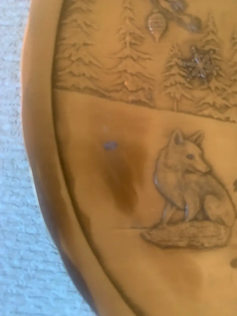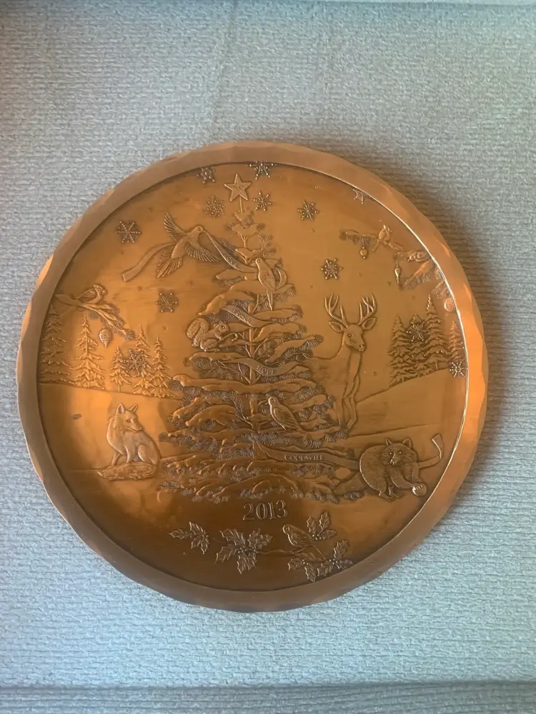 Wendell August Forge 2013 bronze Christmas plate. It is good condition with what may be a small flaw near the fox. It is 7 3/4 inches in diameter.