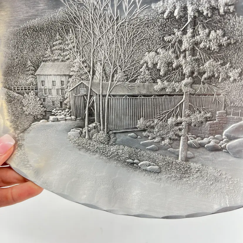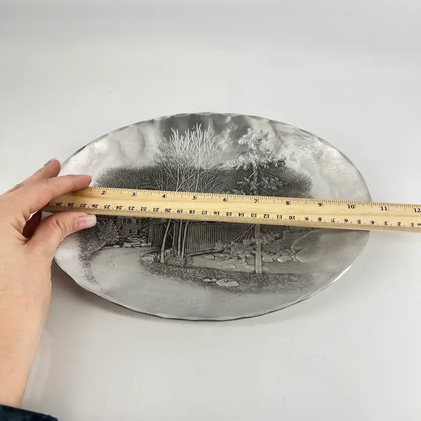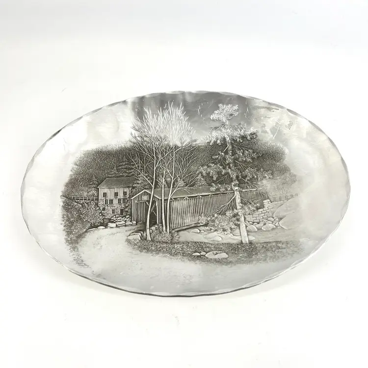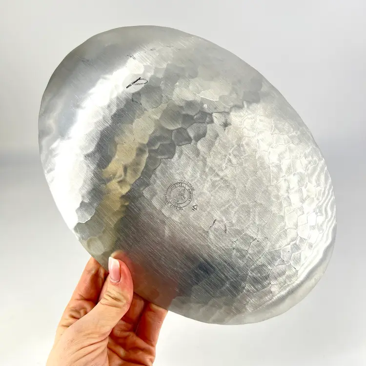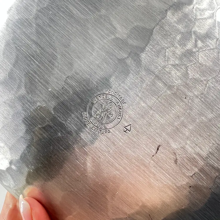 This dish is attributed to Wendell August Forge. It is cast aluminum. It measures approx 10.5” long. There is scratching.