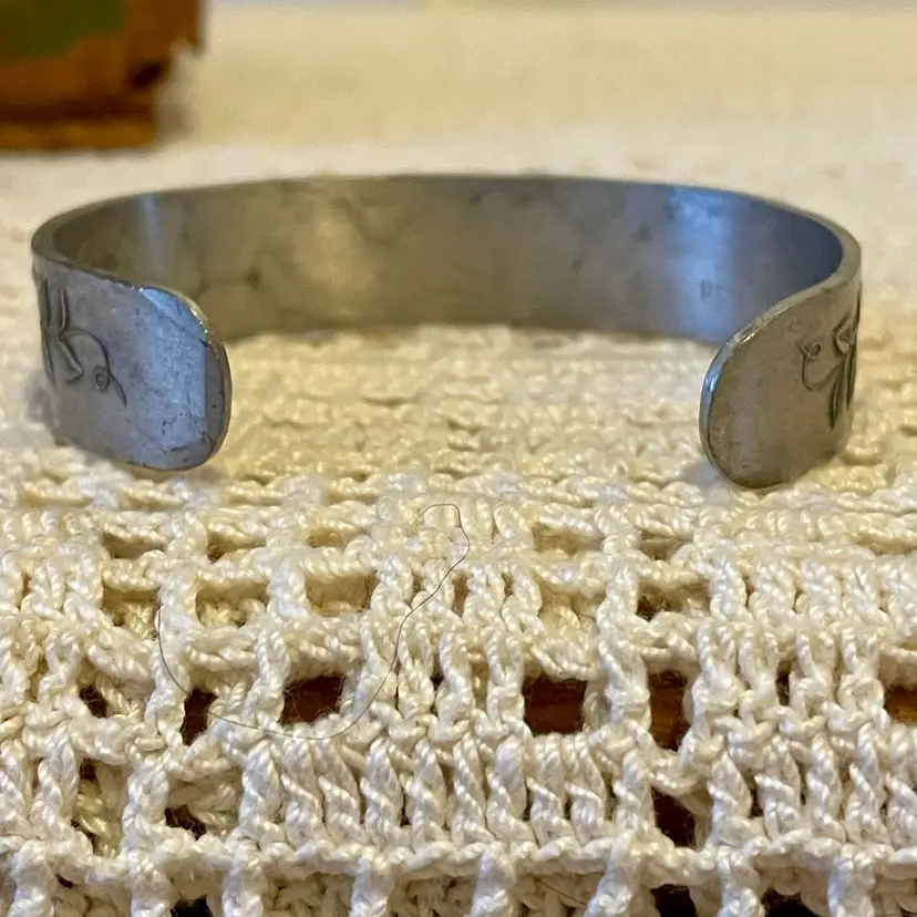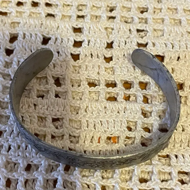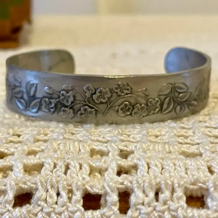 Good condition Pewter with a floral motif Has some minor patina Has the Wendell August Forge hallmark Adjustable 1/4” wide 0000225